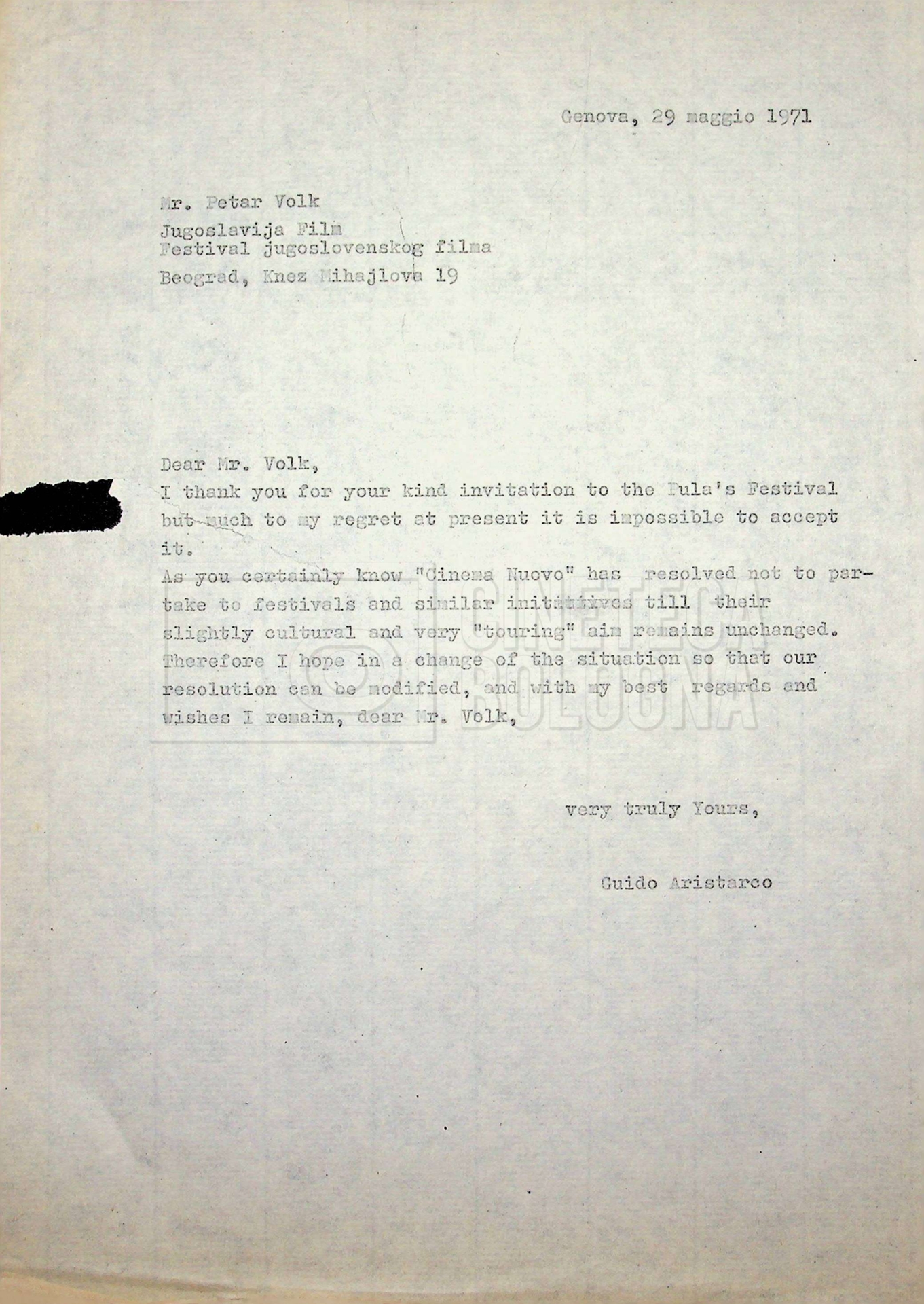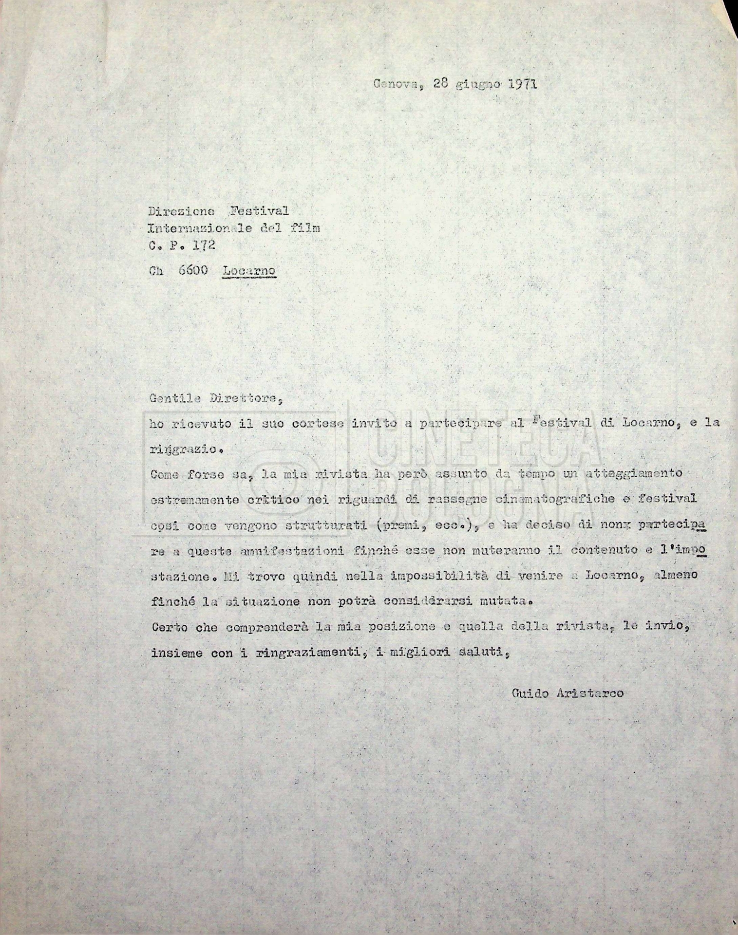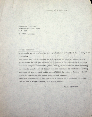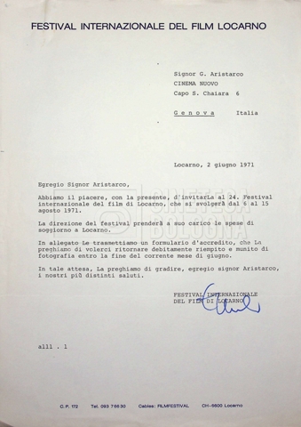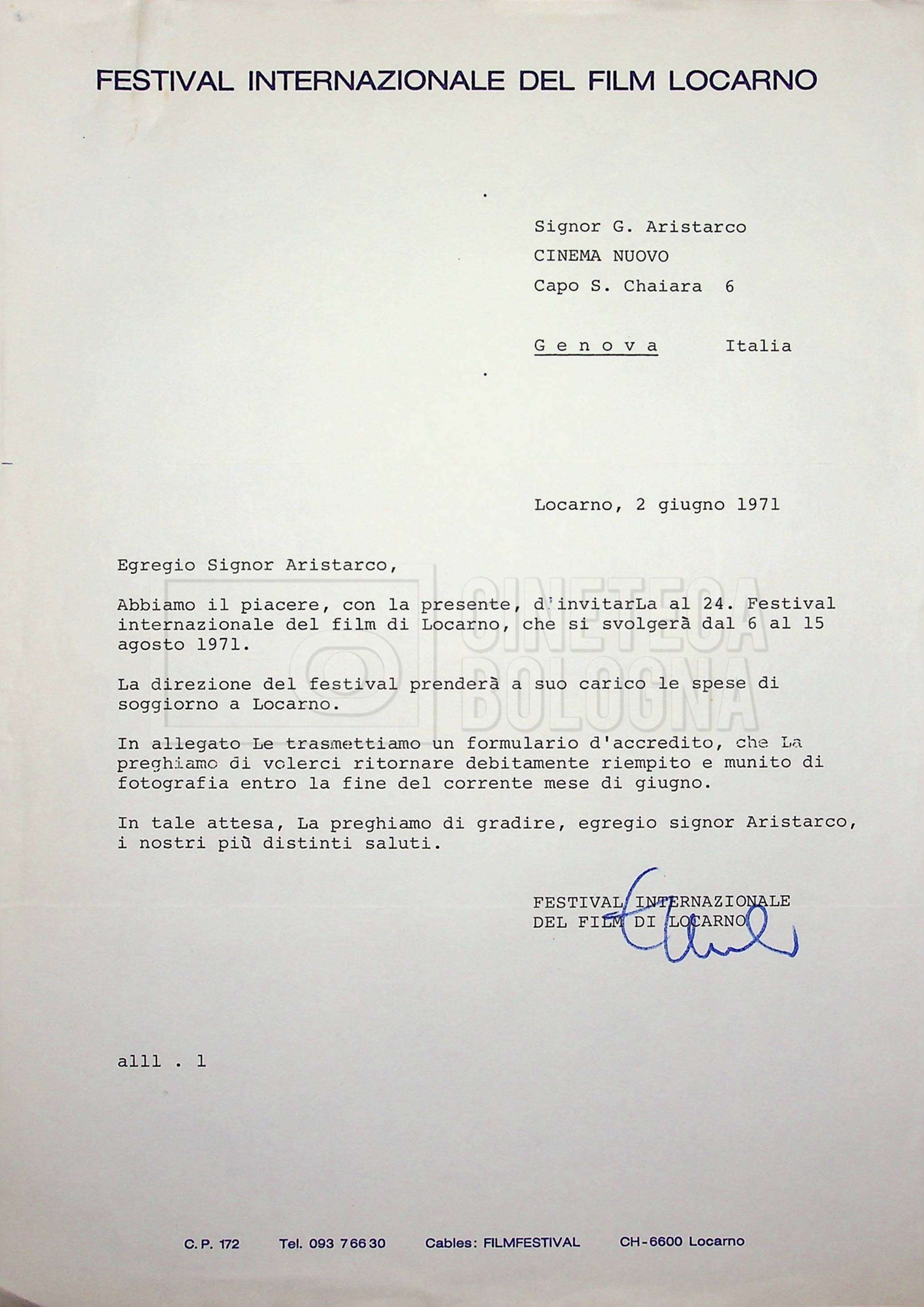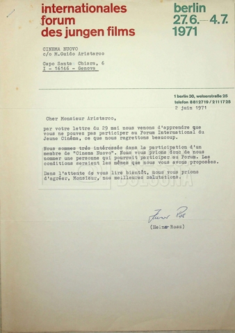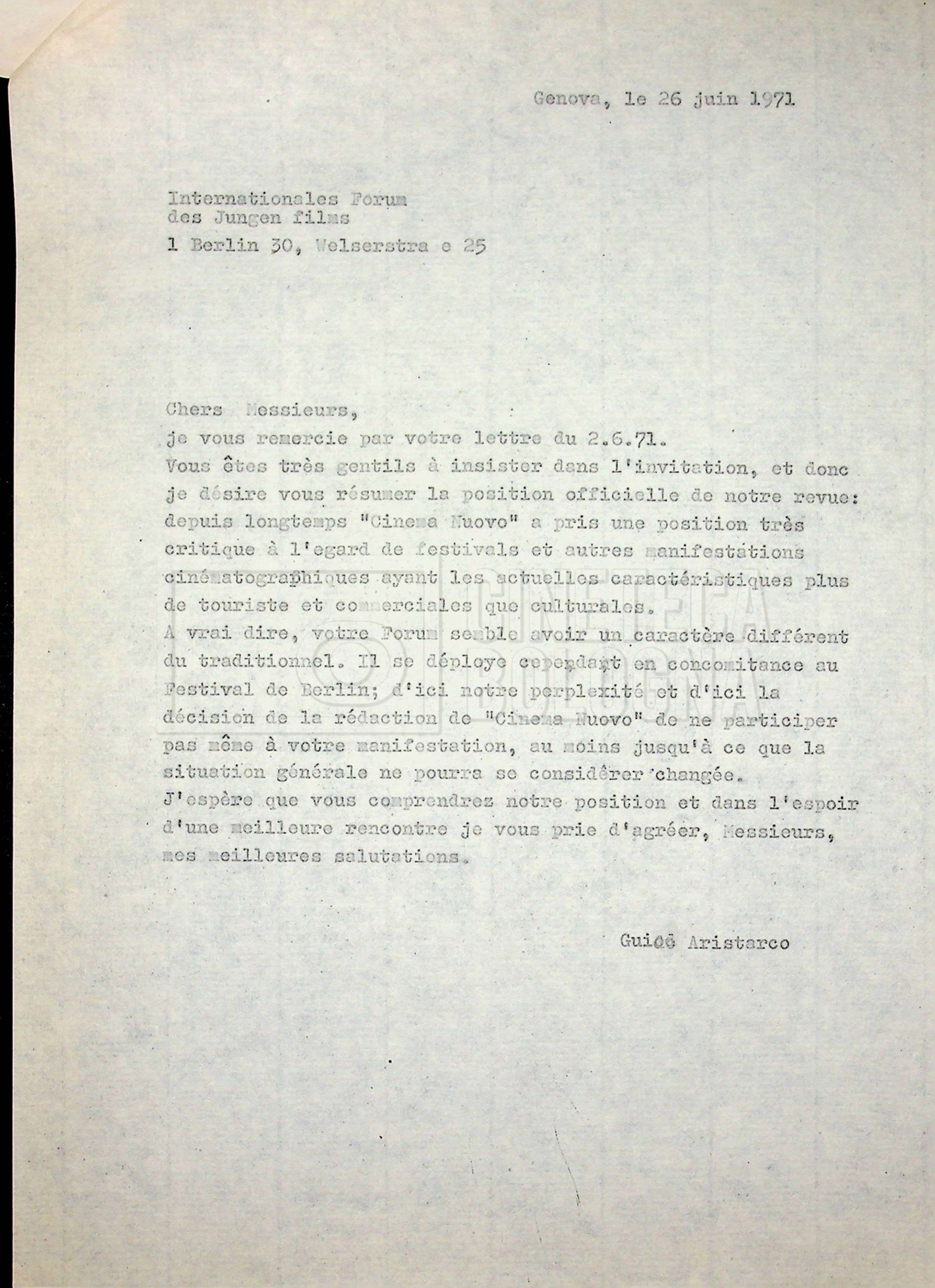 – Una lettera in francese da parte del “Internationales Forum des Jungen Film” di Berlino inviata a Guido Aristarco per invitarlo all’edizione del 1971;