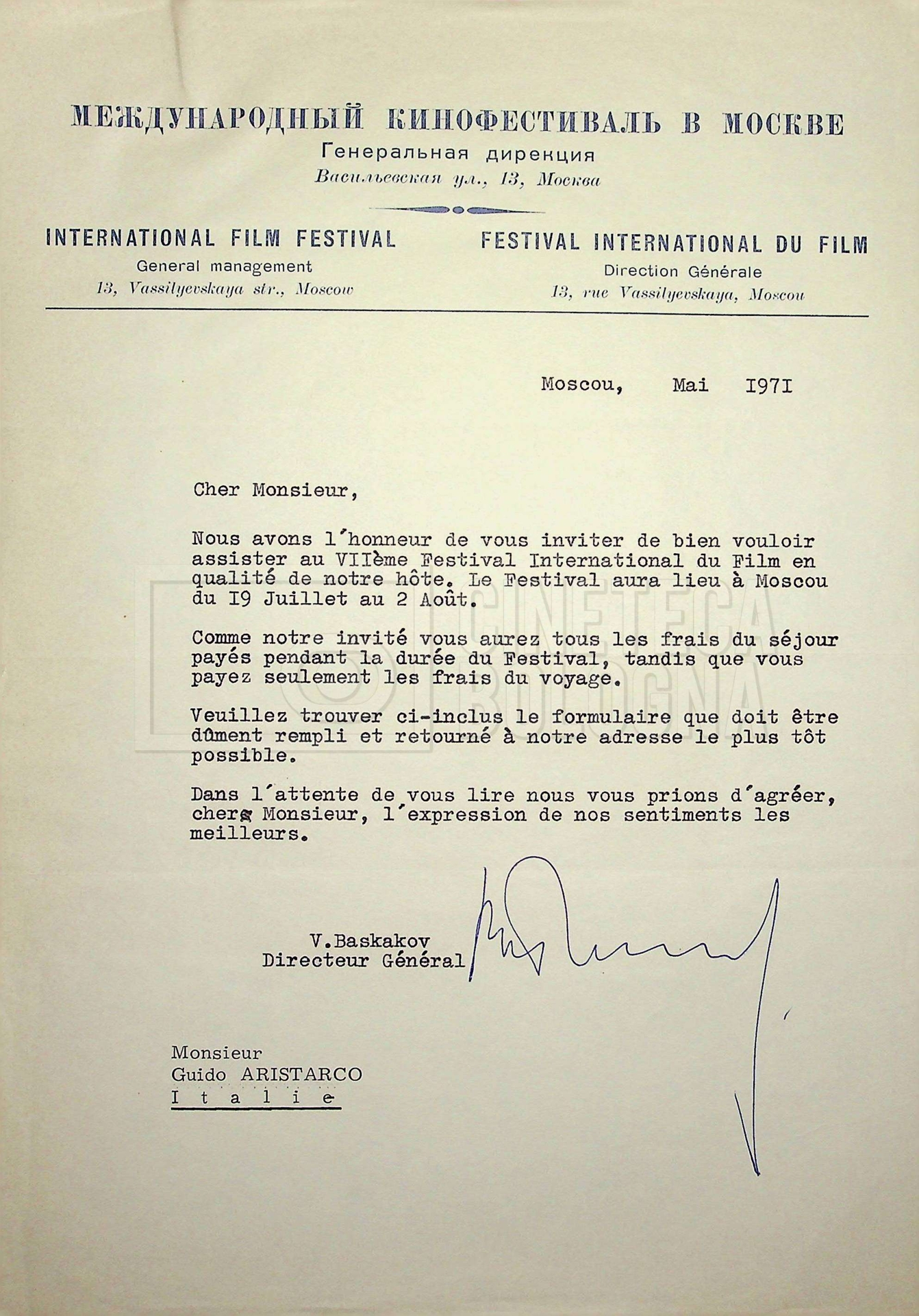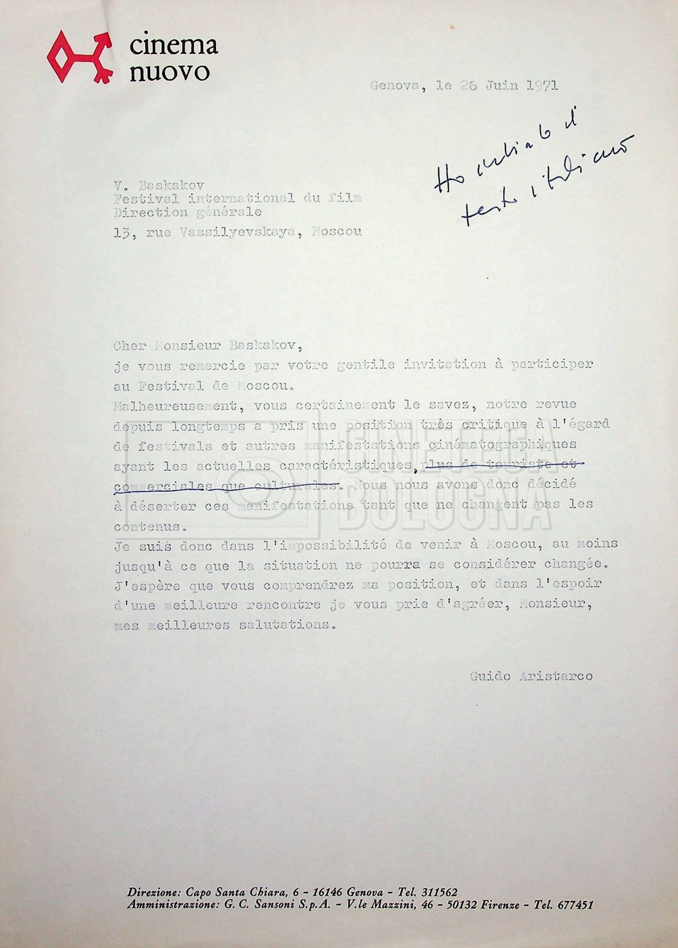 – Una lettera in francese del “Festival Internazionale del Film di Mosca” inviata a Guido Aristarco per invitarlo al festival (maggio 1971); a cui segue la minuta della risposta di Guido Aristarco con declinazione dell’invito (26 giugno 1971);