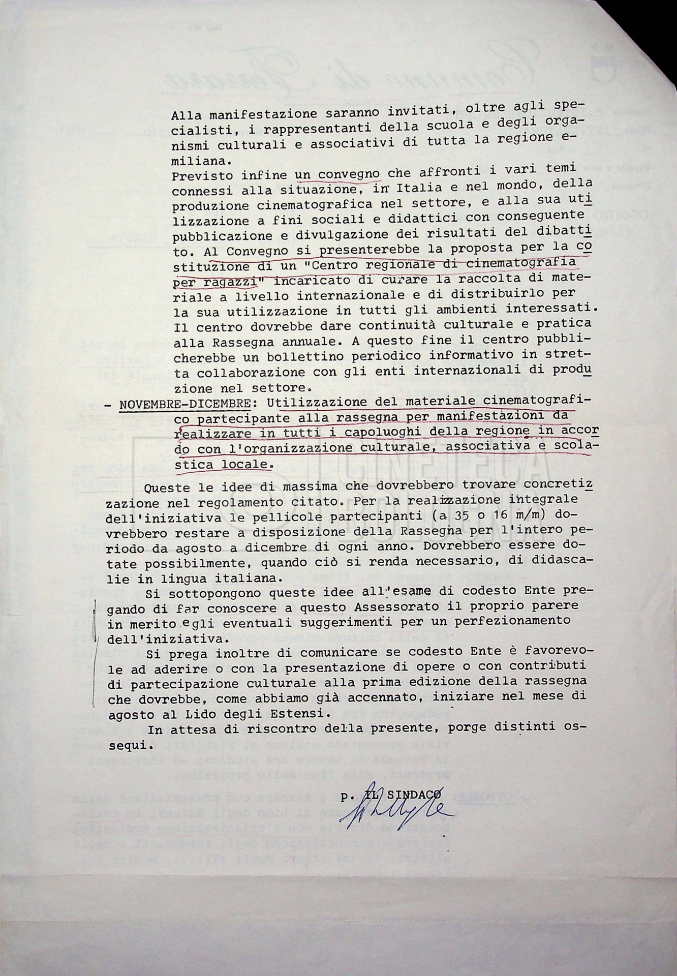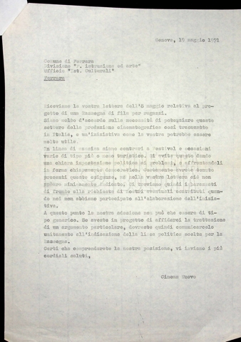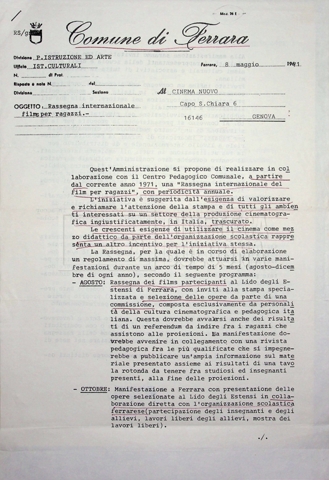 – Una lettera del Comune di Ferrara inviata alla redazione di “Cinema Nuovo” per collaborare alla realizzazione di una “Rassegna internazionale del film per ragazzi” (8 maggio 1971); a cui segue la minuta della risposta di “Cinema Nuovo” nella quale si spiega la scelta politica di non aderire ad iniziative simili (19 maggio 1971);