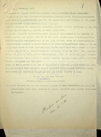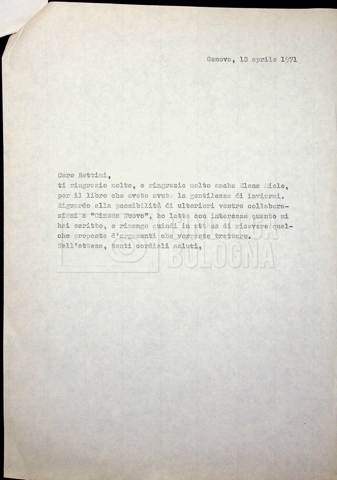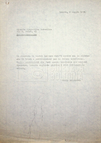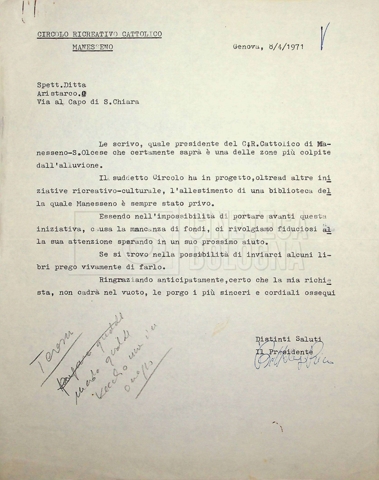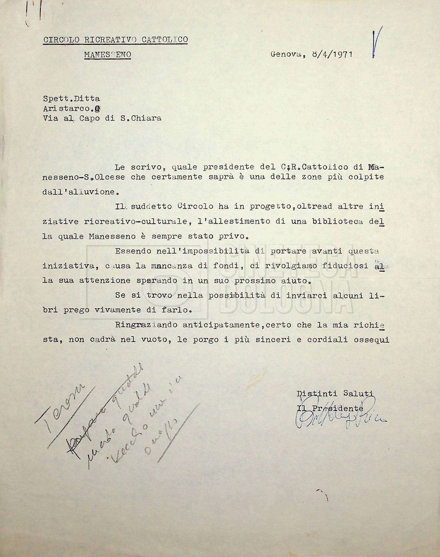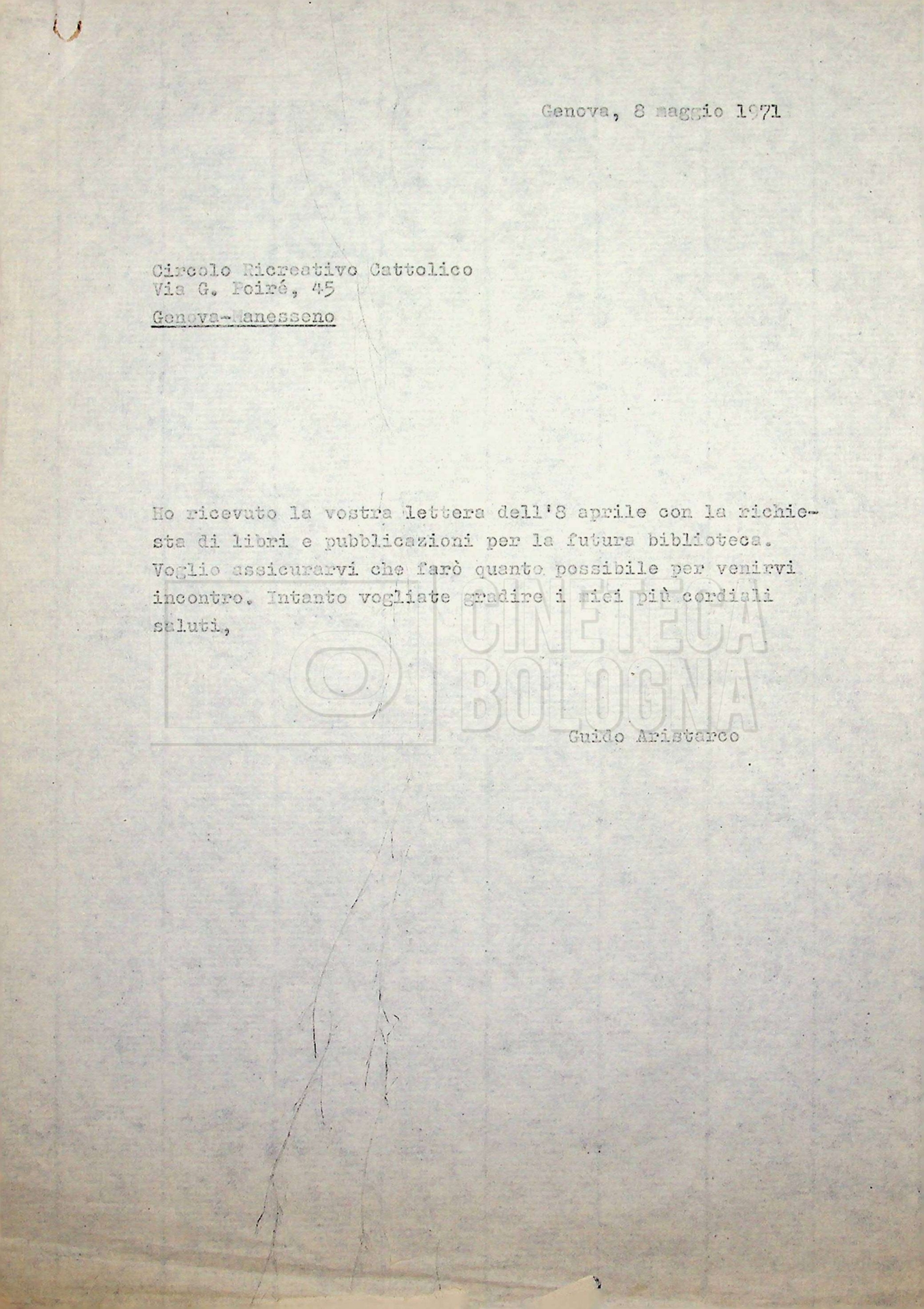 – Una lettera del “Circolo Ricreativo Cattolico Manesseno” di Genova inviata a Guido Aristarco per richiedere libri a causa della mancanza di fondi e dei disagi provocati dall’alluvione (8 aprile 1971); a cui segue la minuta della risposta di Guido Aristarco (8 maggio 1971);