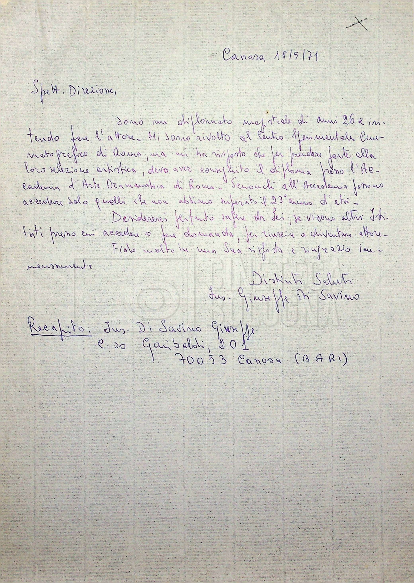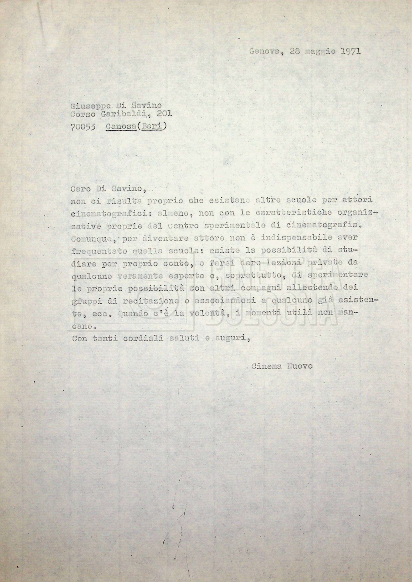 – Una lettera ms. del ventiseienne Giuseppe di Savino inviata alla direzione di “Cinema Nuovo” per chiedere consigli sulla possibilità di intraprendere la carriera di attore (18 maggio 1971), a cui segue la minuta della risposta di “Cinema Nuovo” (28 maggio 1971);