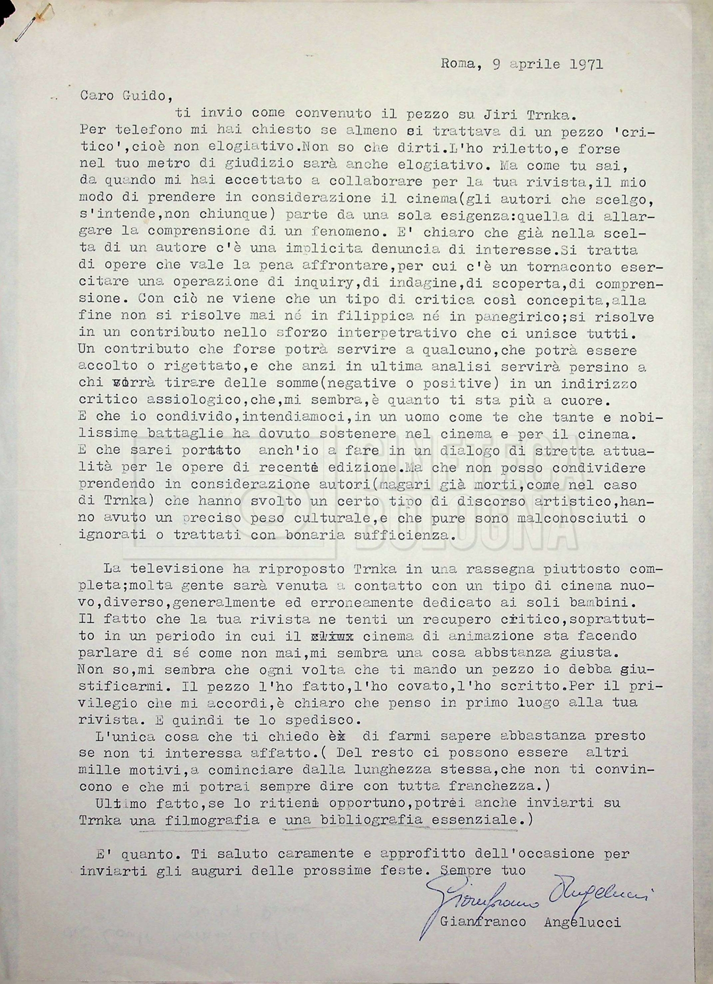 – Una lettera di Gianfranco Angelucci inviata a Guido Aristarco relativa all’invio di un proprio scritto su Jiri Trnka (9 aprile 1971); a cui segue la minuta della risposta di Guido Aristarco (2 maggio 1971);