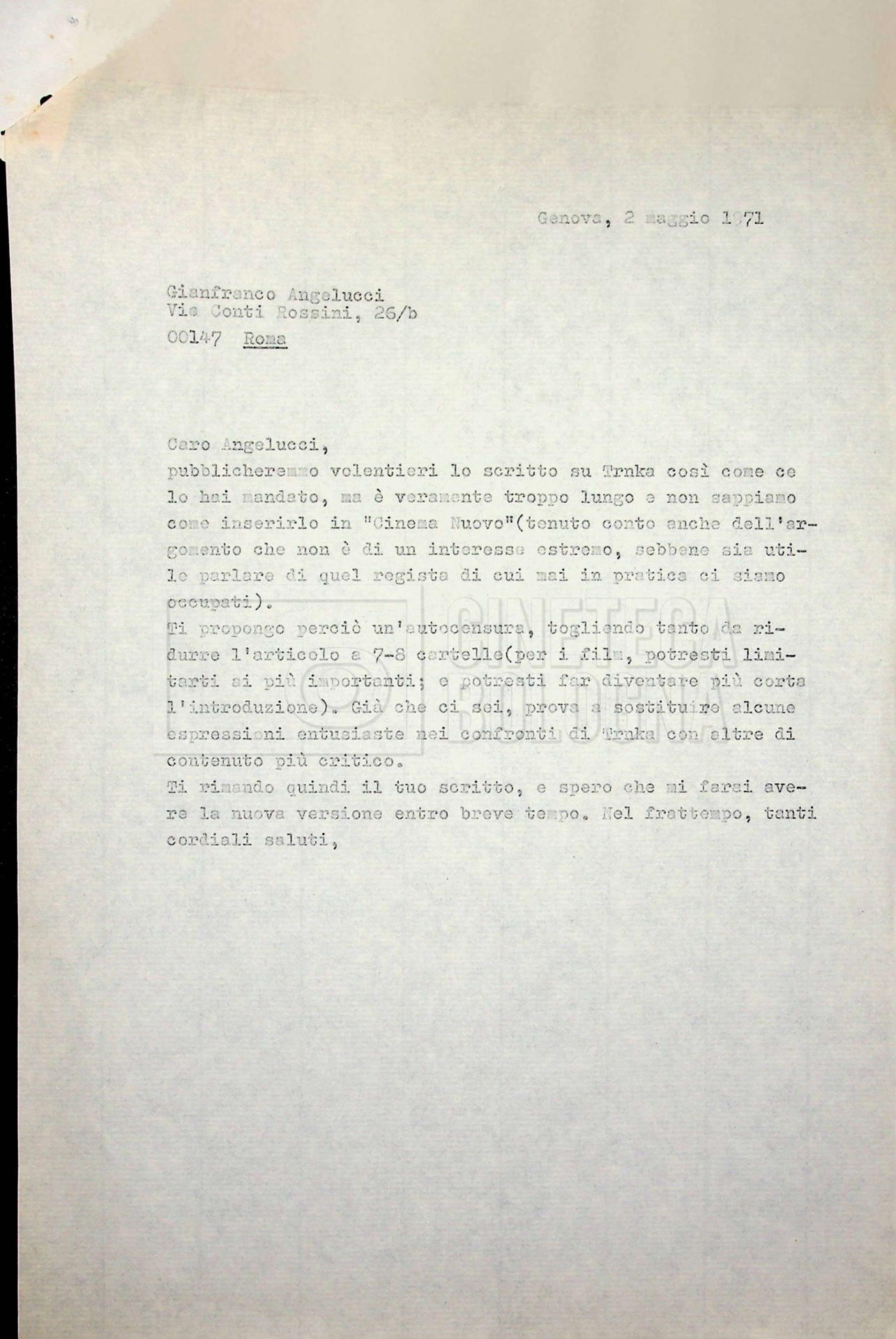 – Una lettera di Gianfranco Angelucci inviata a Guido Aristarco per l’invio di uno scritto e per informarlo della distribuzione di “Cinema Nuovo” a Roma (20 maggio 1971); a cui segue la minuta della risposta di Guido Aristarco (5 giugno 1971);