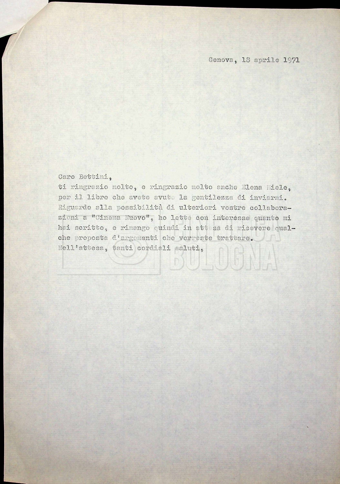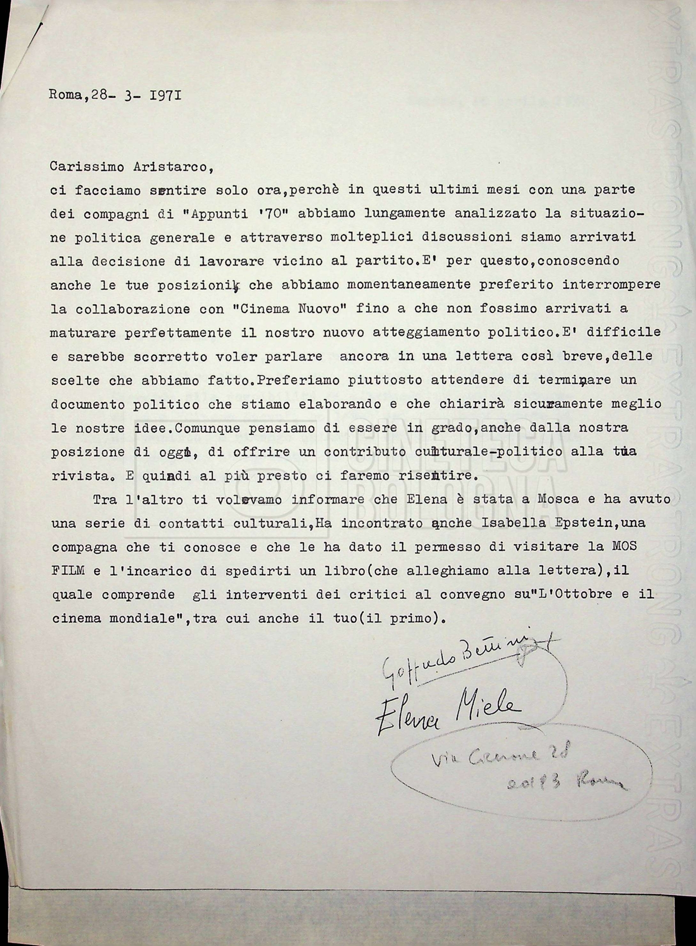 – Una lettera di Goffredo Bettini ed Elena Miele inviata a Guido Aristarco per chiarire la scelta di interrompere la collaborazione con la rivista “Cinema Nuovo” (28 marzo 1971), a cui segue la minuta della risposta di Guido Aristarco (18 aprile 1971);