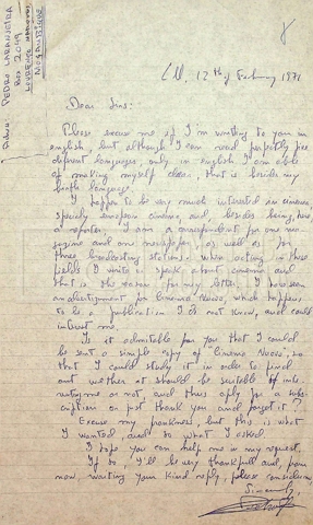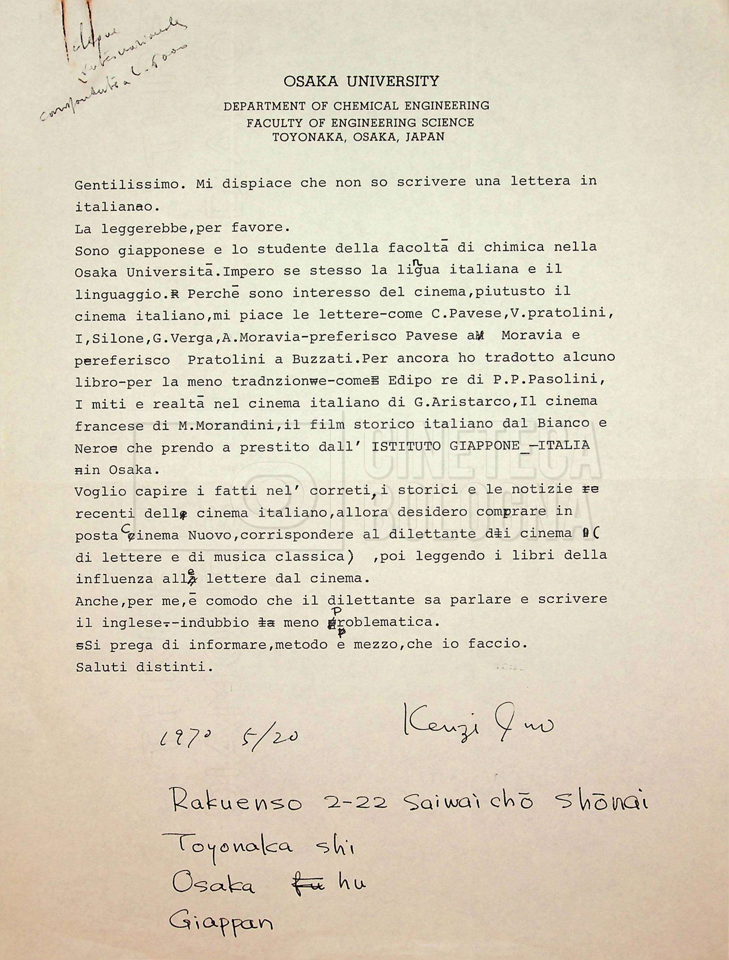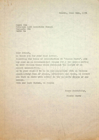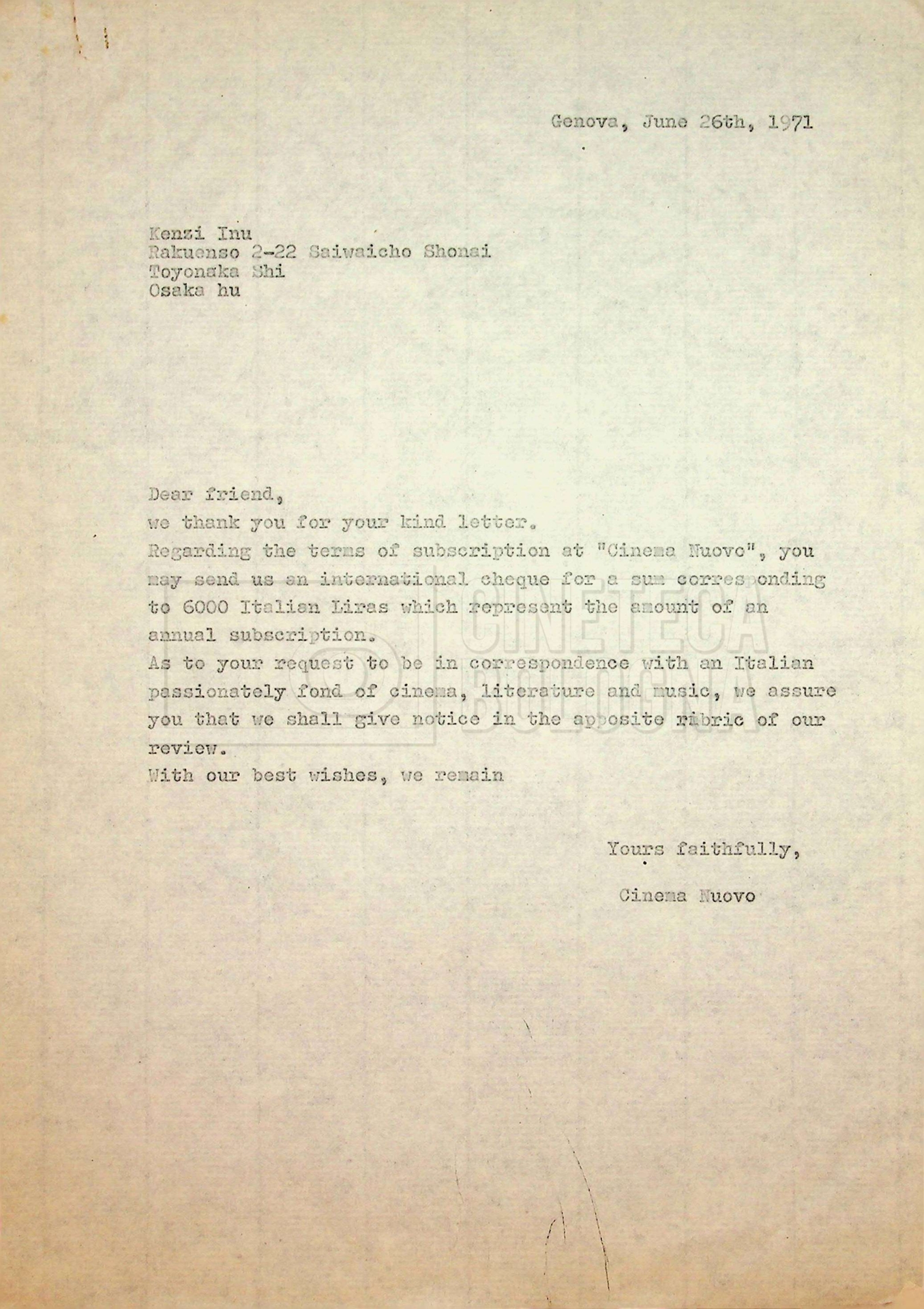 – Una lettera in italiano dello studente giapponese della Osaka University (Ōsaka daigaku 大阪大学) Kenji Inu inviata alla redazione di “Cinema Nuovo” per chiedere indicazioni varie sul cinema italiano e sull’abbonamento alla rivista; a cui segue la minuta della risposta di “Cinema Nuovo” in inglese (26 giugno 1971);