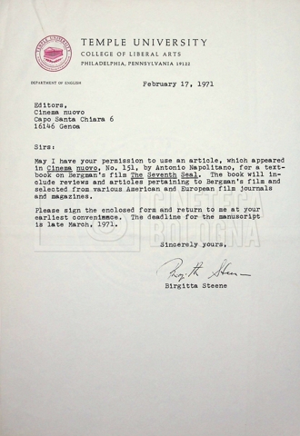 – Una lettera in inglese di Birgitta Steene, della “Temple University” di Philadelphia, inviata alla redazione della rivista “Cinema Nuovo” per chiedere la licenza di pubblicare un articolo in un libro dedicato a Ingmar Bergman (17 febbraio 1971); a cui segue la minuta della risposta di Guido Aristarco (13 marzo 1971);