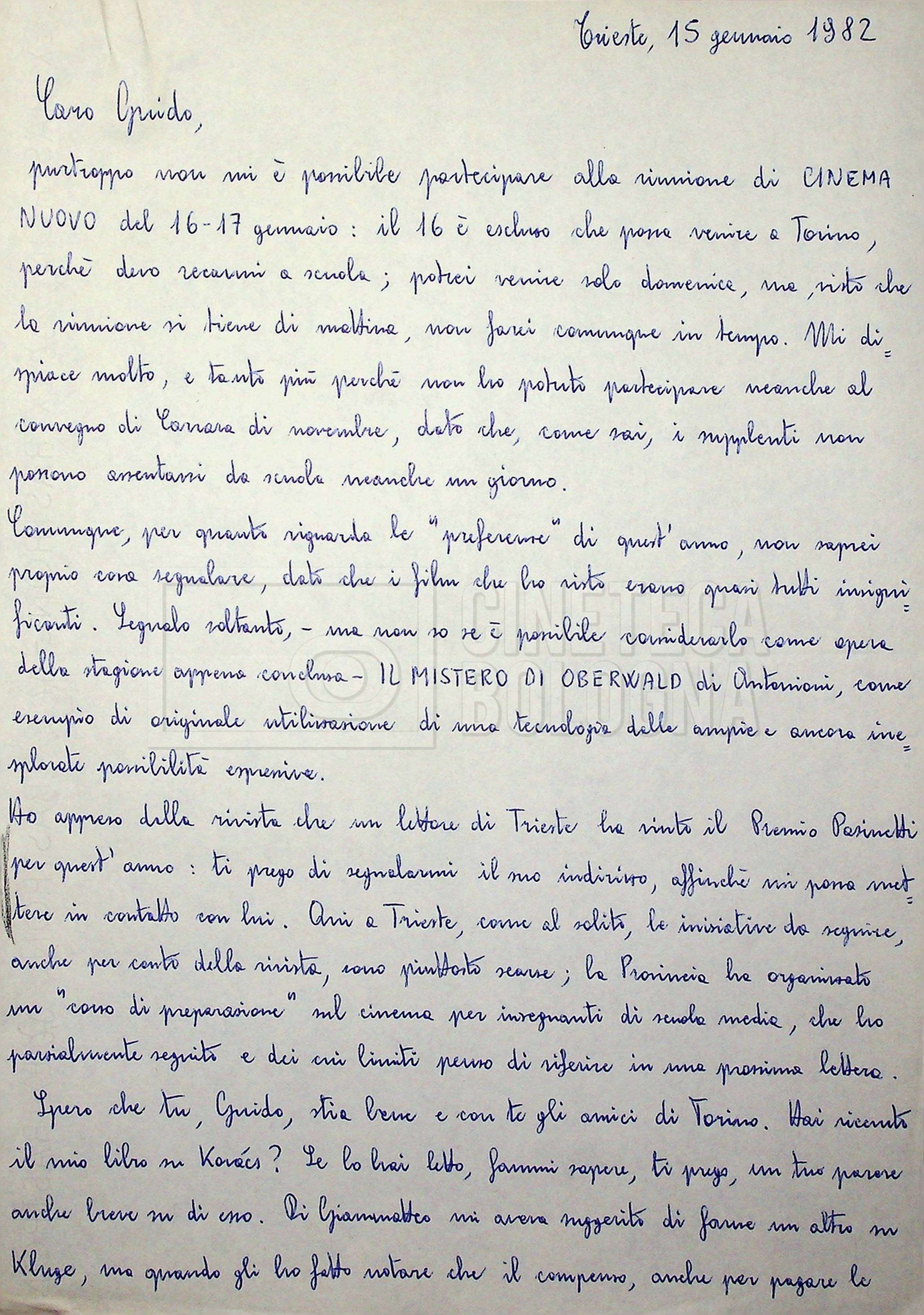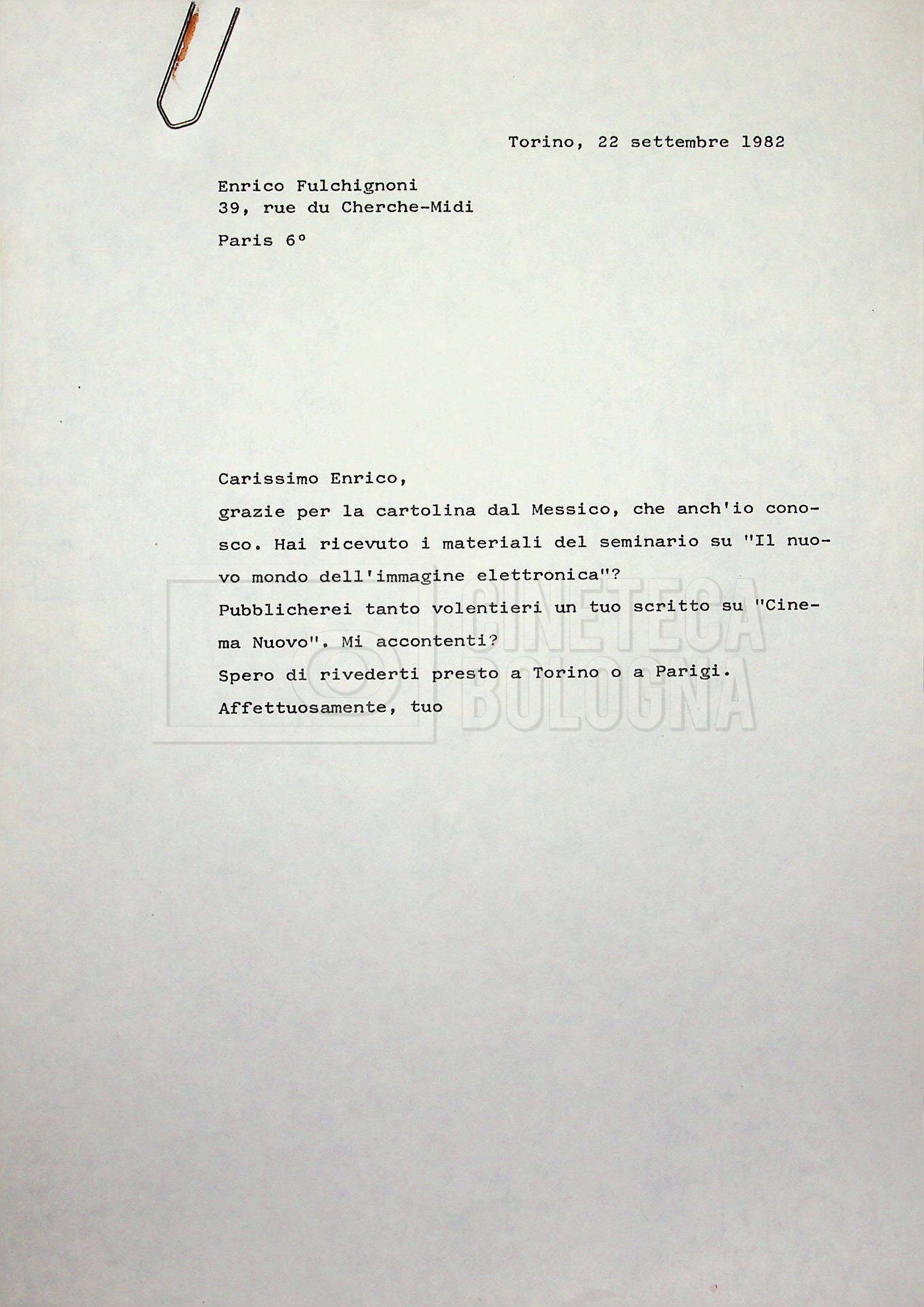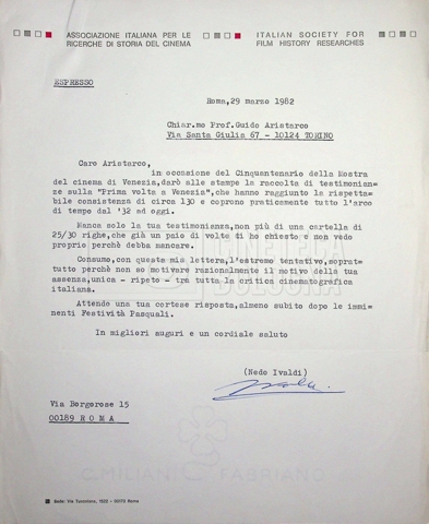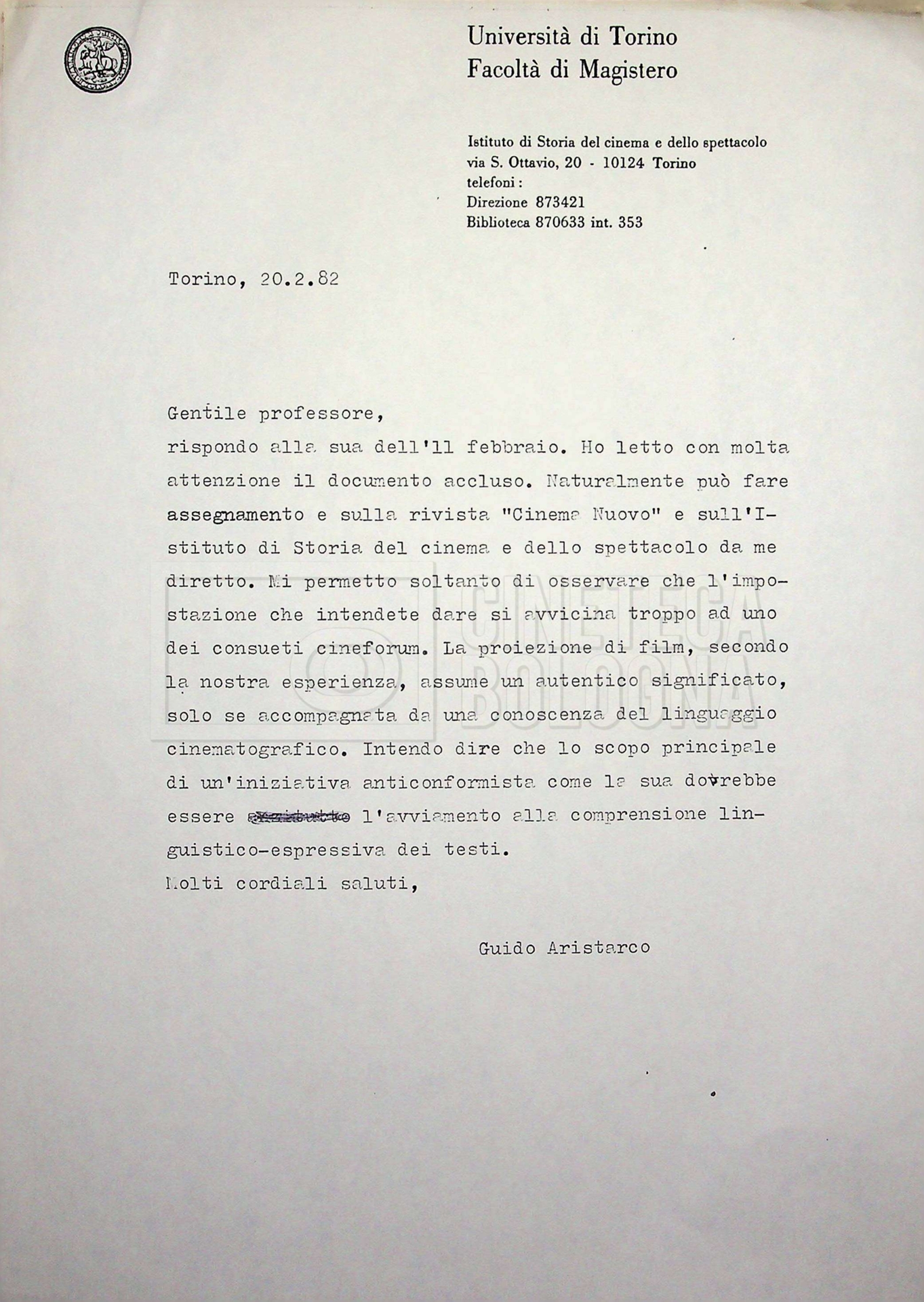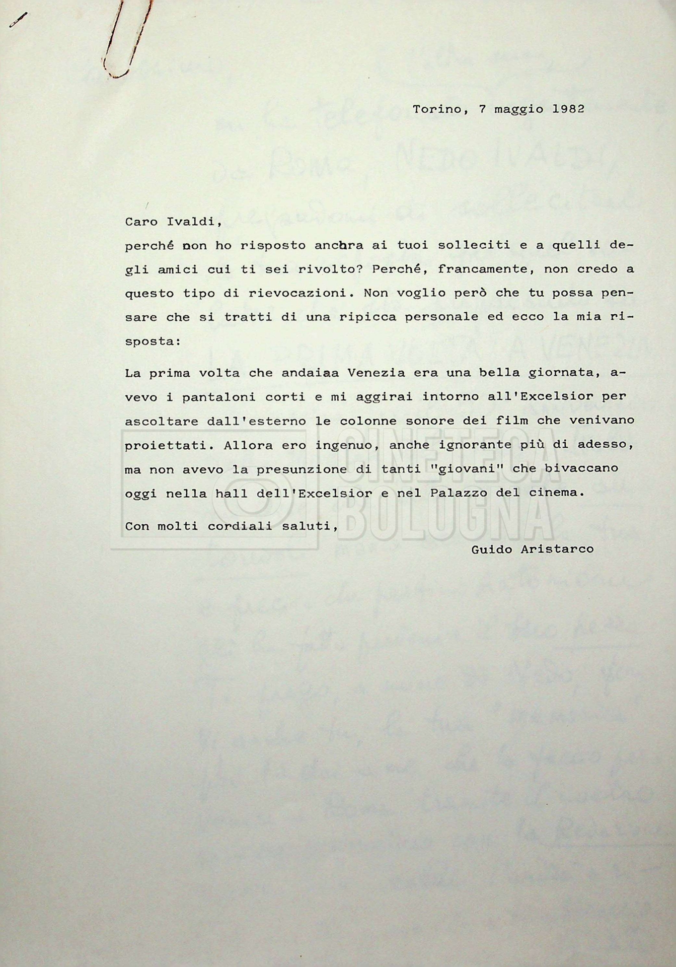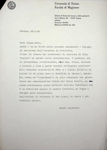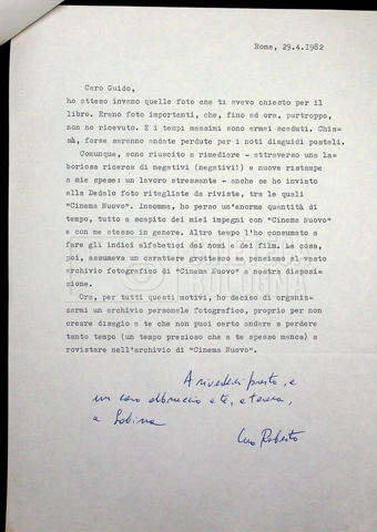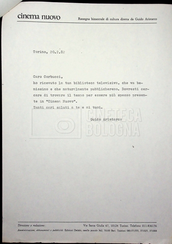 – La minuta di una lettera di Guido Aristarco inviata a Renzo Renzi e riguardante gli ultimi incontri relativi all’immagine elettronica svoltisi a Porretta Terme (1 dicembre 1982);