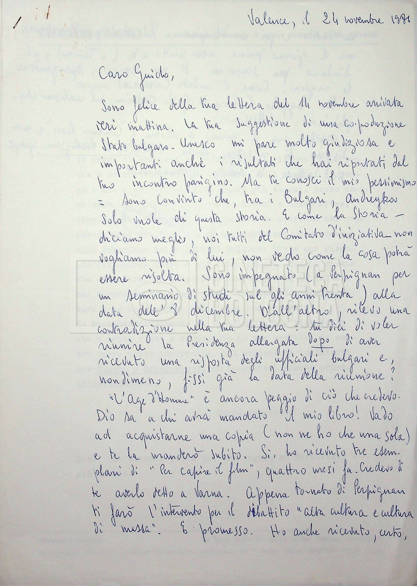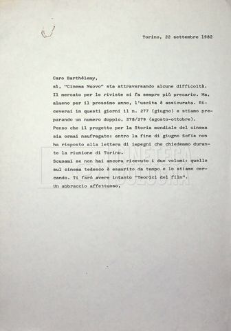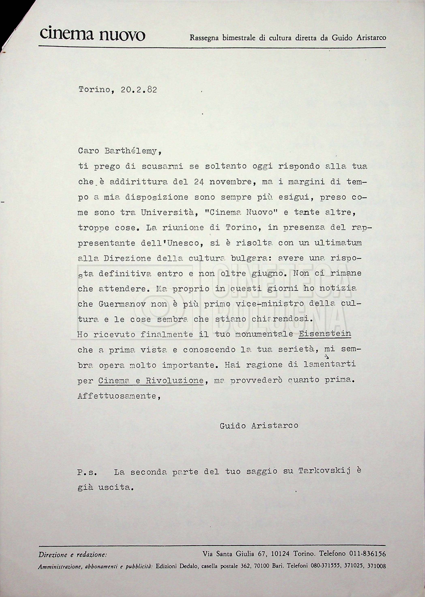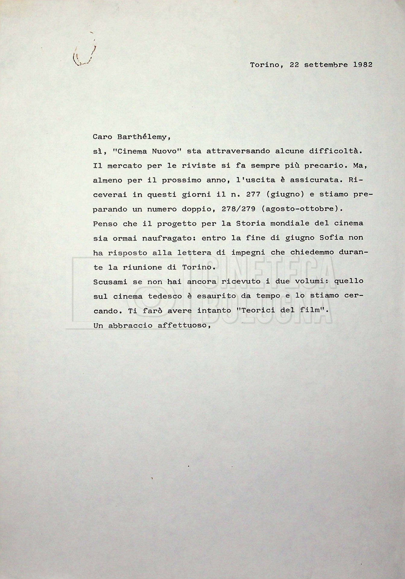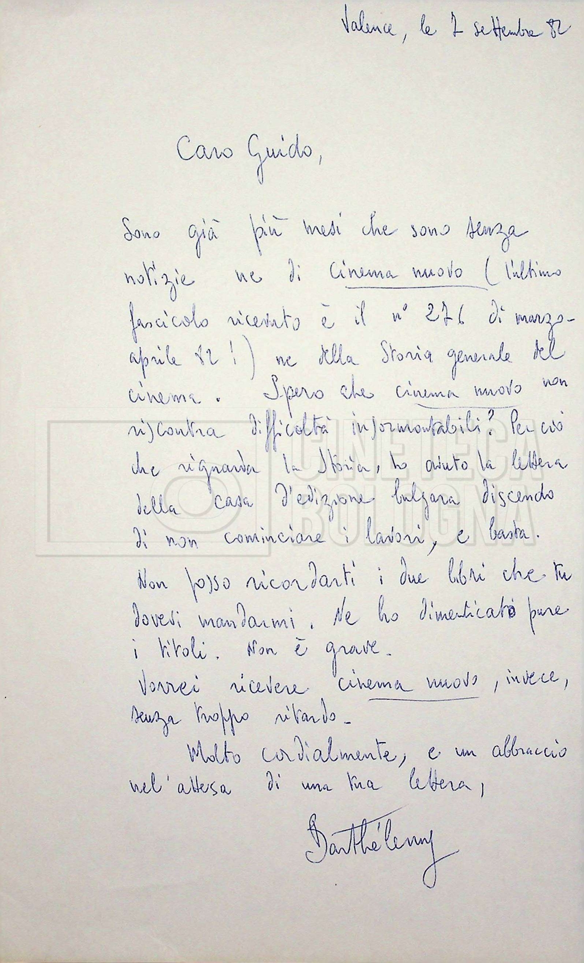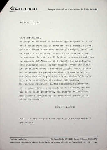 – Una lettera ms. di Barthélemy Amengual inviata a Guido Aristarco per chiedere informazioni sulle recenti attività di “Cinema Nuovo” e sul progetto della “General History of Cinema” (7 settembre 1982);