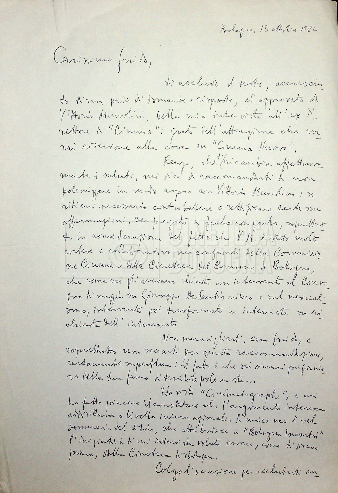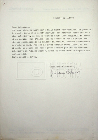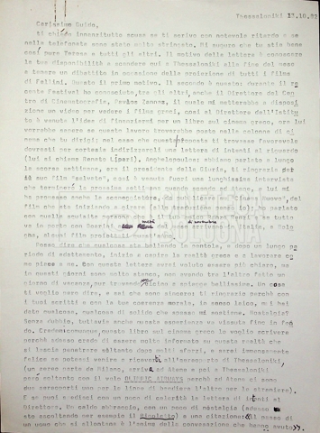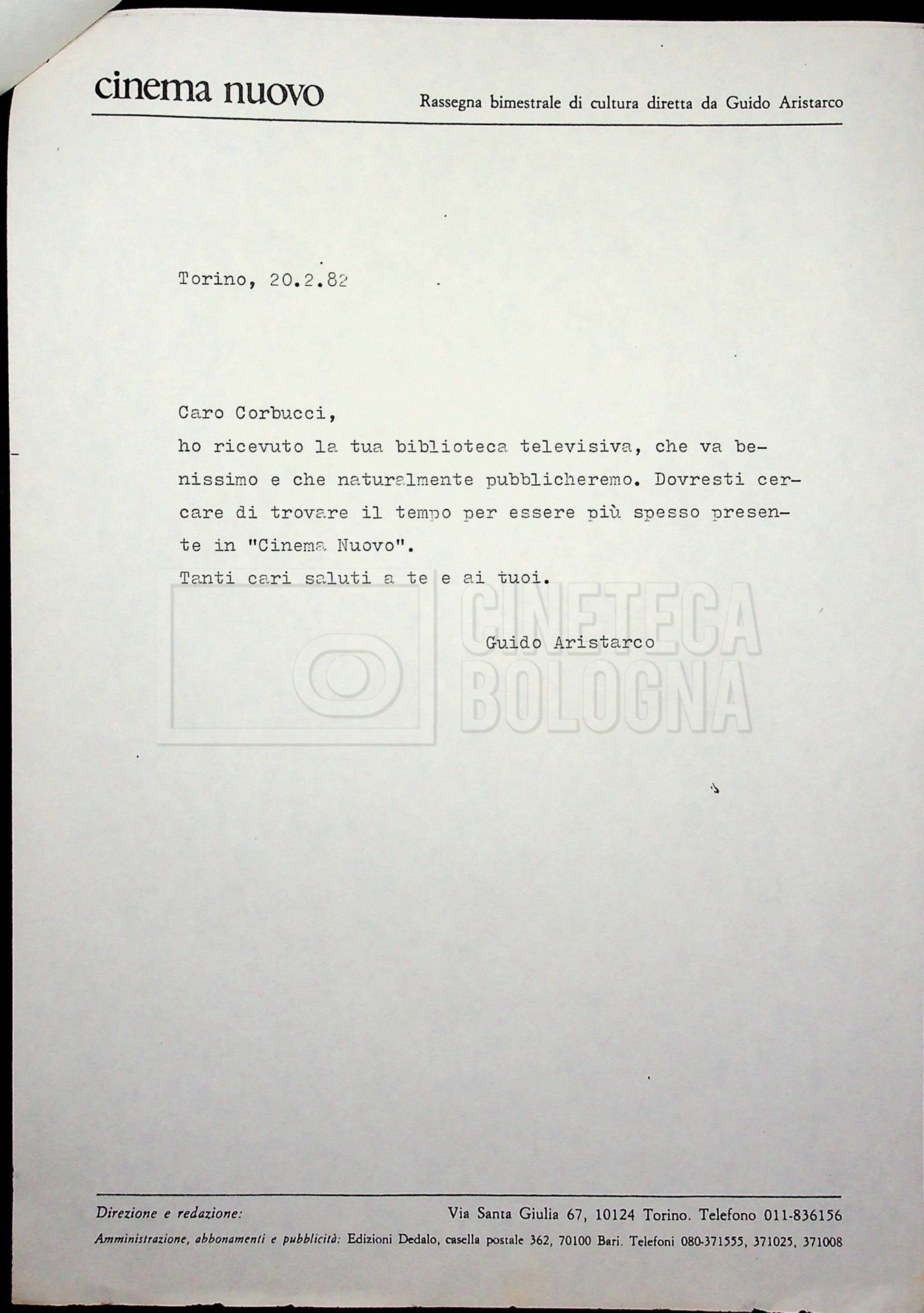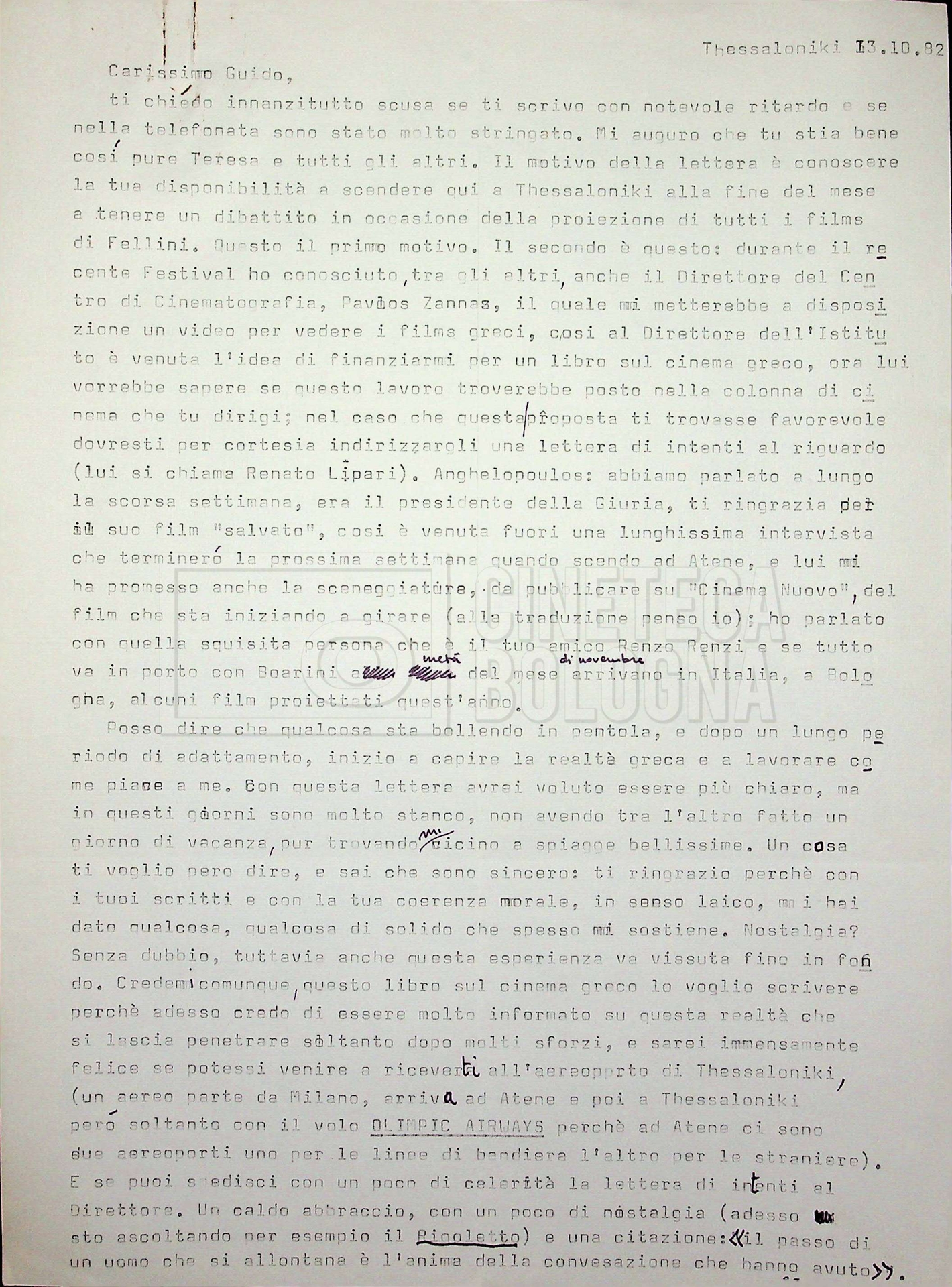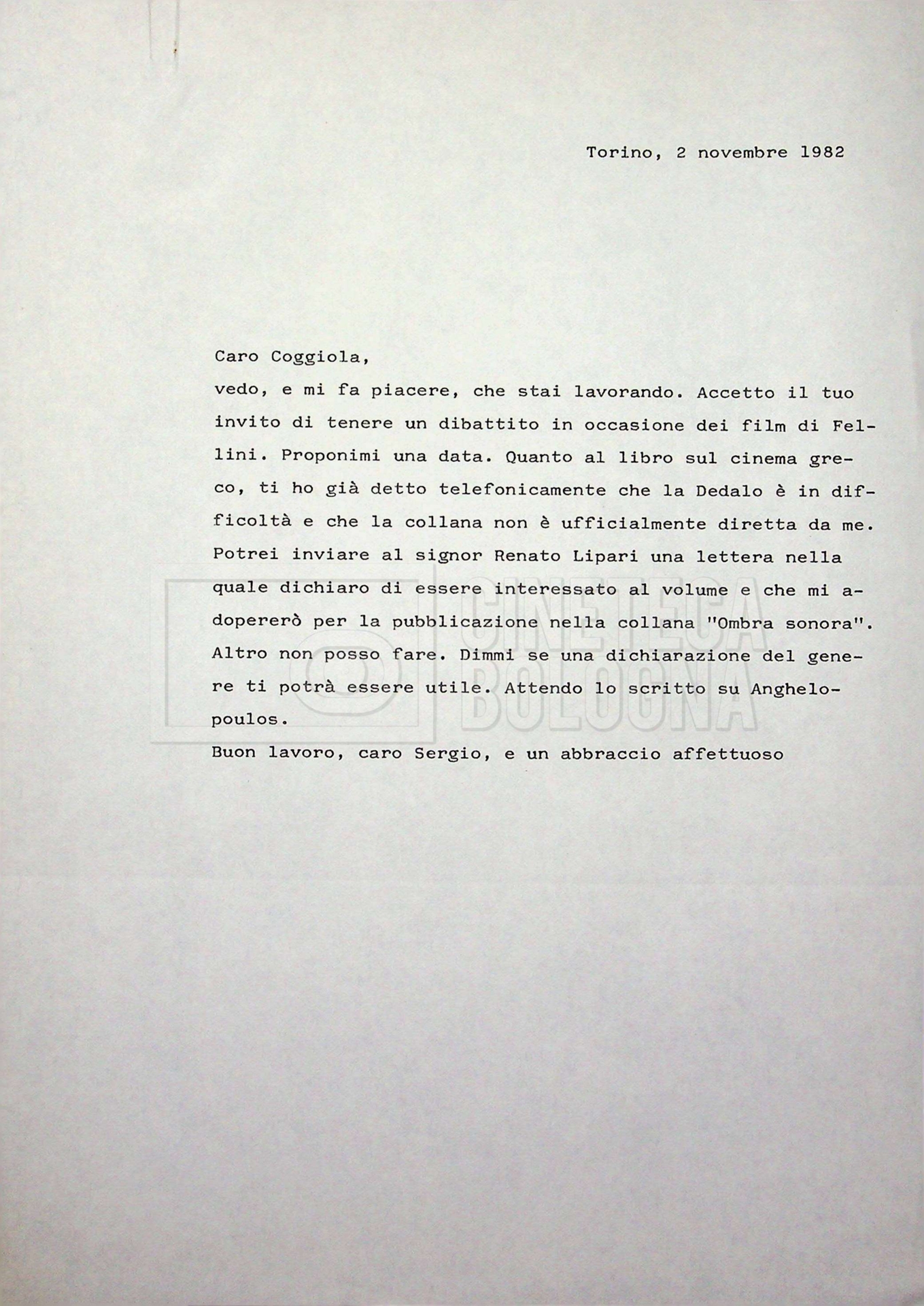 – Una lettera di Sergio Coggiola inviata a Guido Aristarco per inviare un articolo di Guido Aristarco su Federico Fellini pubblicato e tradotto dalla rivista greca “Cionda” (25 ottobre 1982);