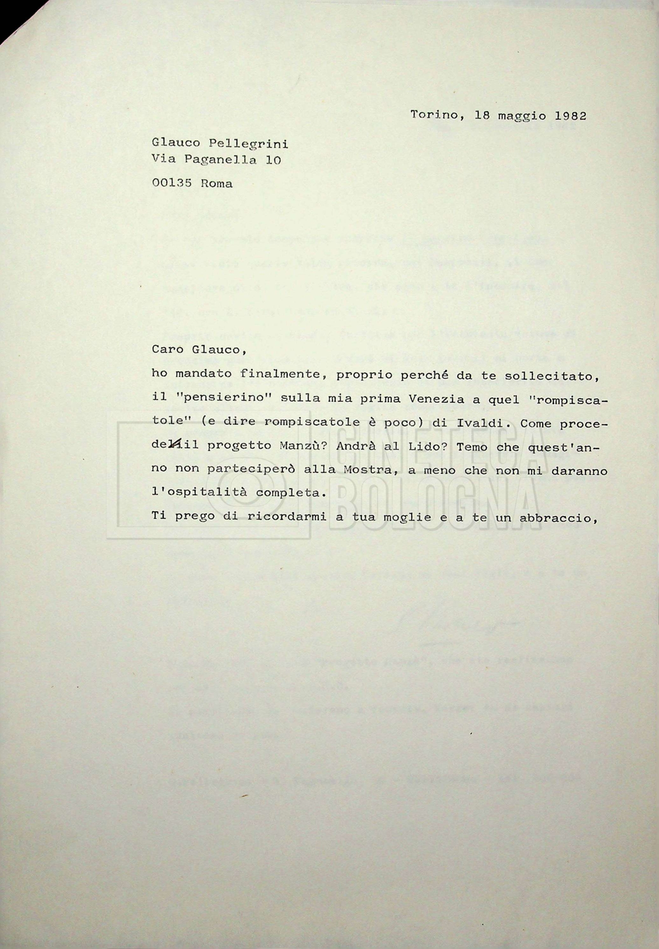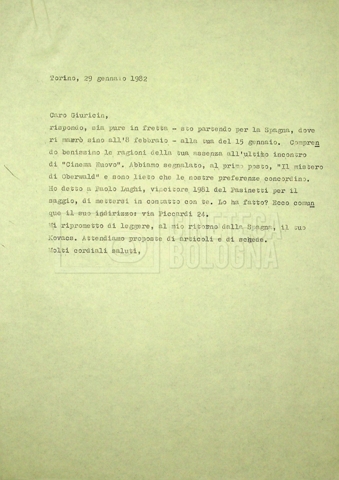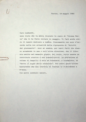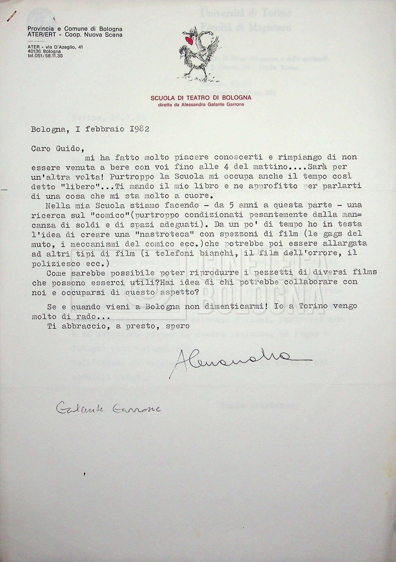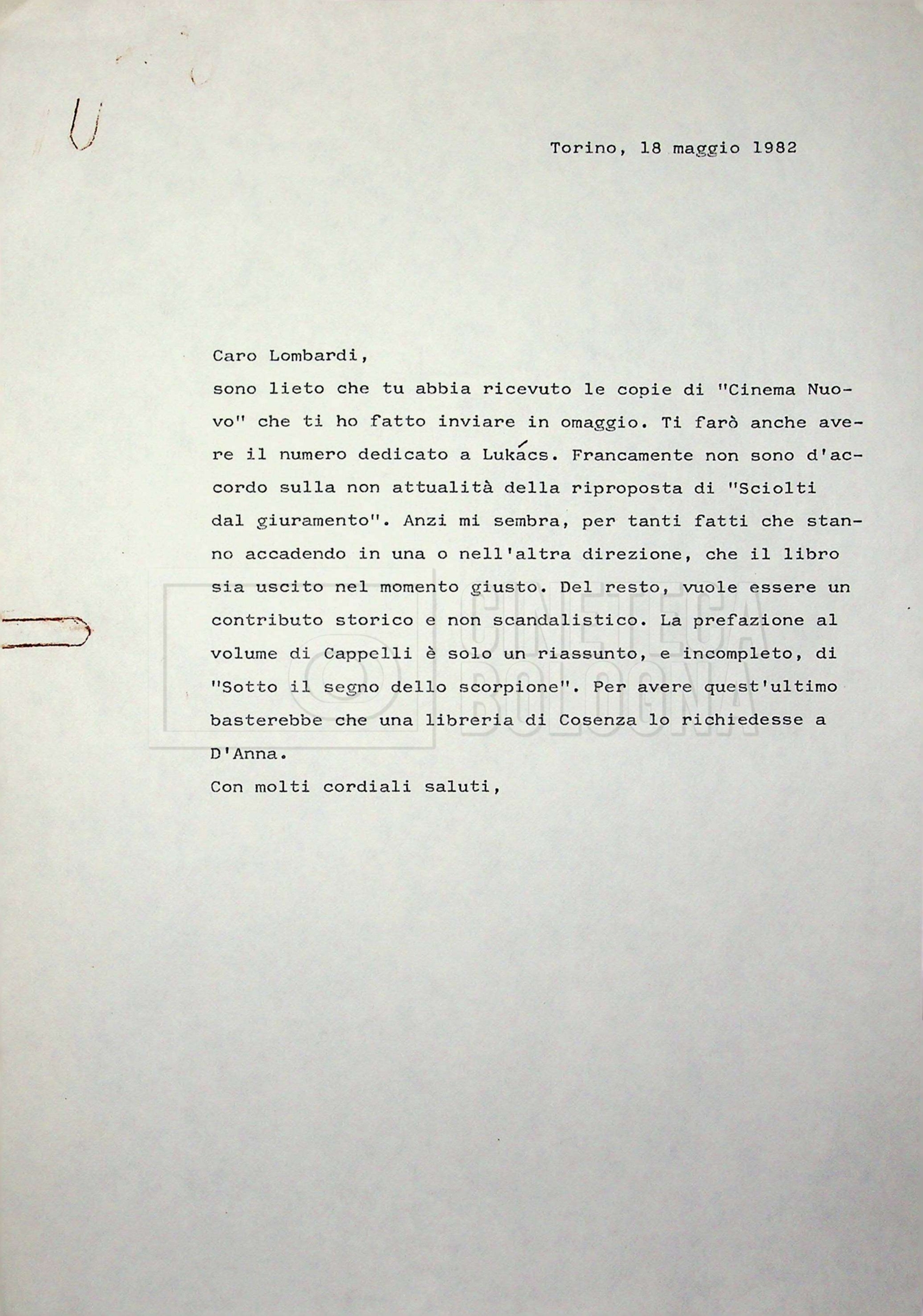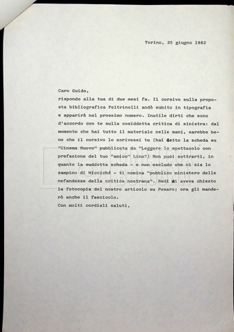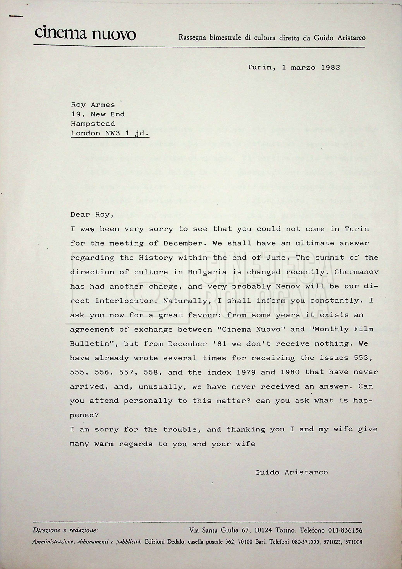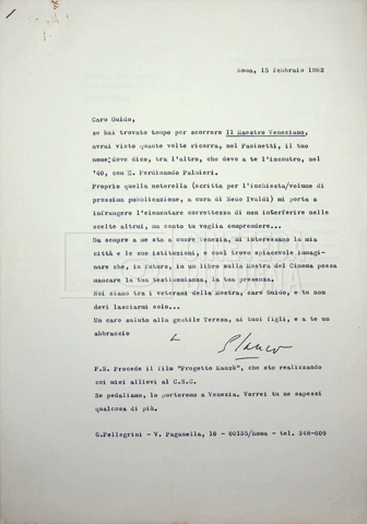 – Una lettera di Sergio Coggiola inviata a Guido Aristarco per inviare un articolo di Guido Aristarco su Federico Fellini pubblicato e tradotto dalla rivista greca “Cionda” (25 ottobre 1982);