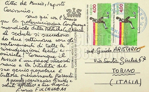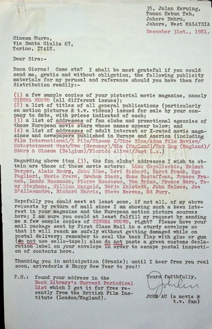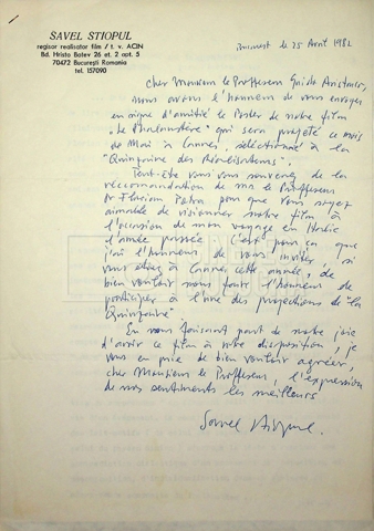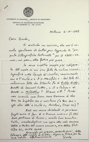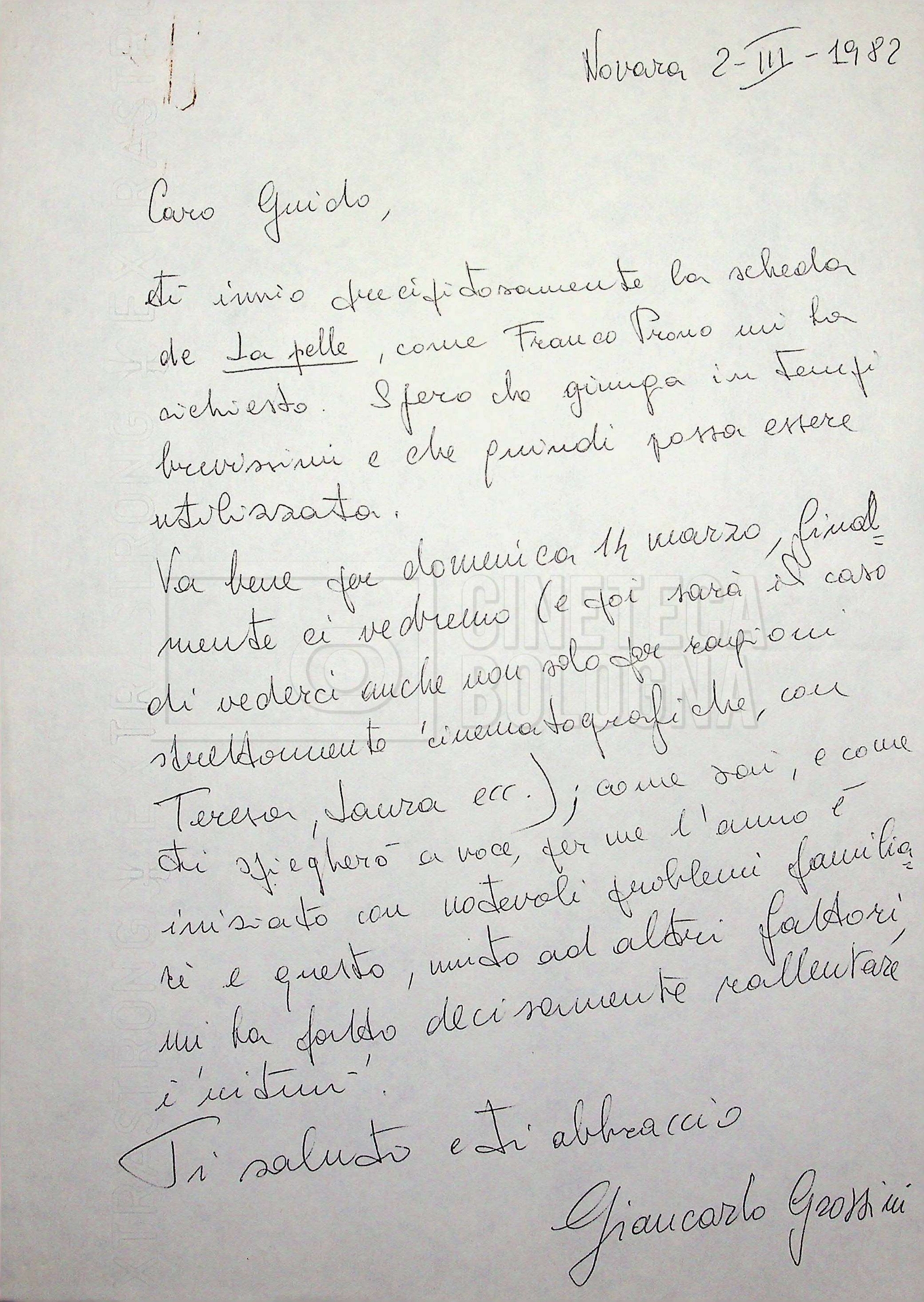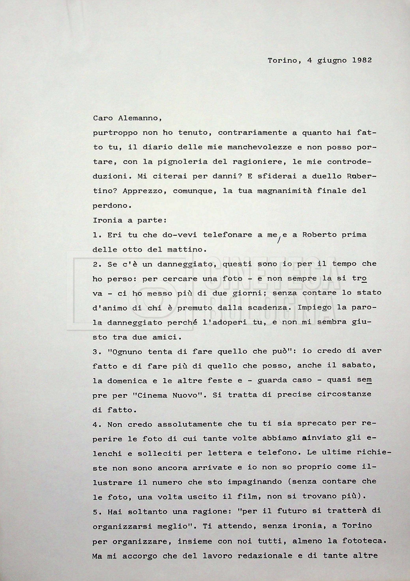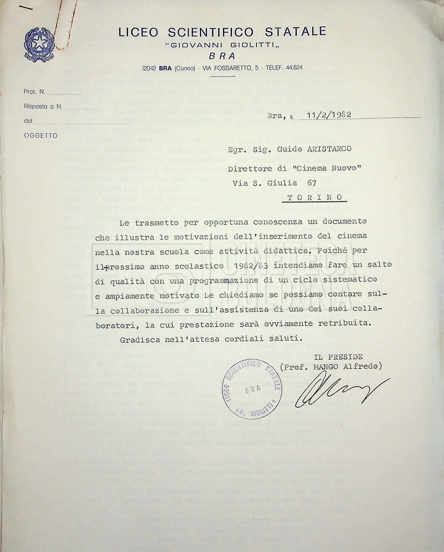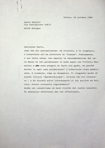 – Una lettera di Sergio Coggiola inviata a Guido Aristarco per inviare un articolo di Guido Aristarco su Federico Fellini pubblicato e tradotto dalla rivista greca “Cionda” (25 ottobre 1982);