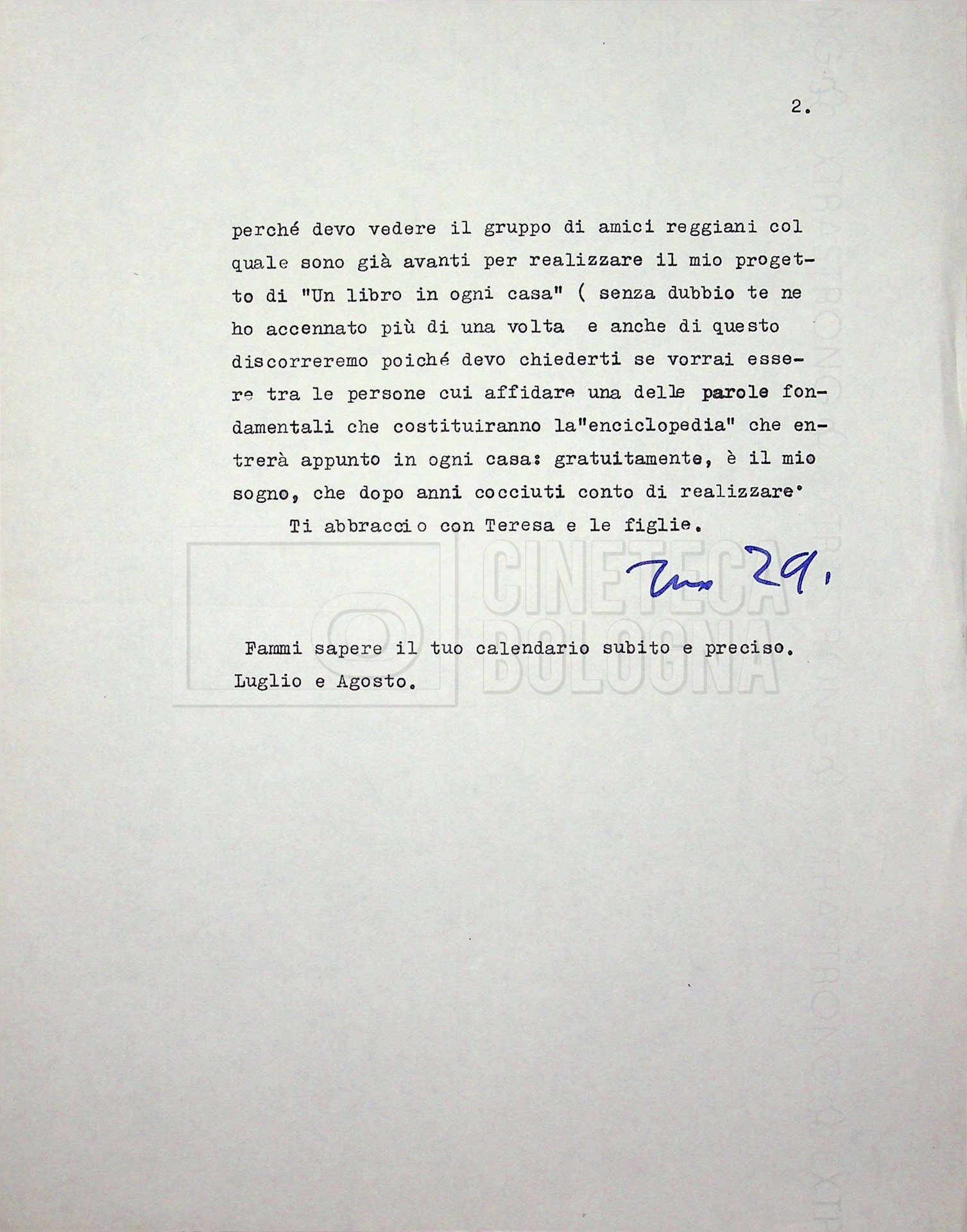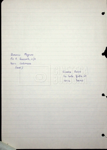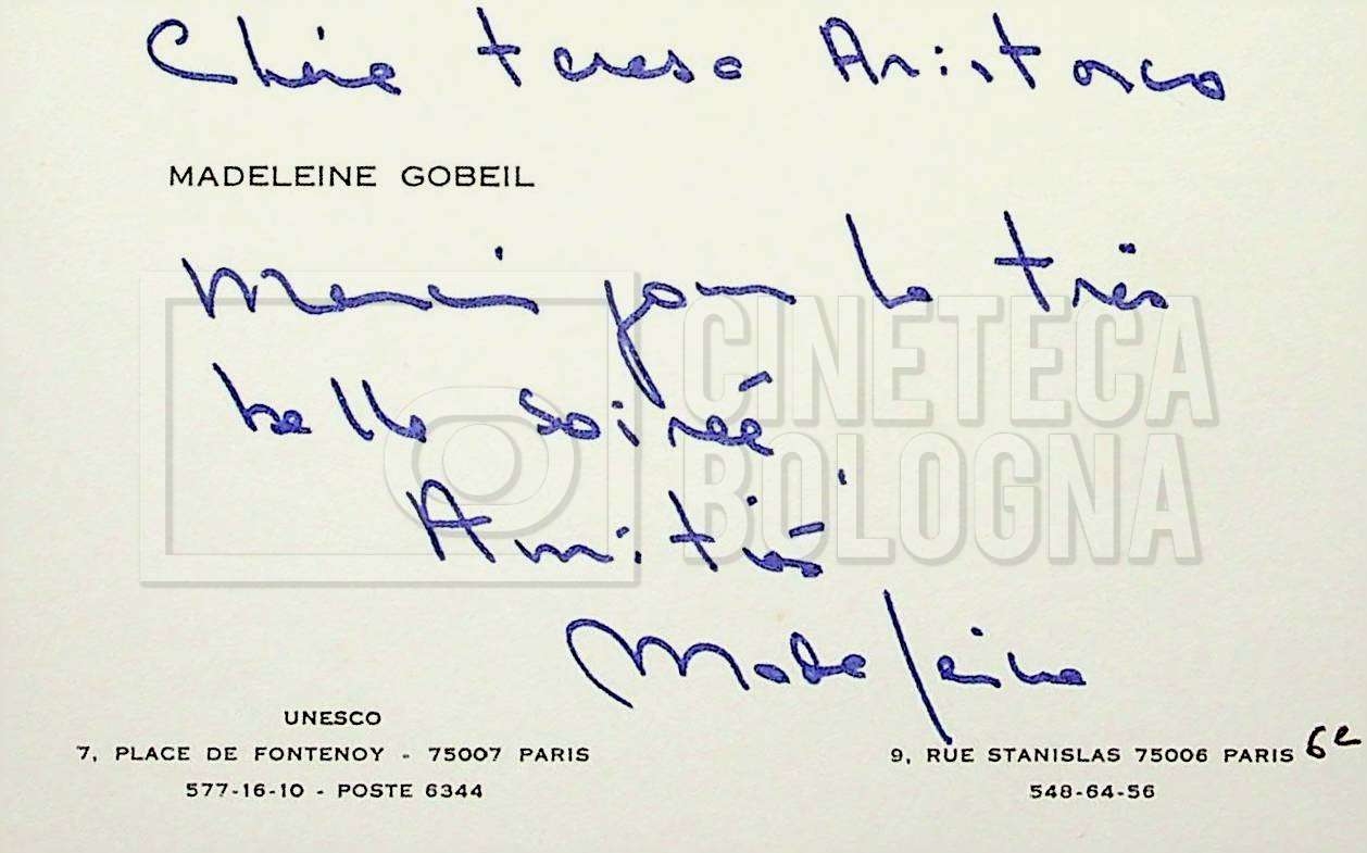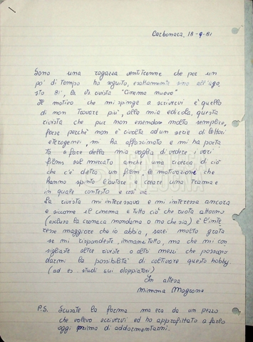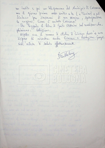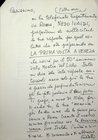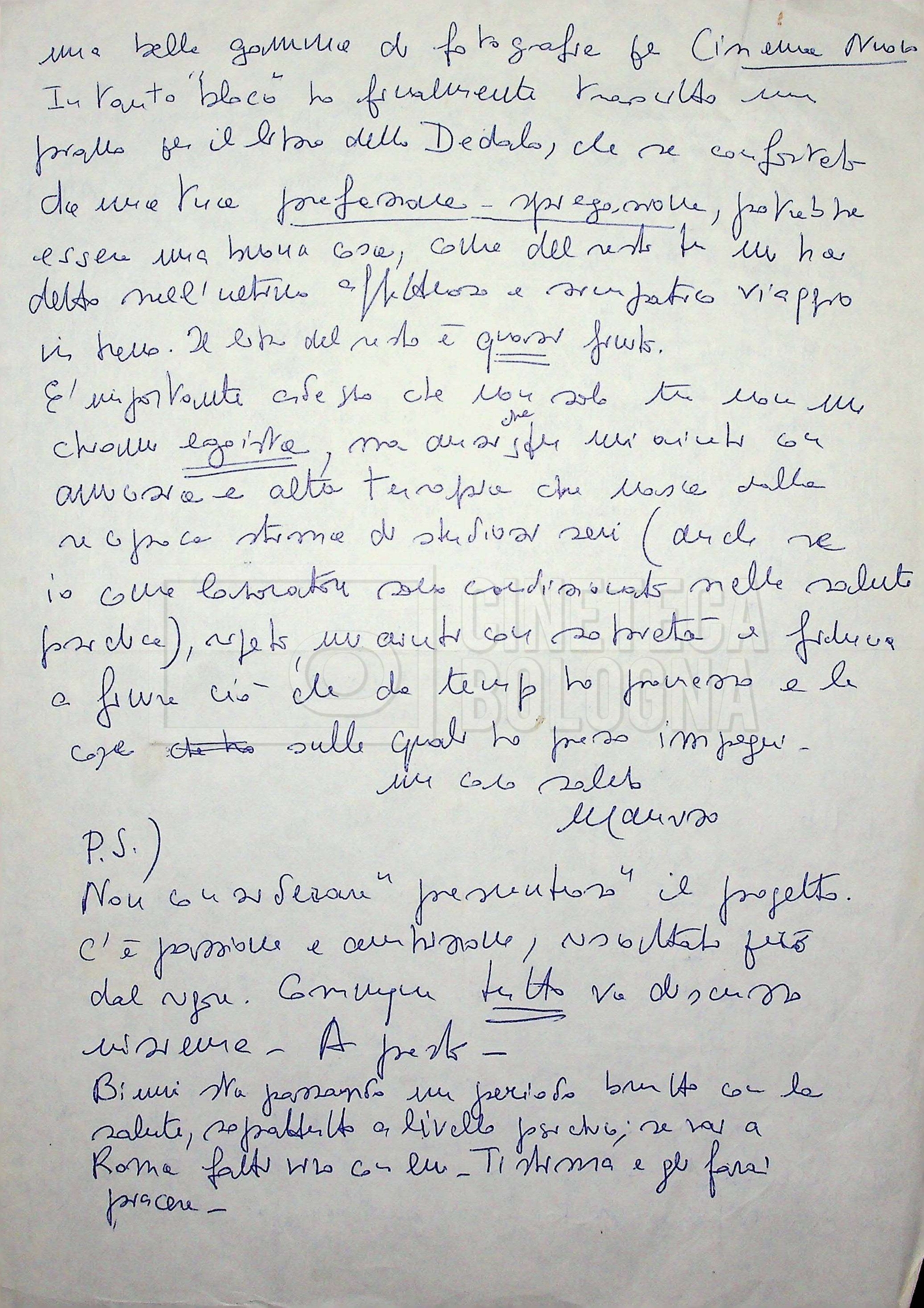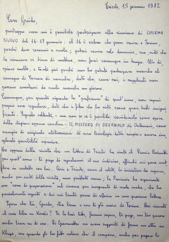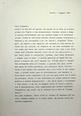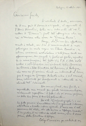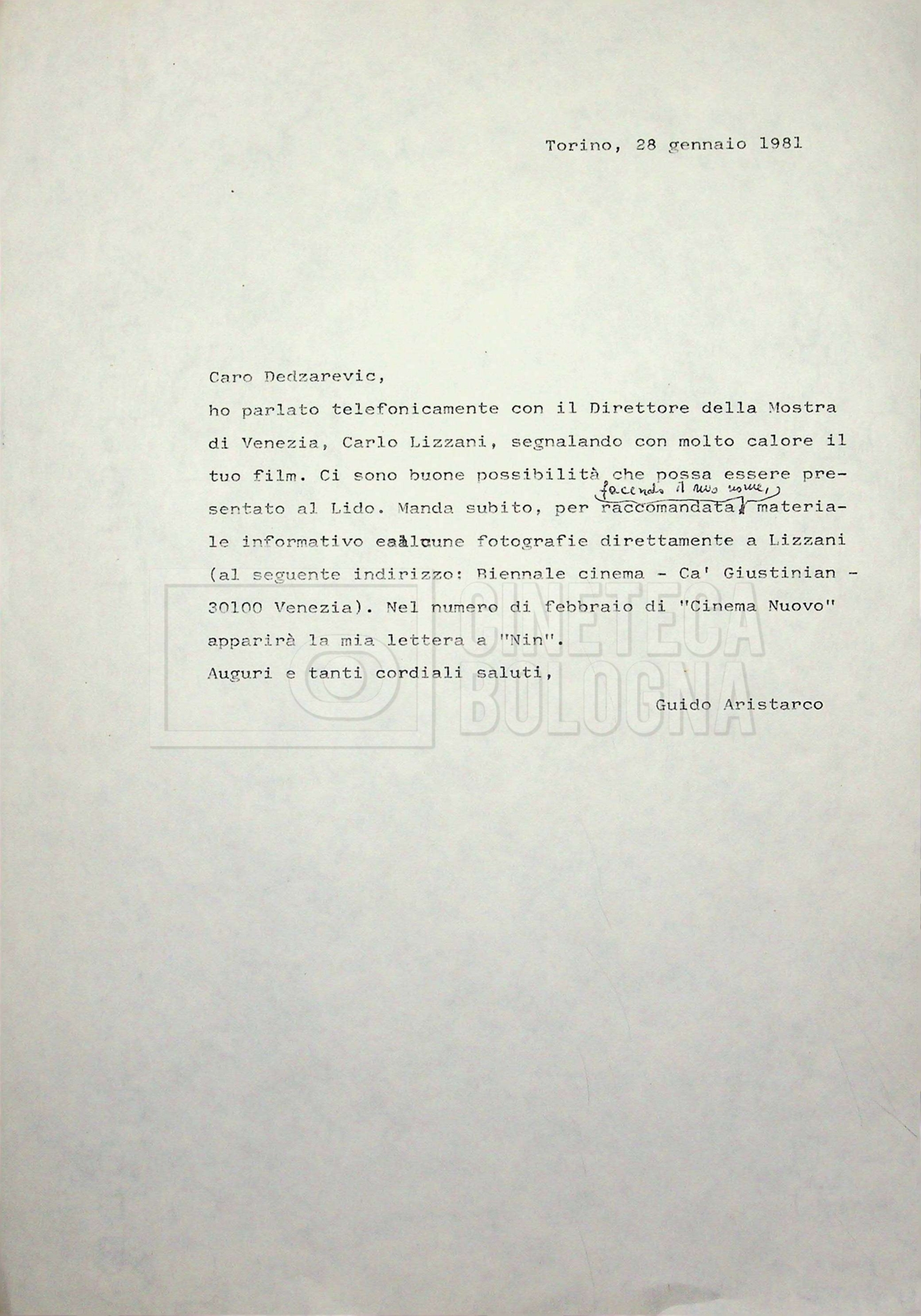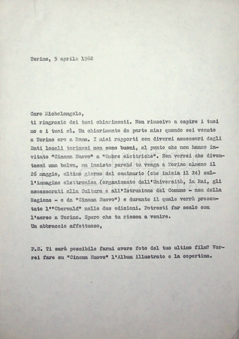 – Una lettera ms. di Michelangelo Antonioni inviata a Guido Aristarco per l’invio di materiale fotografico (giugno 1982);