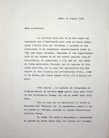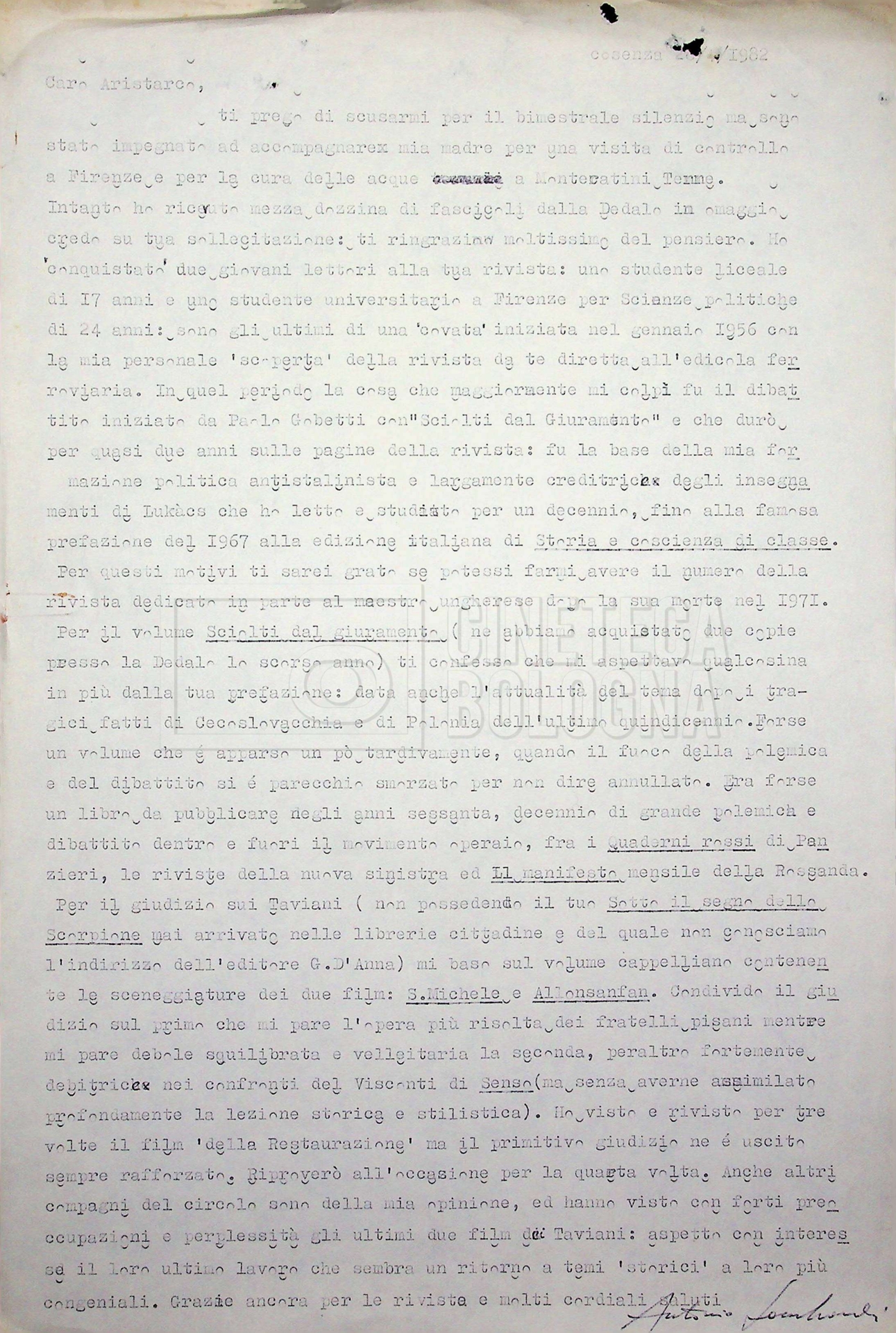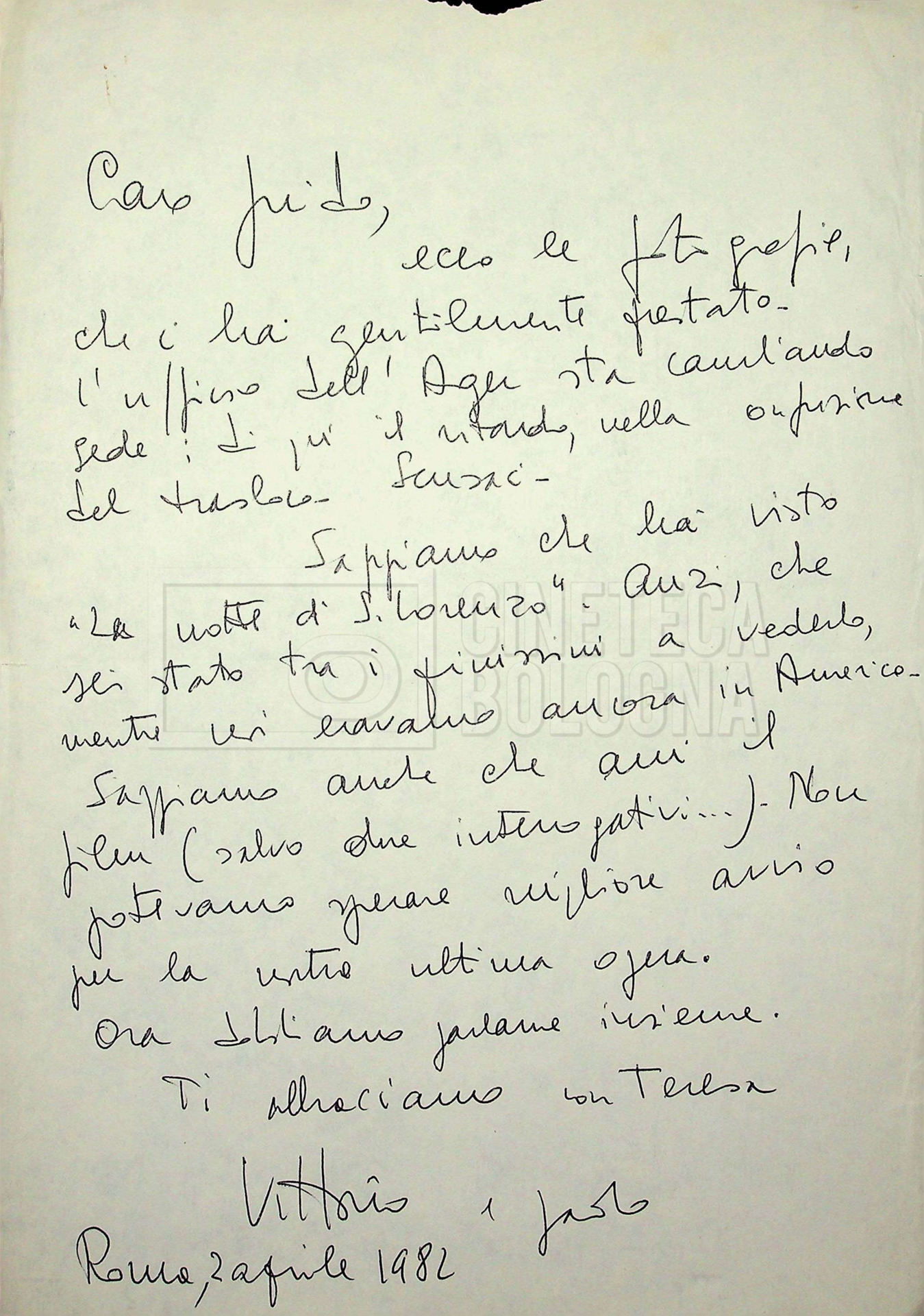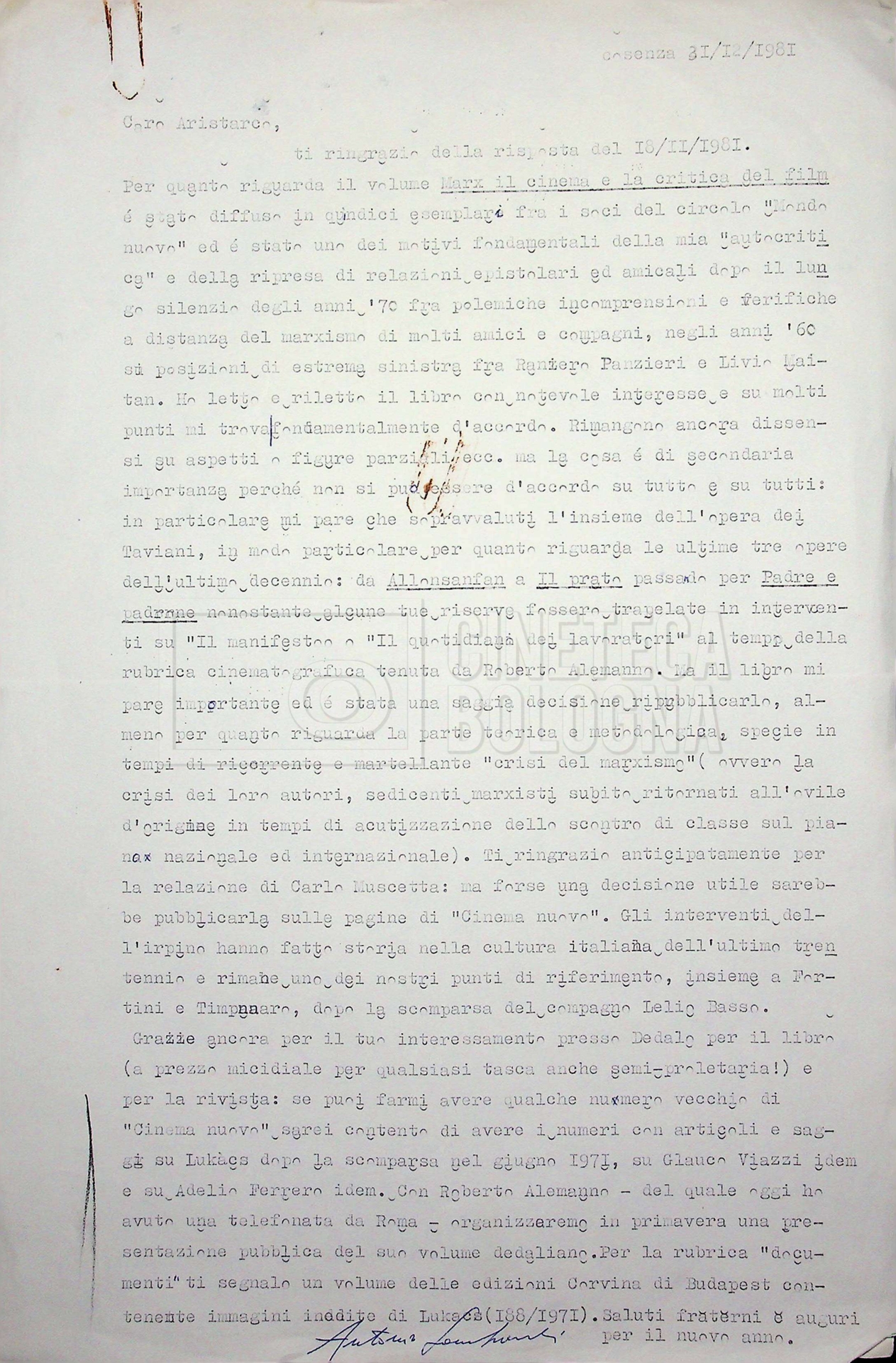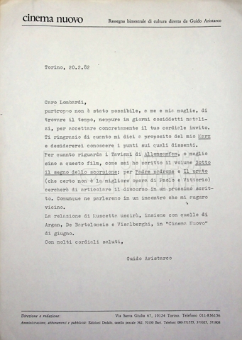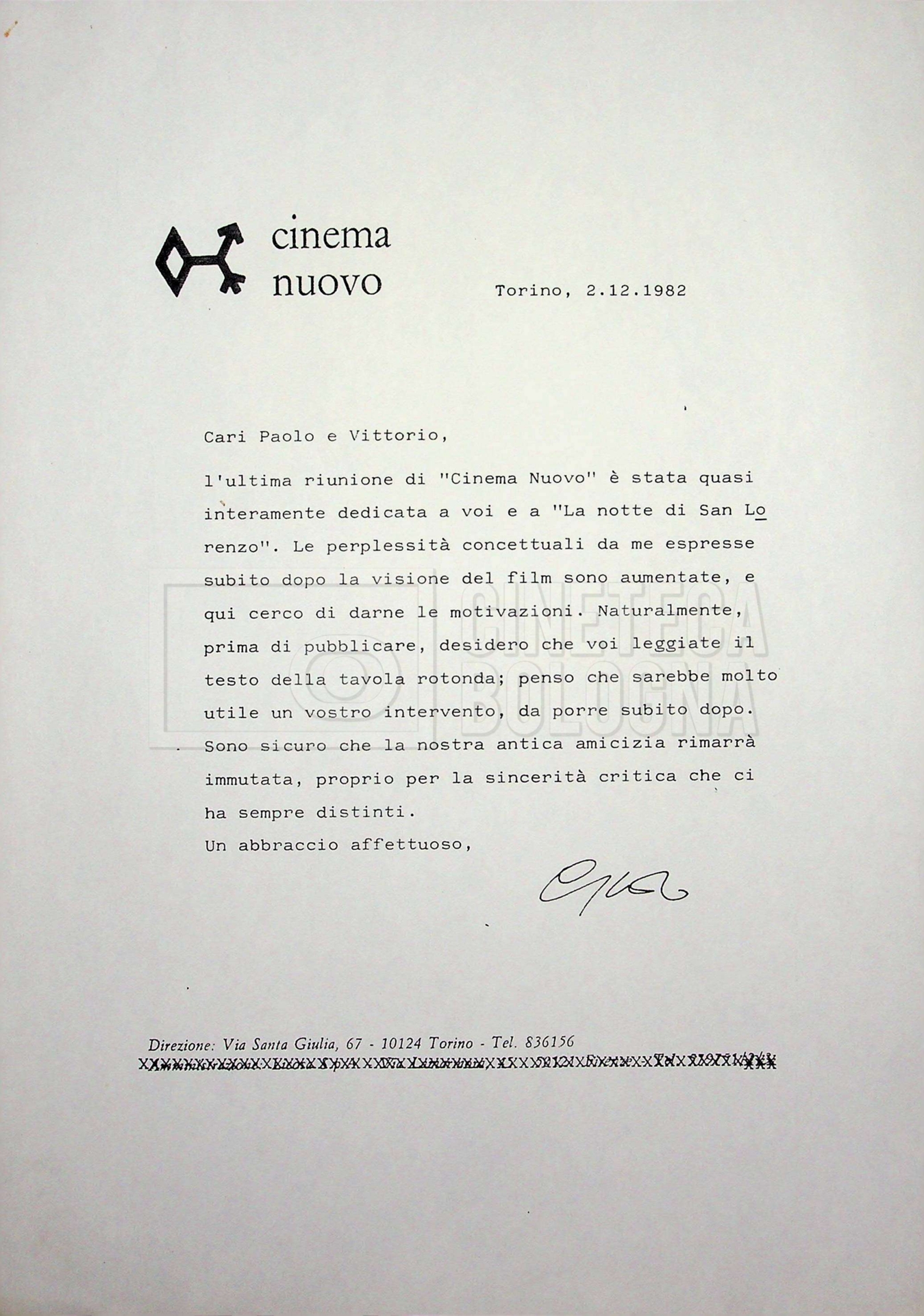 – La minuta di una lettera di Guido Aristarco inviata a Paolo e Vittorio Taviani per informarli della riunione di “Cinema Nuovo” dedicata al film La notte di San Lorenzo (2 dicembre 1982);