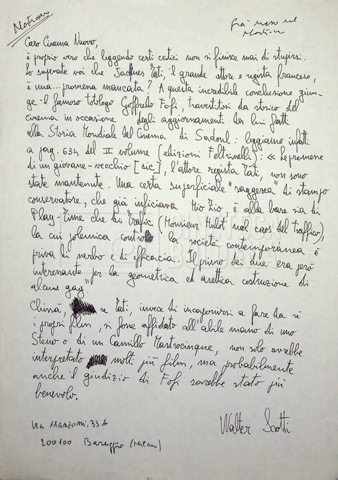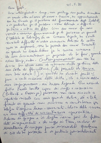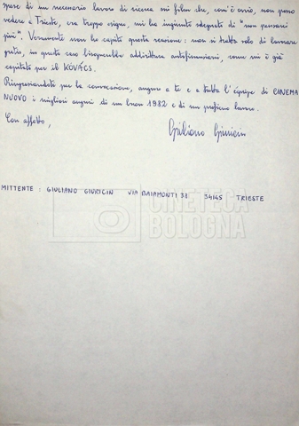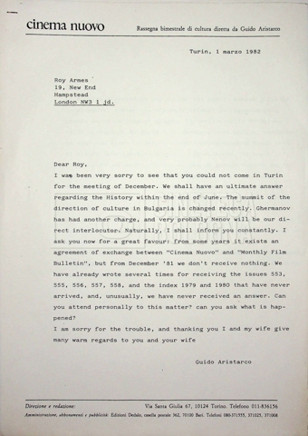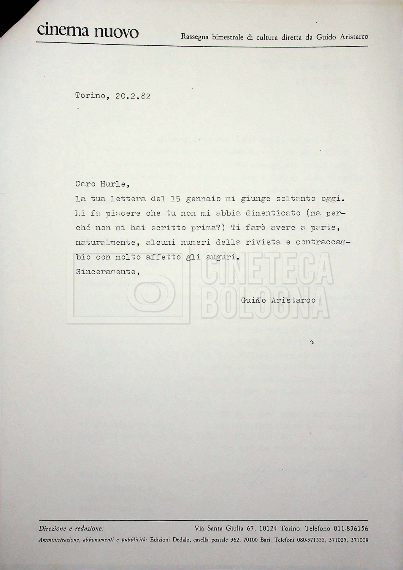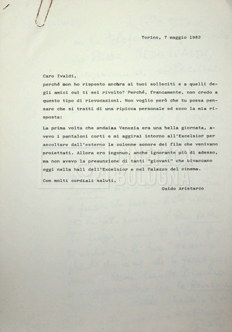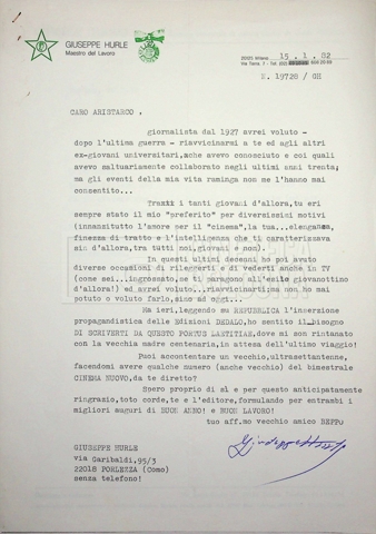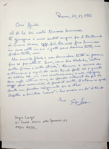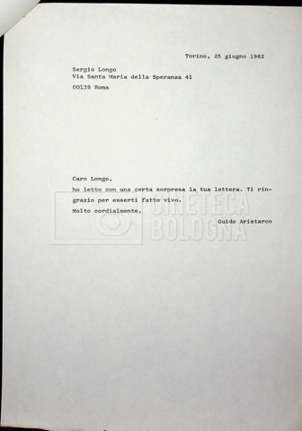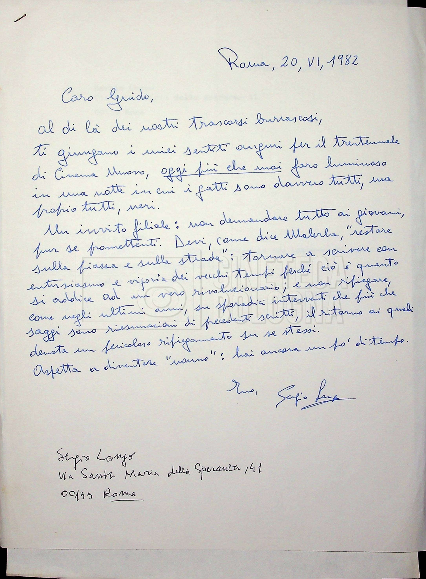 – Una lettera ms. di Sergio Longo inviata a Guido Aristarco per i trent’anni della rivista “Cinema Nuovo” (20 giugno 1982);