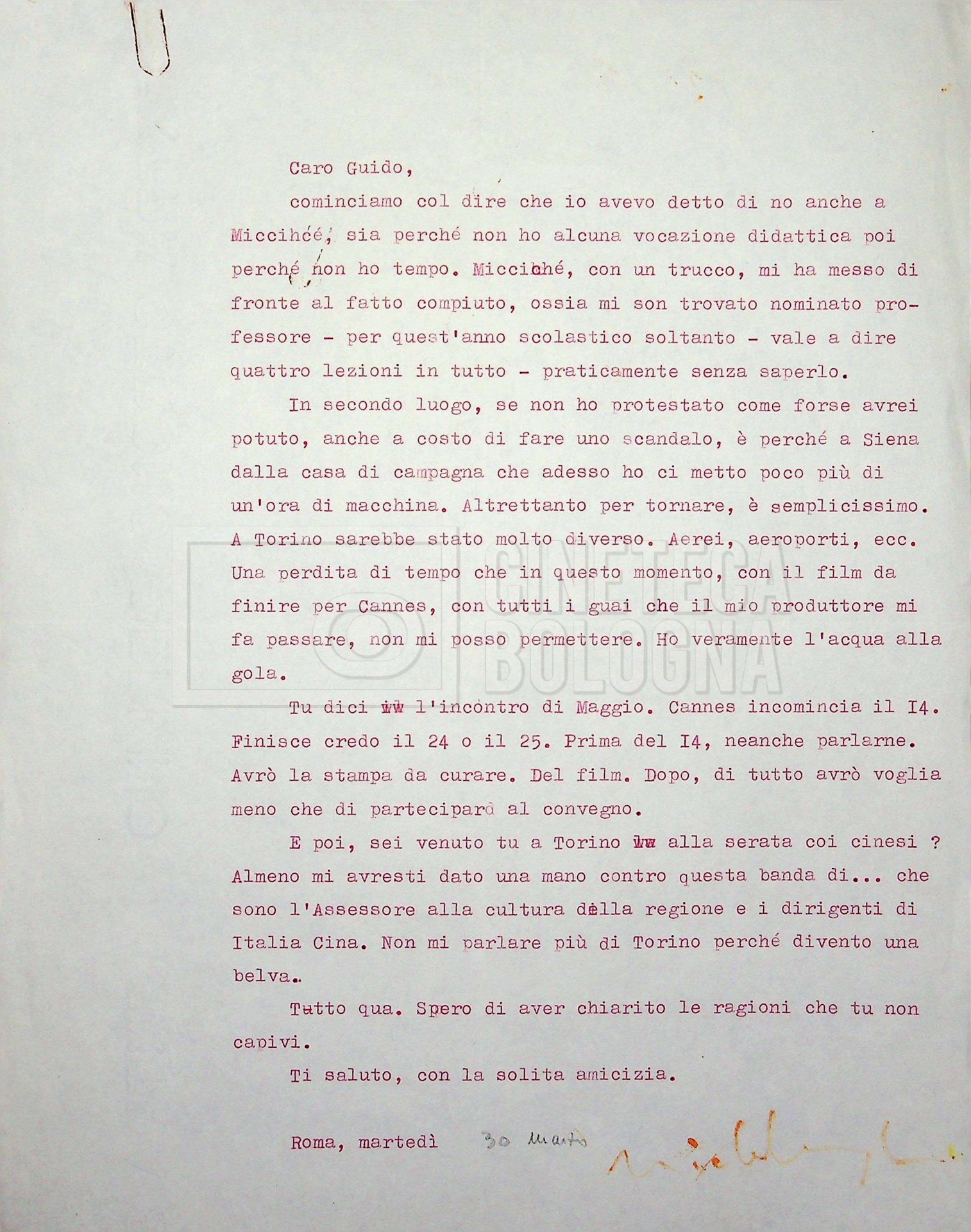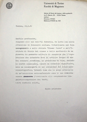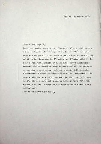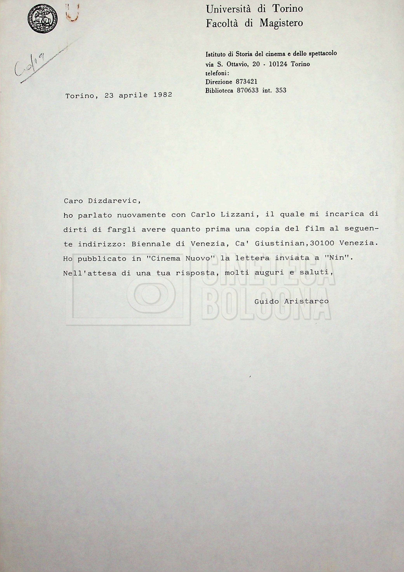 – La minuta di una lettera di Guido Aristarco inviata a Michelangelo Antonioni e relativa ad un seminario tenuto all’Università degli Studi di Siena (22 marzo 1982); a cui segue risposta di Michelangelo Antonioni (30 marzo 1982);