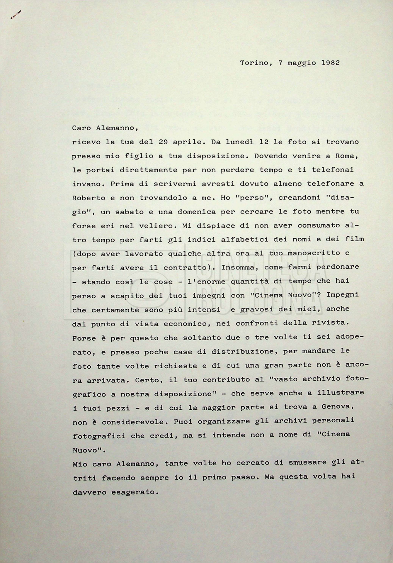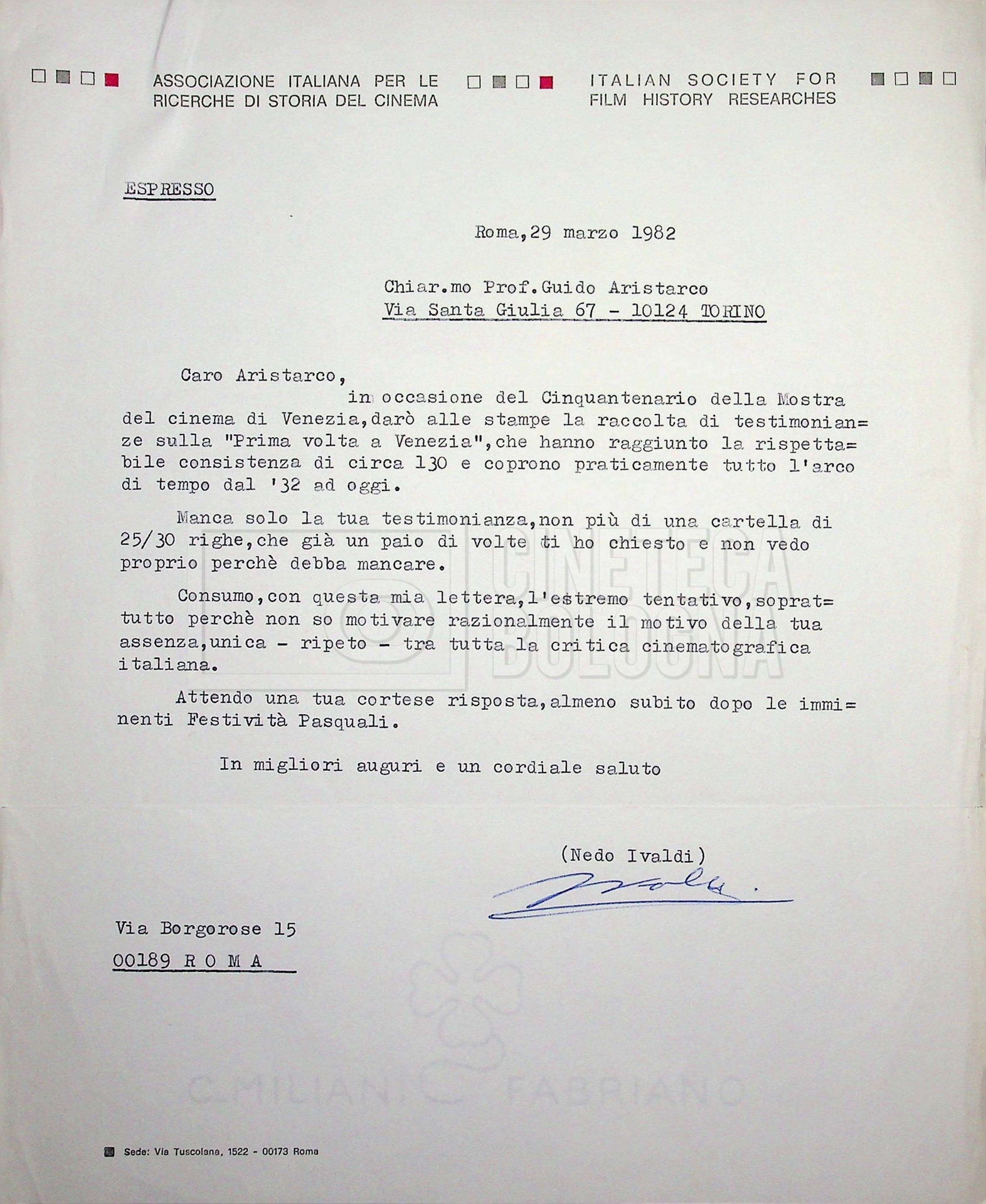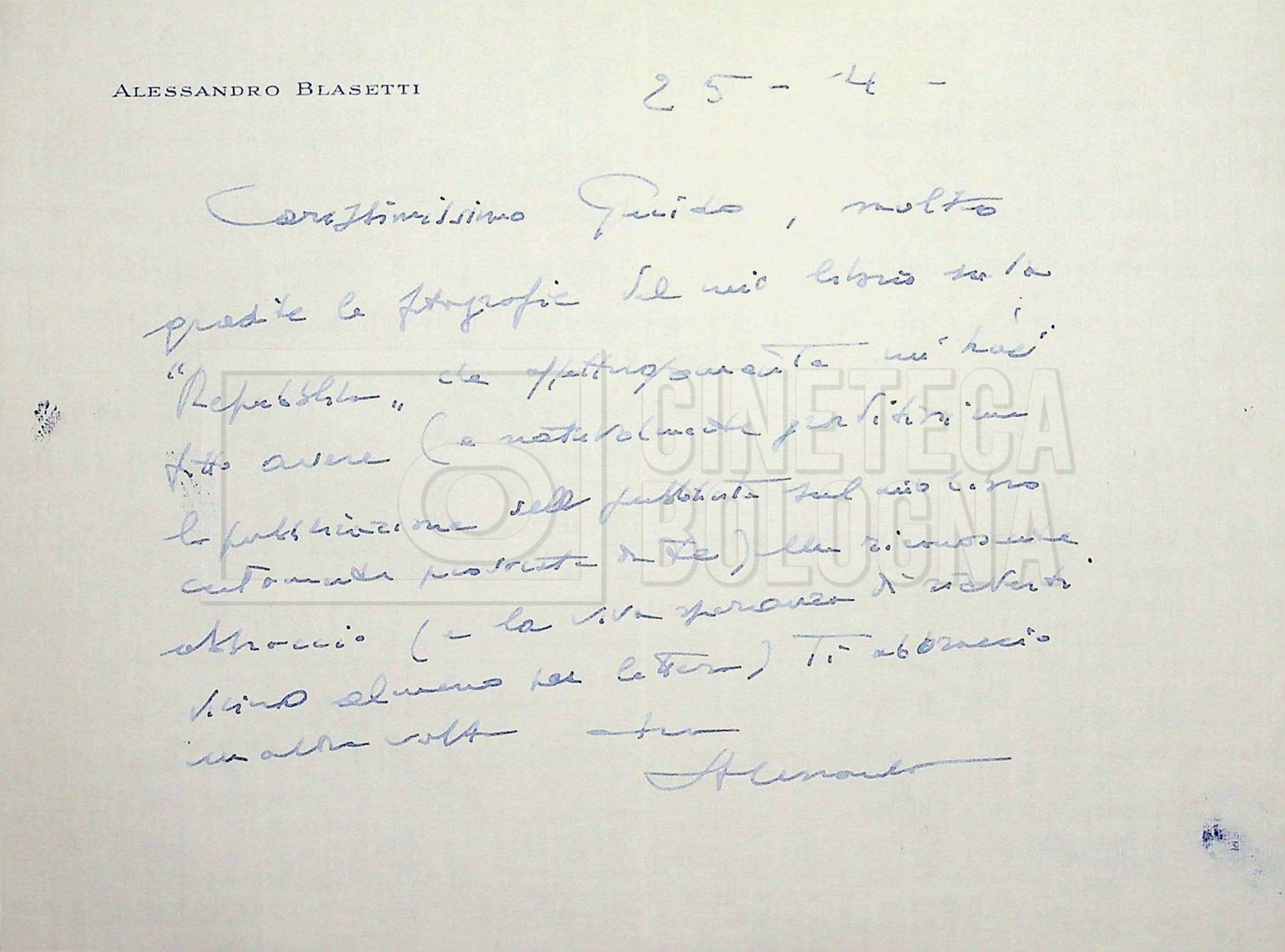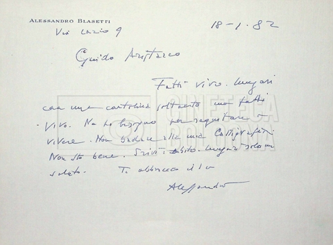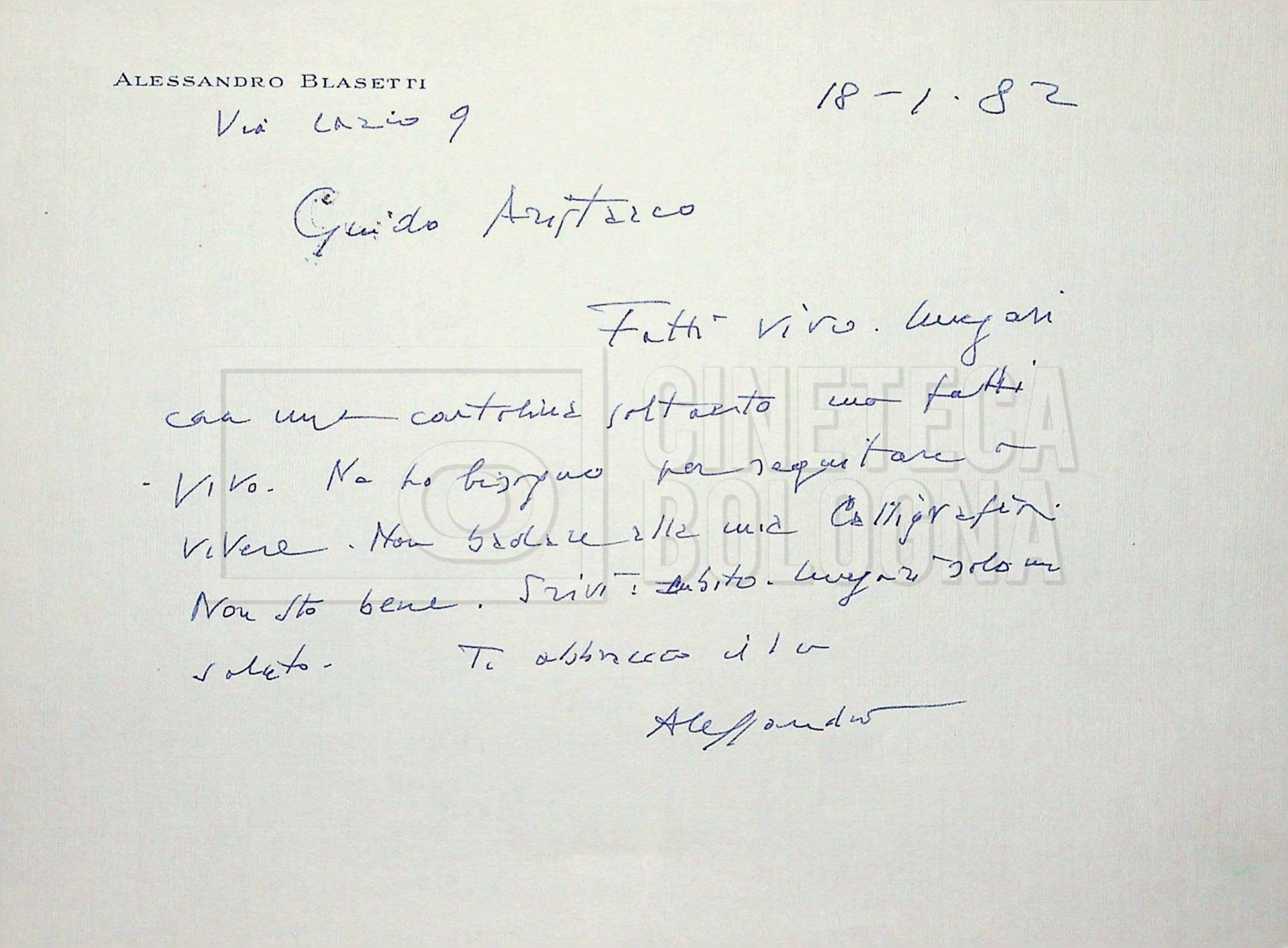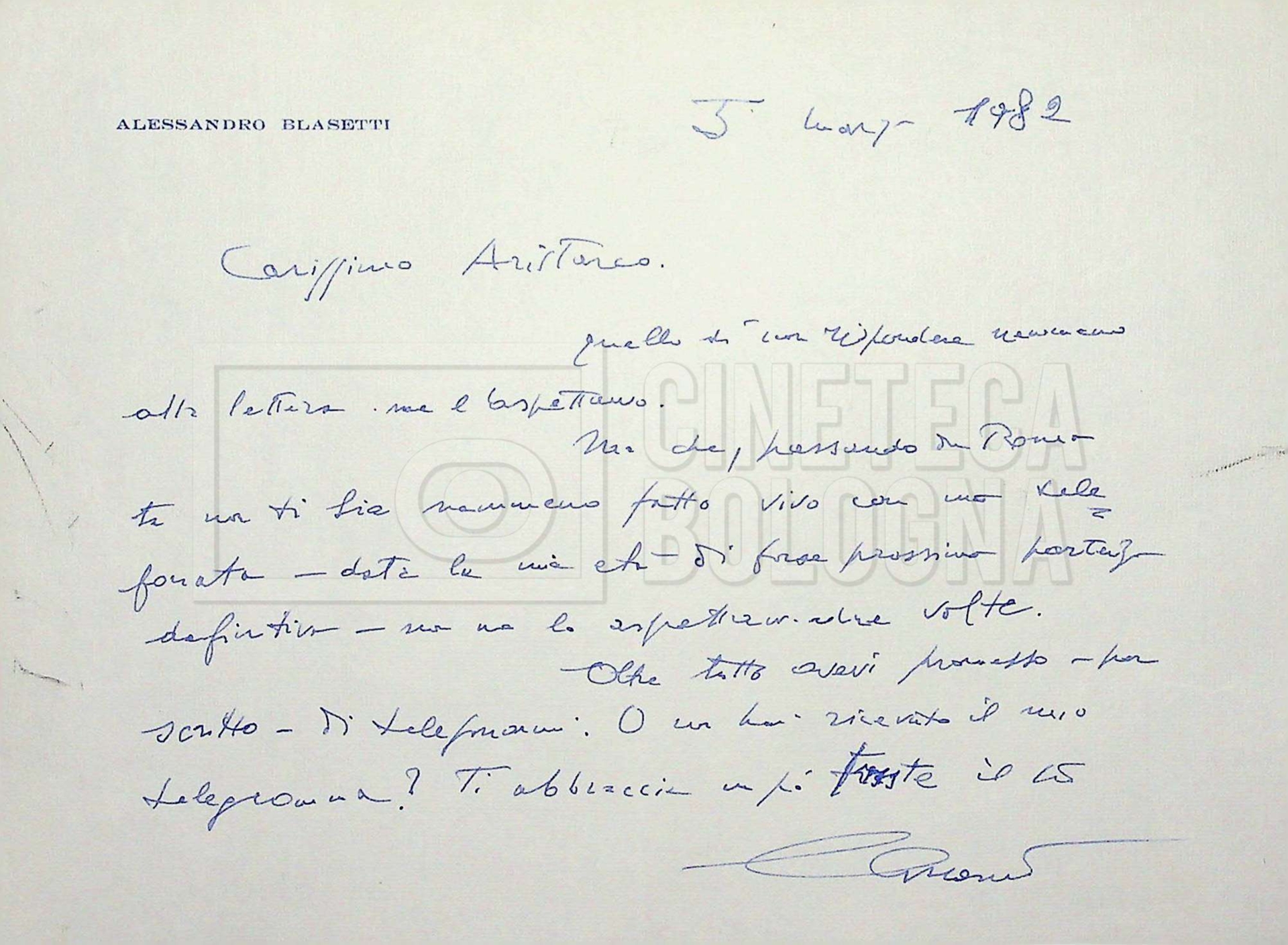 – Una lettera ms. di Alessandro Blasetti inviata a Guido Aristarco per sollecitare una risposta (18 gennaio 1982); alla quale ne segue un’altra, sempre ms., nella quale rimprovera di non aver ricevuto notizie (5 luglio 1982);
