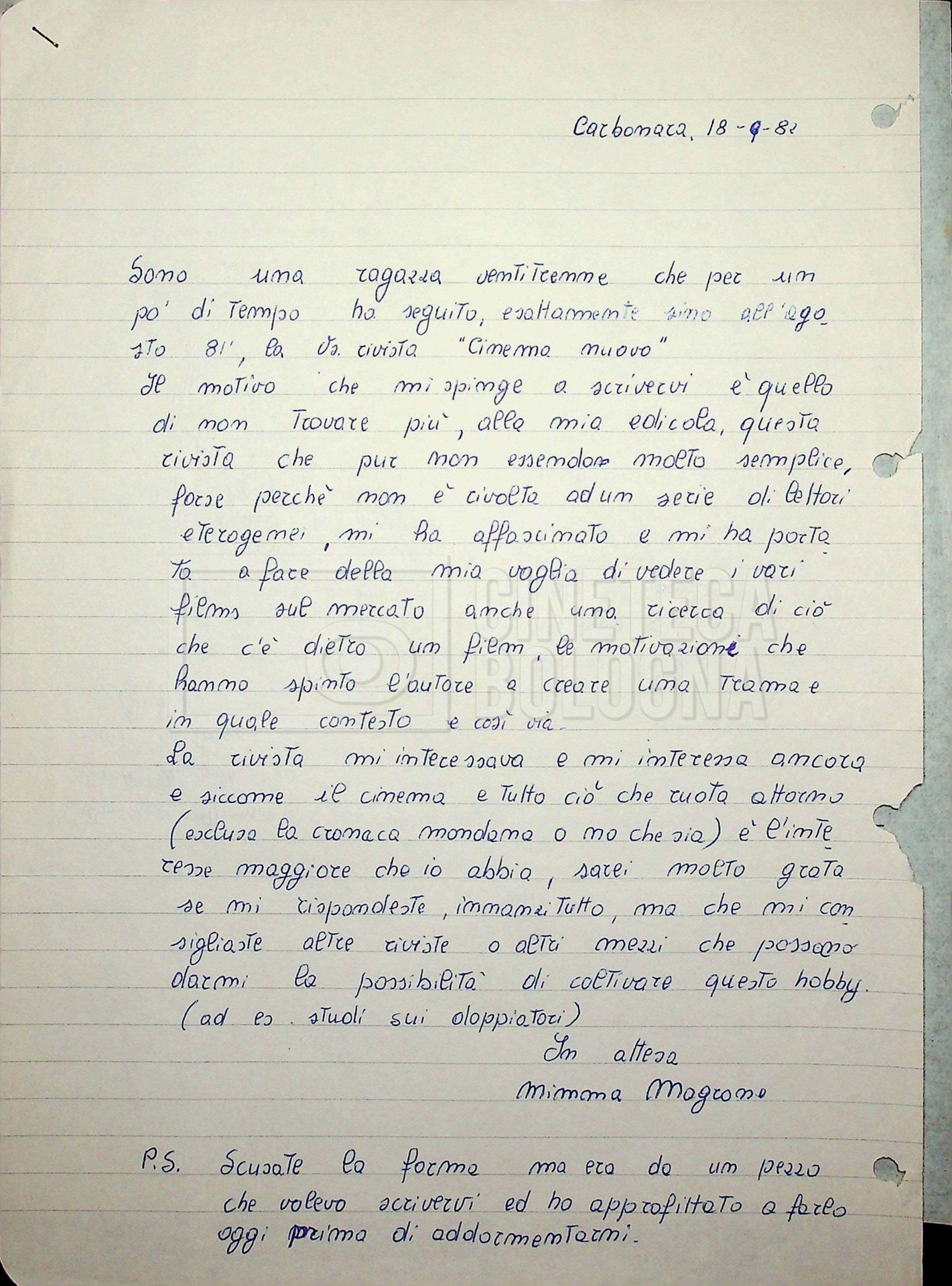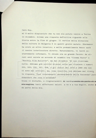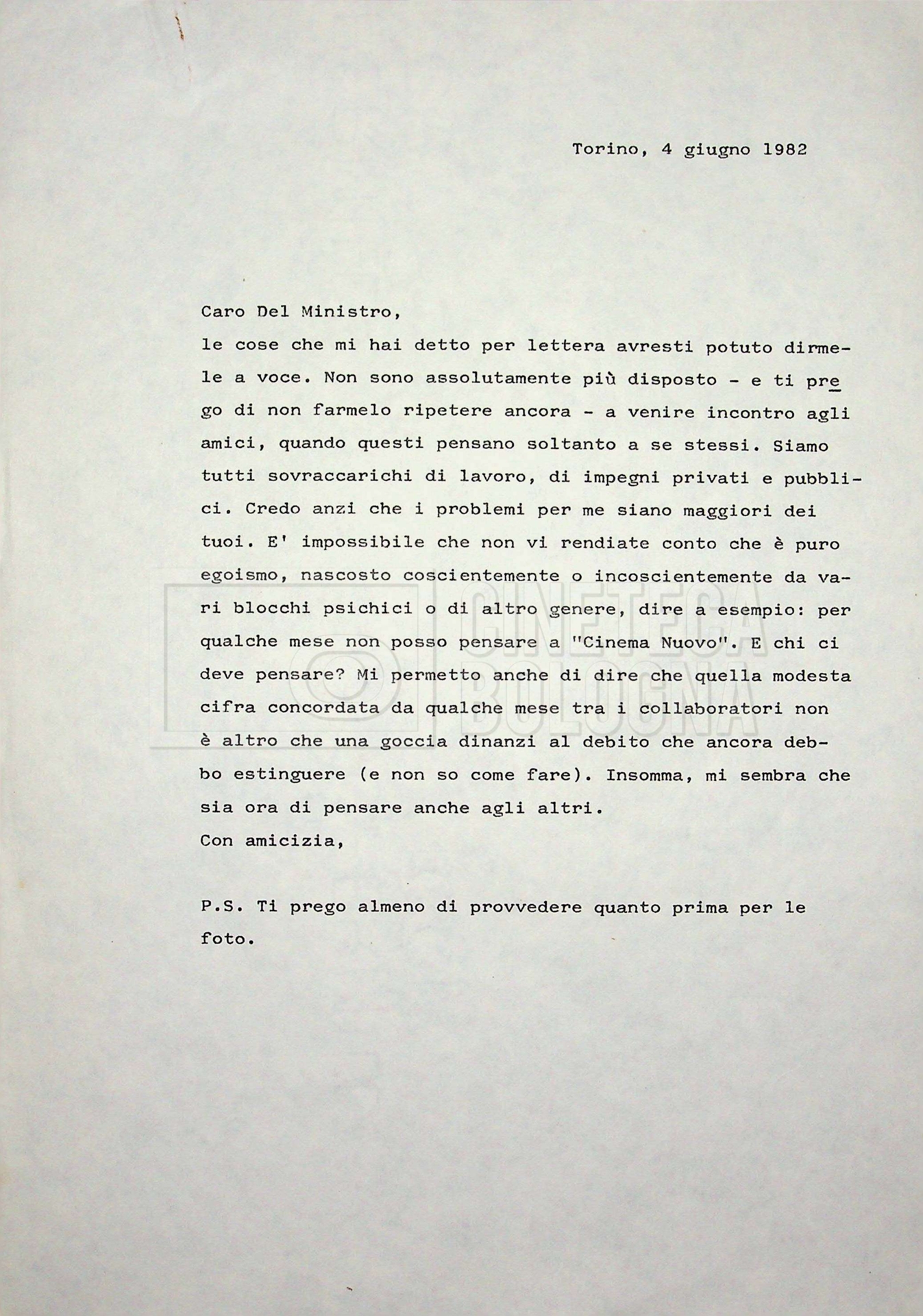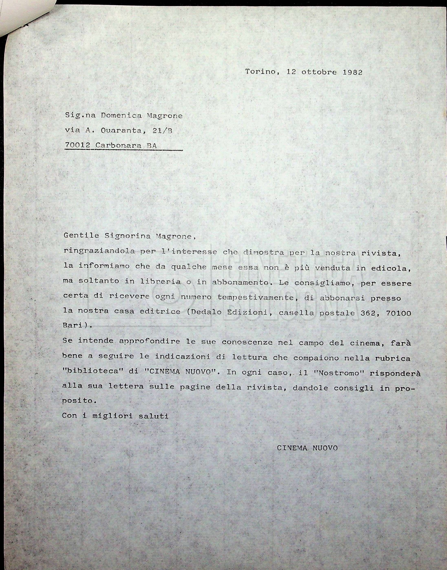 – La minuta di una lettera di Guido Aristarco inviata a Michelangelo Antonioni per inoltrare una copia di “Cinema Nuovo” con copertina a lui dedicata e indicare coordinate per abbonamento (25 novembre 1982);