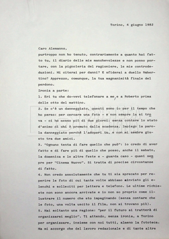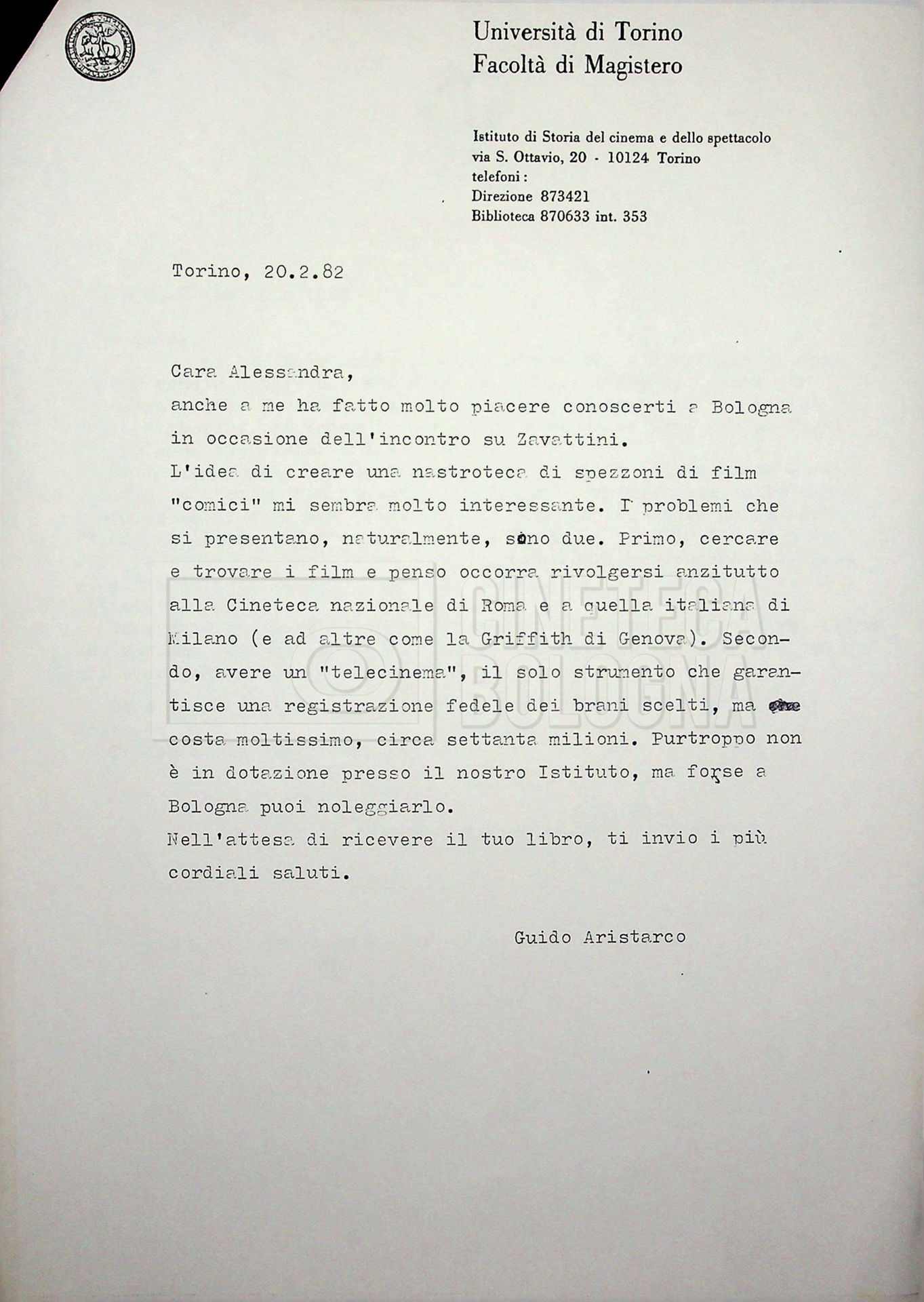 – Una lettera di Cesare Zavattini riguardante problemi di salute e problemi con l’Università degli Studi di Torino (25 ottobre 1982); a cui segue la minuta della risposta di Guido Aristarco;