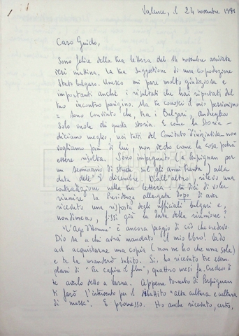 – Una lettera ms. di Gian Carlo Fusco inviata a Guido Aristarco per inoltrare una sua recensione del film Uomini e no di Valentino Orsini (17 gennaio 1982); a cui segue la minuta ms. della risposta di Guido Aristarco (26 gennaio 1982);
