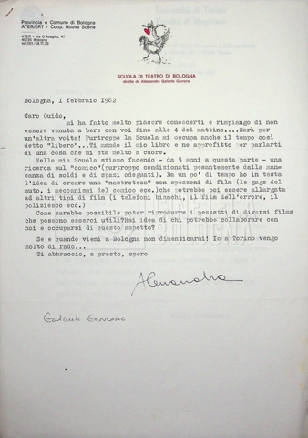 – Una lettera di Sergio Coggiola inviata a Guido Aristarco per invitarlo a Salonicco nell’ambito di una rassegna dedicata a Federico Fellini e per aggiornamenti circa la collana “Ombra sonora” (13 ottobre 1982); a cui segue la minuta della risposta di Guido Aristarco (2 novembre 1982);