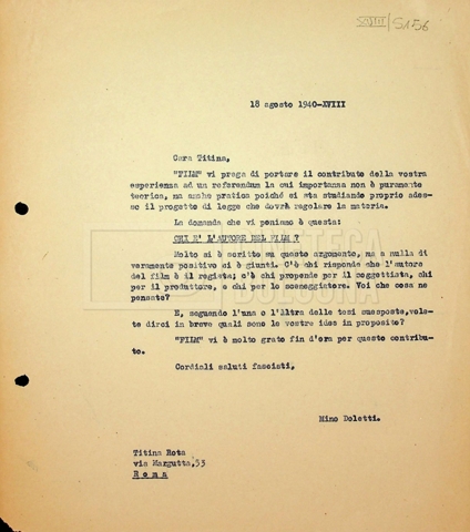 Torna alla banca dati Da Mino Doletti a Titina Rota Unità archivistica Archivio Mino Doletti / Dagli esordi alla caduta del fascismo / Corrispondenza generica Informazioni archivistiche Cronologia: 18 agosto 1940 Numero di ordinamento definitivo: 902 Numero di ordinamento provvisorio: 01.915 Descrizione fisica: Fascicolo c. 1 Immagini digitalizzate Unità archivistiche correlate Vai alla banca dati SCHEDA ARCHIVISTICA Da Dante Dini a Mino Doletti SCHEDA ARCHIVISTICA Correzioni di Mino Doletti alla recensione di Bontempelli SCHEDA ARCHIVISTICA Da [Paolo] [Paola] Borboni a Mino Doletti SCHEDA ARCHIVISTICA Da [Nenni Cortolini] a Mino Doletti SCHEDA ARCHIVISTICA Da Mario Calandri a Mino Doletti SCHEDA ARCHIVISTICA Da Ernesto Cellini a Mino Doletti SCHEDA ARCHIVISTICA Da Ferruccio Cerio a Mino Doletti e Paola Ojetti SCHEDA ARCHIVISTICA Da Ennio Cerlesi a Mino Doletti SCHEDA ARCHIVISTICA Da Marco Cesarini a Mino Doletti SCHEDA ARCHIVISTICA Bozza del testo “Cinematografo nemico – Un baby e cento bimbi” da Danilo Chili SCHEDA ARCHIVISTICA Biglietto da visita di Giorgio Chili con appunti manoscritti SCHEDA ARCHIVISTICA Da Ugo De Amicis al presidente della società ‘Nazionalcine’ SCHEDA ARCHIVISTICA “Promemoria per il dottor Doletti, direttore del giornale settimanale ‘Film’” SCHEDA ARCHIVISTICA A Mino Doletti SCHEDA ARCHIVISTICA Da “Panorama” alla redazione di “Film” SCHEDA ARCHIVISTICA Tra Mino Doletti e Tranquillo Fabbri