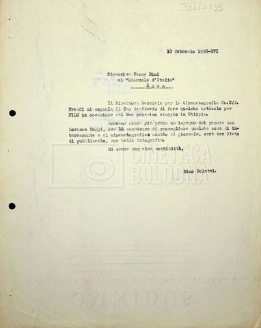 Torna alla banca dati Tra Mino Doletti e Fanny Dini Unità archivistica Archivio Mino Doletti / Dagli esordi alla caduta del fascismo / Corrispondenza generica Informazioni archivistiche Cronologia: 18 febbraio 1938 – 24 febbraio 1938 Numero di ordinamento definitivo: 383 Numero di ordinamento provvisorio: 01.386 Descrizione fisica: fascicolo cc. 2 Immagini digitalizzate Unità archivistiche correlate Vai alla banca dati SCHEDA ARCHIVISTICA Da Dante Dini a Mino Doletti SCHEDA ARCHIVISTICA Correzioni di Mino Doletti alla recensione di Bontempelli SCHEDA ARCHIVISTICA Da [Paolo] [Paola] Borboni a Mino Doletti SCHEDA ARCHIVISTICA Da [Nenni Cortolini] a Mino Doletti SCHEDA ARCHIVISTICA Da Mario Calandri a Mino Doletti SCHEDA ARCHIVISTICA Da Ernesto Cellini a Mino Doletti SCHEDA ARCHIVISTICA Da Ferruccio Cerio a Mino Doletti e Paola Ojetti SCHEDA ARCHIVISTICA Da Ennio Cerlesi a Mino Doletti SCHEDA ARCHIVISTICA Da Marco Cesarini a Mino Doletti SCHEDA ARCHIVISTICA Bozza del testo “Cinematografo nemico – Un baby e cento bimbi” da Danilo Chili SCHEDA ARCHIVISTICA Biglietto da visita di Giorgio Chili con appunti manoscritti SCHEDA ARCHIVISTICA Da Ugo De Amicis al presidente della società ‘Nazionalcine’ SCHEDA ARCHIVISTICA “Promemoria per il dottor Doletti, direttore del giornale settimanale ‘Film’” SCHEDA ARCHIVISTICA A Mino Doletti SCHEDA ARCHIVISTICA Da “Panorama” alla redazione di “Film” SCHEDA ARCHIVISTICA Tra Mino Doletti e Tranquillo Fabbri