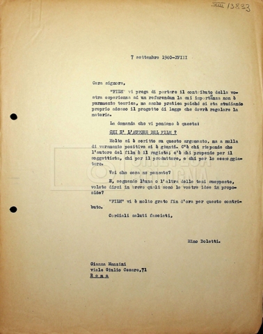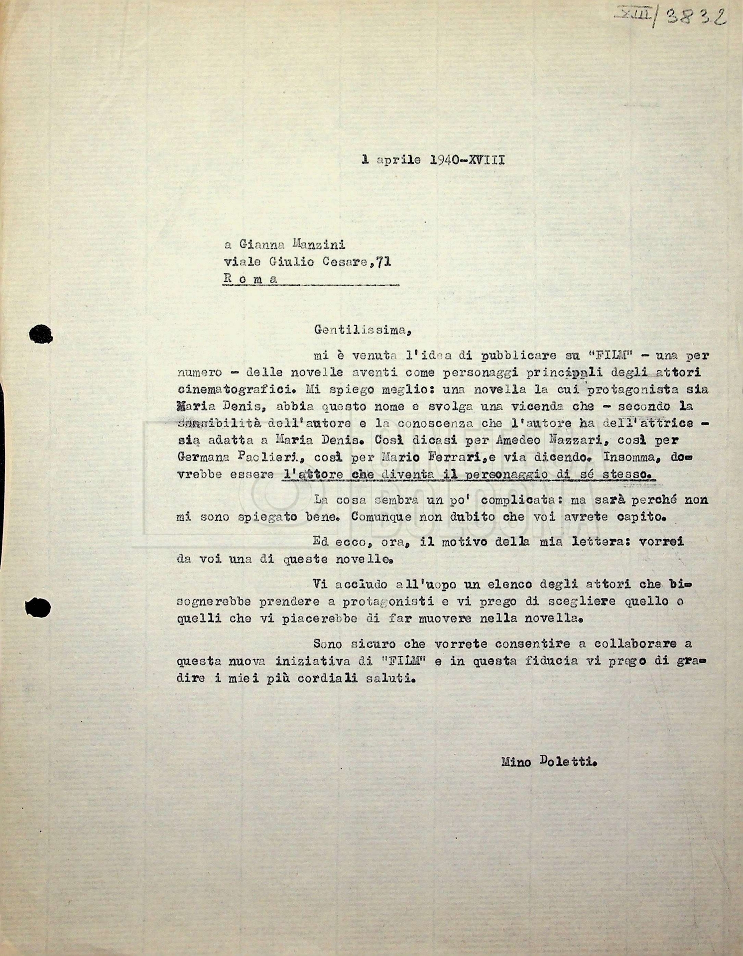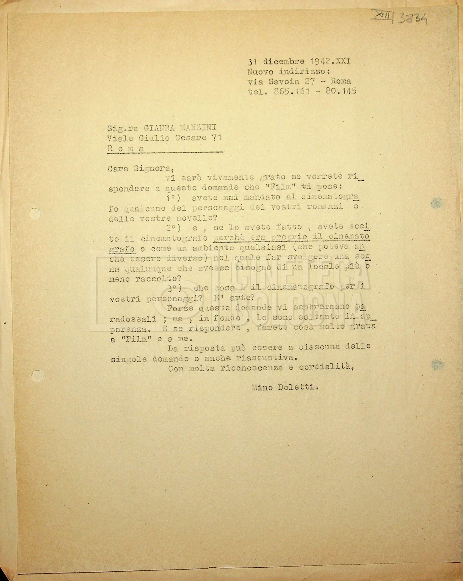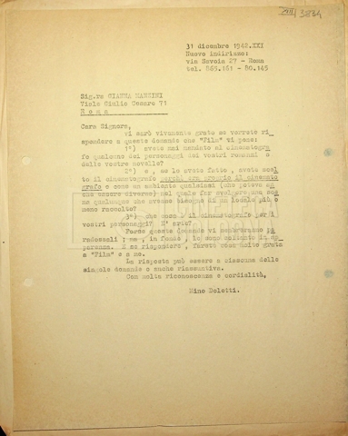 Torna alla banca dati Tra Mino Doletti e Gianna Manzini Unità archivistica Archivio Mino Doletti / Dagli esordi alla caduta del fascismo / Corrispondenza generica Informazioni archivistiche Cronologia: 01 aprile 1940 – 31 dicembre 1942 Numero di ordinamento definitivo: 659 Numero di ordinamento provvisorio: 01.663 Descrizione fisica: Fascicolo cc. 3 Immagini digitalizzate Unità archivistiche correlate Vai alla banca dati SCHEDA ARCHIVISTICA Da Dante Dini a Mino Doletti SCHEDA ARCHIVISTICA Correzioni di Mino Doletti alla recensione di Bontempelli SCHEDA ARCHIVISTICA Da [Paolo] [Paola] Borboni a Mino Doletti SCHEDA ARCHIVISTICA Da [Nenni Cortolini] a Mino Doletti SCHEDA ARCHIVISTICA Da Mario Calandri a Mino Doletti SCHEDA ARCHIVISTICA Da Ernesto Cellini a Mino Doletti SCHEDA ARCHIVISTICA Da Ferruccio Cerio a Mino Doletti e Paola Ojetti SCHEDA ARCHIVISTICA Da Ennio Cerlesi a Mino Doletti SCHEDA ARCHIVISTICA Da Marco Cesarini a Mino Doletti SCHEDA ARCHIVISTICA Bozza del testo “Cinematografo nemico – Un baby e cento bimbi” da Danilo Chili SCHEDA ARCHIVISTICA Biglietto da visita di Giorgio Chili con appunti manoscritti SCHEDA ARCHIVISTICA Da Ugo De Amicis al presidente della società ‘Nazionalcine’ SCHEDA ARCHIVISTICA “Promemoria per il dottor Doletti, direttore del giornale settimanale ‘Film’” SCHEDA ARCHIVISTICA A Mino Doletti SCHEDA ARCHIVISTICA Da “Panorama” alla redazione di “Film” SCHEDA ARCHIVISTICA Tra Mino Doletti e Tranquillo Fabbri