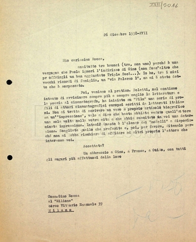Torna alla banca dati Tra Mino Doletti e Gino Rocca Unità archivistica Archivio Mino Doletti / Dagli esordi alla caduta del fascismo / Corrispondenza generica Informazioni archivistiche Cronologia: 04 maggio 1938 – 16 marzo 1942 Numero di ordinamento definitivo: 878 Numero di ordinamento provvisorio: 01.890 Descrizione fisica: Fascicolo cc. 5 Immagini digitalizzate Unità archivistiche correlate Vai alla banca dati SCHEDA ARCHIVISTICA Da Dante Dini a Mino Doletti SCHEDA ARCHIVISTICA Correzioni di Mino Doletti alla recensione di Bontempelli SCHEDA ARCHIVISTICA Da [Paolo] [Paola] Borboni a Mino Doletti SCHEDA ARCHIVISTICA Da [Nenni Cortolini] a Mino Doletti SCHEDA ARCHIVISTICA Da Mario Calandri a Mino Doletti SCHEDA ARCHIVISTICA Da Ernesto Cellini a Mino Doletti SCHEDA ARCHIVISTICA Da Ferruccio Cerio a Mino Doletti e Paola Ojetti SCHEDA ARCHIVISTICA Da Ennio Cerlesi a Mino Doletti SCHEDA ARCHIVISTICA Da Marco Cesarini a Mino Doletti SCHEDA ARCHIVISTICA Bozza del testo “Cinematografo nemico – Un baby e cento bimbi” da Danilo Chili SCHEDA ARCHIVISTICA Biglietto da visita di Giorgio Chili con appunti manoscritti SCHEDA ARCHIVISTICA Da Ugo De Amicis al presidente della società ‘Nazionalcine’ SCHEDA ARCHIVISTICA “Promemoria per il dottor Doletti, direttore del giornale settimanale ‘Film’” SCHEDA ARCHIVISTICA A Mino Doletti SCHEDA ARCHIVISTICA Da “Panorama” alla redazione di “Film” SCHEDA ARCHIVISTICA Tra Mino Doletti e Tranquillo Fabbri