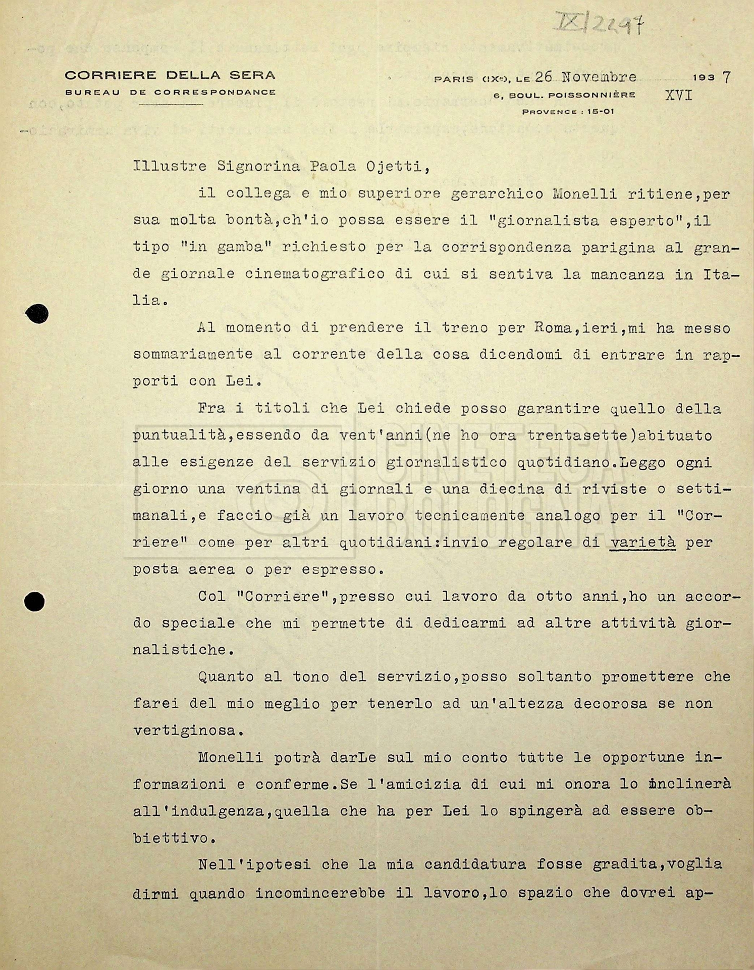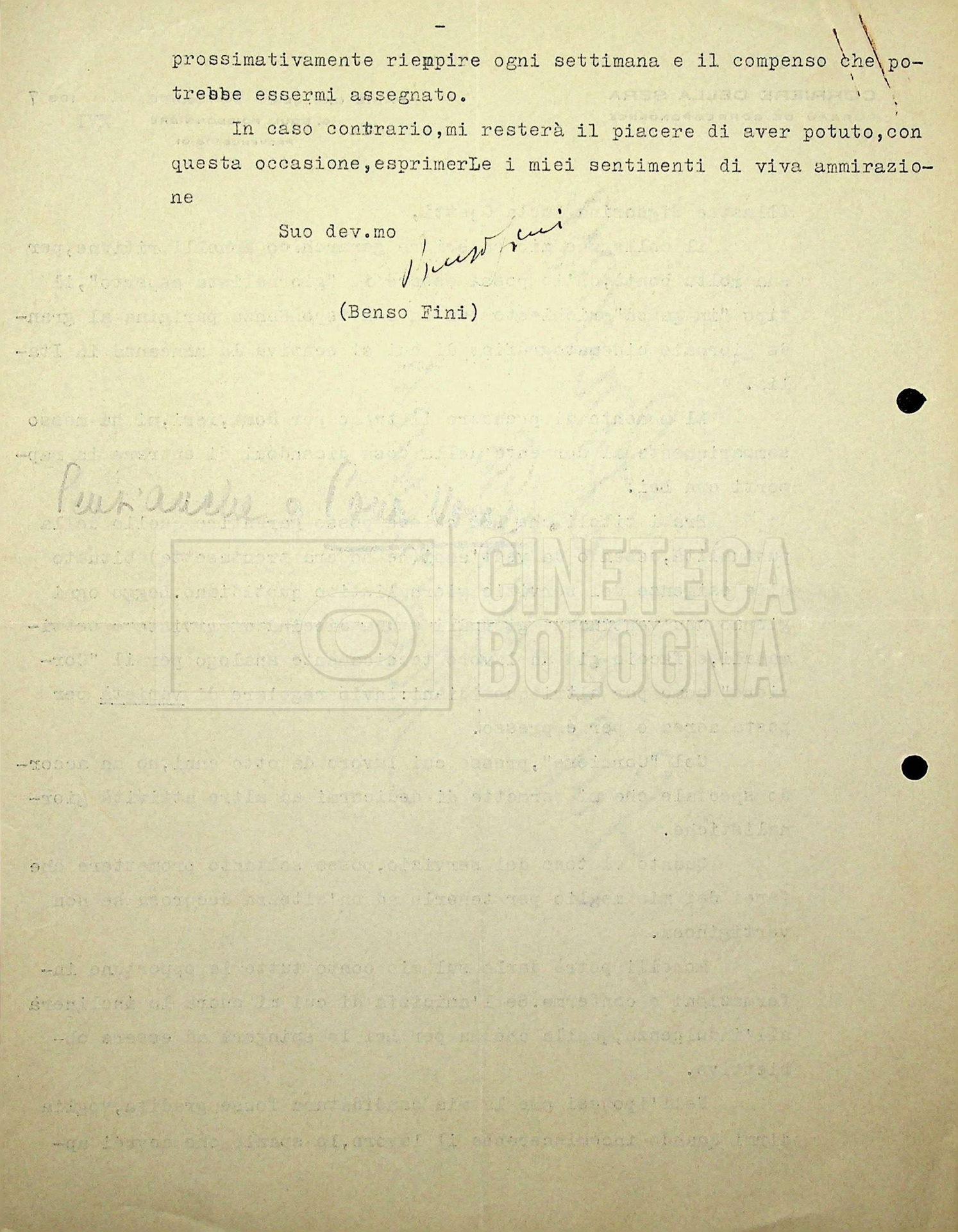 Si segnala corrispondenza tra la redazione di “Film”, gli editori della rivista “Film”, ovvero la casa editrice di Roma ‘Tumminelli & Co.’, e la ‘Banca d’Italia’ riguardante i pagamenti da corrispondere a Benso Fini (14 gennaio – 31 dicembre 1938).