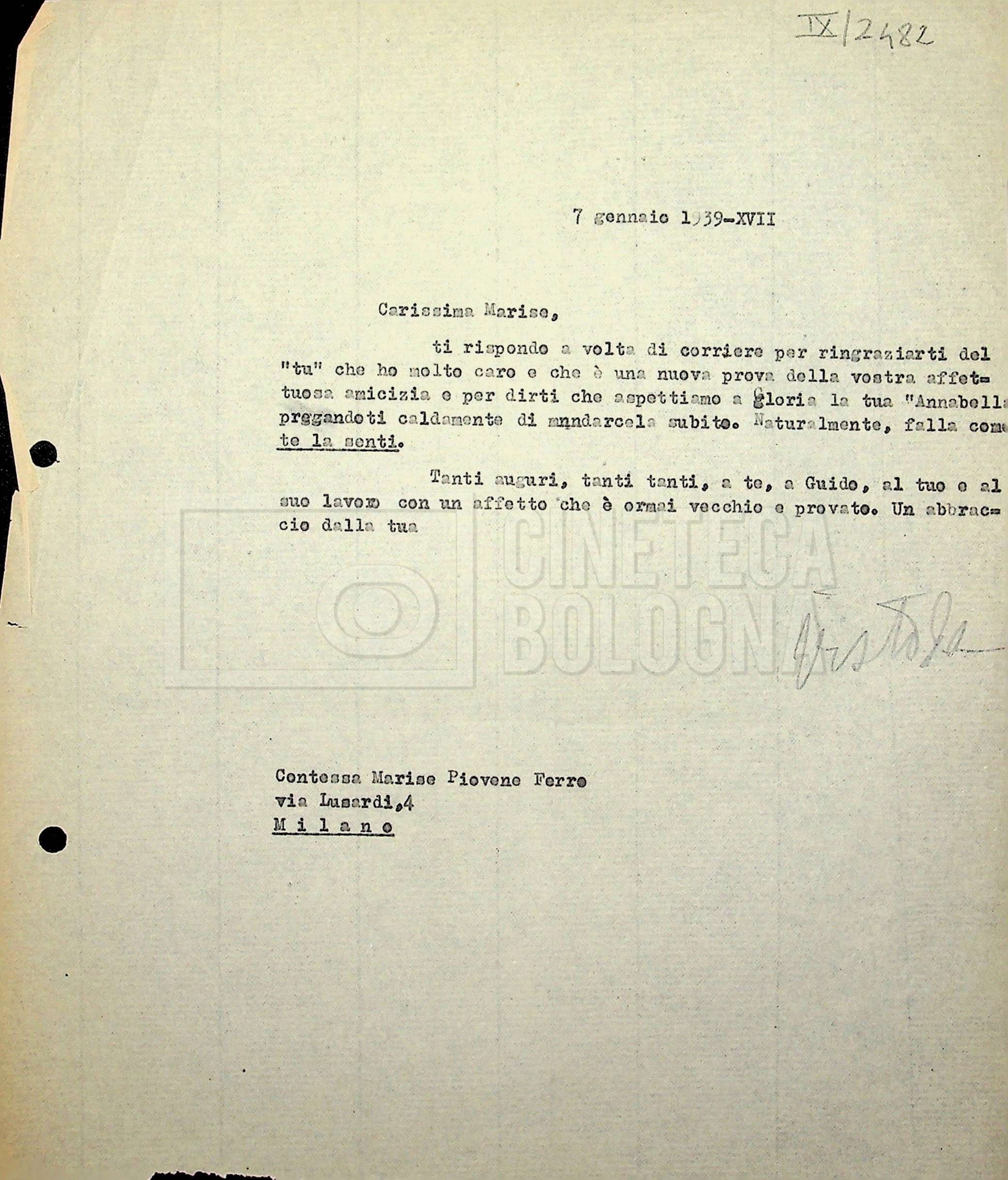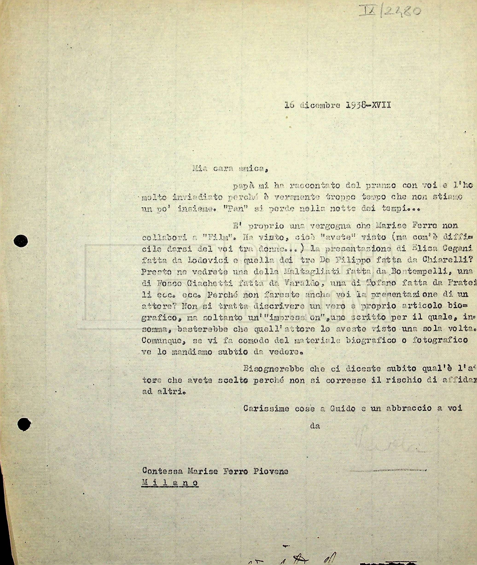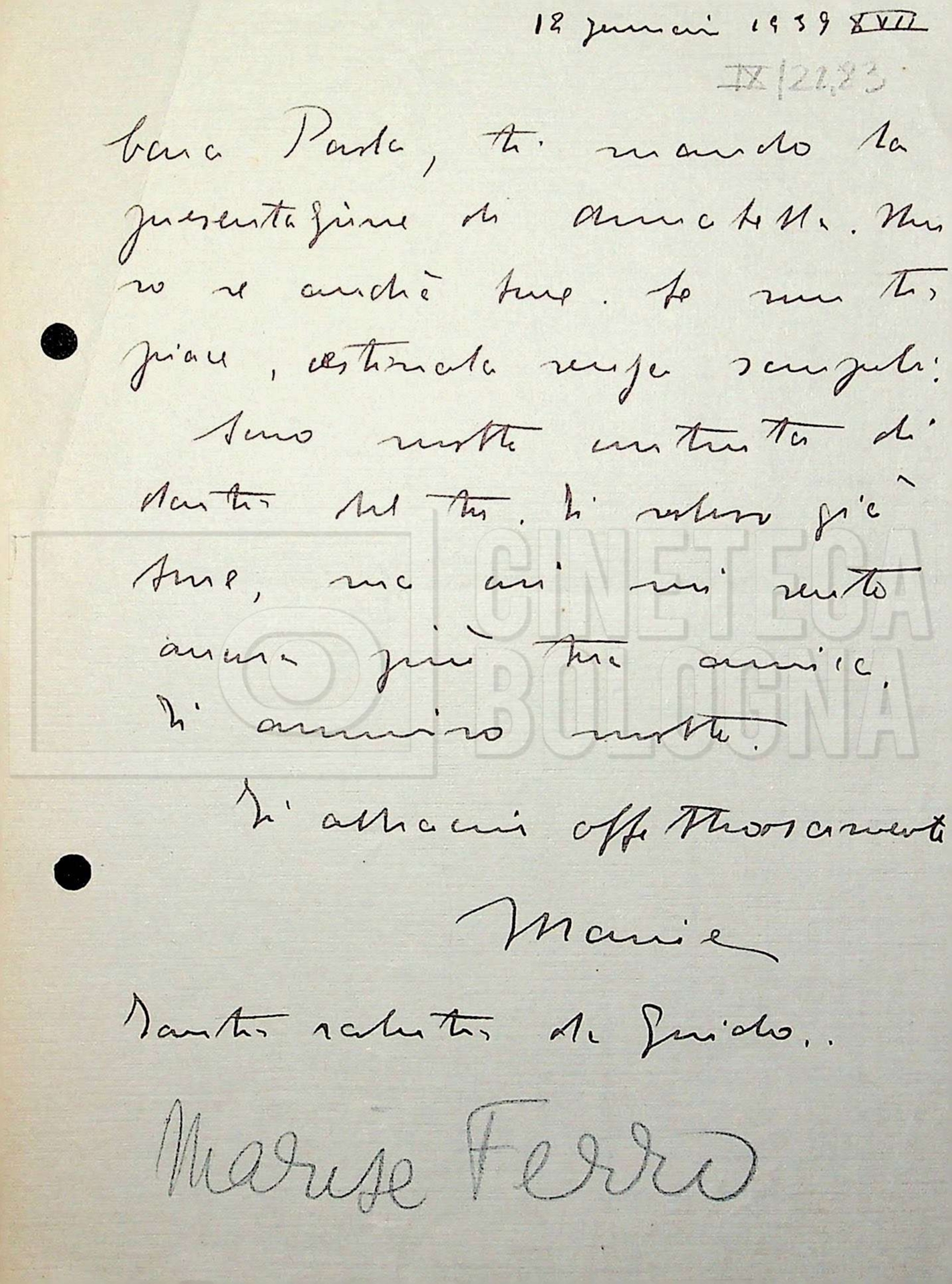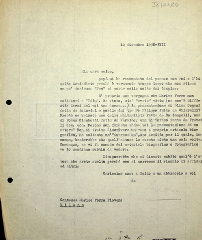 Torna alla banca dati Tra Mino Doletti, Paola Ojetti e Marise Piovene Ferro Unità archivistica Archivio Mino Doletti / Dagli esordi alla caduta del fascismo / Corrispondenza generica Informazioni archivistiche Cronologia: 21 aprile 1938 – 28 dicembre 1942 Numero di ordinamento definitivo: 446 Numero di ordinamento provvisorio: 01.450 Descrizione fisica: Fascicolo cc. 13 Immagini digitalizzate Unità archivistiche correlate Vai alla banca dati SCHEDA ARCHIVISTICA Da Dante Dini a Mino Doletti SCHEDA ARCHIVISTICA Correzioni di Mino Doletti alla recensione di Bontempelli SCHEDA ARCHIVISTICA Da [Paolo] [Paola] Borboni a Mino Doletti SCHEDA ARCHIVISTICA Da [Nenni Cortolini] a Mino Doletti SCHEDA ARCHIVISTICA Da Mario Calandri a Mino Doletti SCHEDA ARCHIVISTICA Da Ernesto Cellini a Mino Doletti SCHEDA ARCHIVISTICA Da Ferruccio Cerio a Mino Doletti e Paola Ojetti SCHEDA ARCHIVISTICA Da Ennio Cerlesi a Mino Doletti SCHEDA ARCHIVISTICA Da Marco Cesarini a Mino Doletti SCHEDA ARCHIVISTICA Bozza del testo “Cinematografo nemico – Un baby e cento bimbi” da Danilo Chili SCHEDA ARCHIVISTICA Biglietto da visita di Giorgio Chili con appunti manoscritti SCHEDA ARCHIVISTICA Da Ugo De Amicis al presidente della società ‘Nazionalcine’ SCHEDA ARCHIVISTICA “Promemoria per il dottor Doletti, direttore del giornale settimanale ‘Film’” SCHEDA ARCHIVISTICA A Mino Doletti SCHEDA ARCHIVISTICA Da “Panorama” alla redazione di “Film” SCHEDA ARCHIVISTICA Tra Mino Doletti e Tranquillo Fabbri