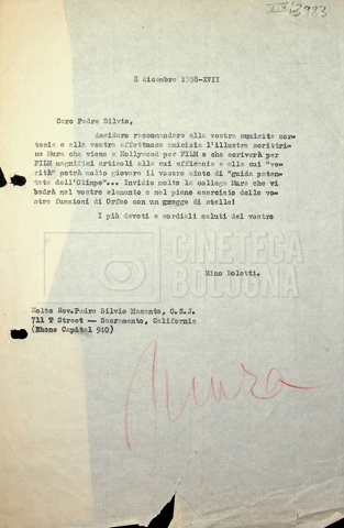 Torna alla banca dati Tra Mino Doletti, Paola Ojetti e padre Silvio Masante Unità archivistica Archivio Mino Doletti / Dagli esordi alla caduta del fascismo / Corrispondenza generica Informazioni archivistiche Cronologia: 05 ottobre 1938 – 24 gennaio 1939 Numero di ordinamento definitivo: 688 Numero di ordinamento provvisorio: 01.694 Descrizione fisica: fascicolo cc. 6 Immagini digitalizzate Unità archivistiche correlate Vai alla banca dati SCHEDA ARCHIVISTICA Da Dante Dini a Mino Doletti SCHEDA ARCHIVISTICA Correzioni di Mino Doletti alla recensione di Bontempelli SCHEDA ARCHIVISTICA Da [Paolo] [Paola] Borboni a Mino Doletti SCHEDA ARCHIVISTICA Da [Nenni Cortolini] a Mino Doletti SCHEDA ARCHIVISTICA Da Mario Calandri a Mino Doletti SCHEDA ARCHIVISTICA Da Ernesto Cellini a Mino Doletti SCHEDA ARCHIVISTICA Da Ferruccio Cerio a Mino Doletti e Paola Ojetti SCHEDA ARCHIVISTICA Da Ennio Cerlesi a Mino Doletti SCHEDA ARCHIVISTICA Da Marco Cesarini a Mino Doletti SCHEDA ARCHIVISTICA Bozza del testo “Cinematografo nemico – Un baby e cento bimbi” da Danilo Chili SCHEDA ARCHIVISTICA Biglietto da visita di Giorgio Chili con appunti manoscritti SCHEDA ARCHIVISTICA Da Ugo De Amicis al presidente della società ‘Nazionalcine’ SCHEDA ARCHIVISTICA “Promemoria per il dottor Doletti, direttore del giornale settimanale ‘Film’” SCHEDA ARCHIVISTICA A Mino Doletti SCHEDA ARCHIVISTICA Da “Panorama” alla redazione di “Film” SCHEDA ARCHIVISTICA Tra Mino Doletti e Tranquillo Fabbri