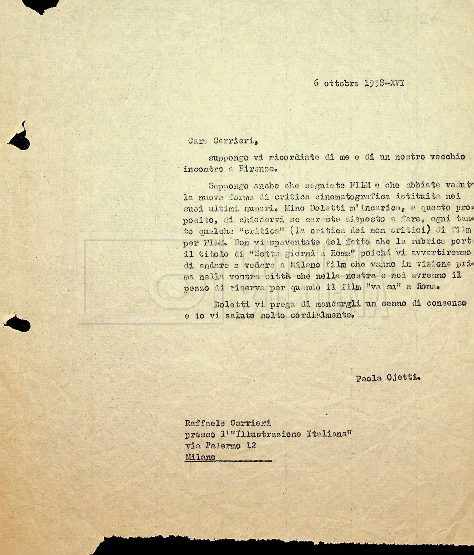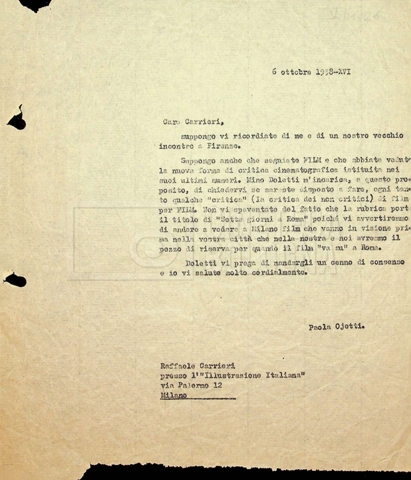 Torna alla banca dati Tra Mino Doletti, Paola Ojetti e Raffaele Carrieri Unità archivistica Archivio Mino Doletti / Dagli esordi alla caduta del fascismo / Corrispondenza generica Informazioni archivistiche Cronologia: 06 novembre 1938 – 28 novembre 1942 Numero di ordinamento definitivo: 200 Numero di ordinamento provvisorio: 01.200 Descrizione fisica: Fascicolo cc. 19 Immagini digitalizzate Unità archivistiche correlate Vai alla banca dati SCHEDA ARCHIVISTICA Da Dante Dini a Mino Doletti SCHEDA ARCHIVISTICA Correzioni di Mino Doletti alla recensione di Bontempelli SCHEDA ARCHIVISTICA Da [Paolo] [Paola] Borboni a Mino Doletti SCHEDA ARCHIVISTICA Da [Nenni Cortolini] a Mino Doletti SCHEDA ARCHIVISTICA Da Mario Calandri a Mino Doletti SCHEDA ARCHIVISTICA Da Ernesto Cellini a Mino Doletti SCHEDA ARCHIVISTICA Da Ferruccio Cerio a Mino Doletti e Paola Ojetti SCHEDA ARCHIVISTICA Da Ennio Cerlesi a Mino Doletti SCHEDA ARCHIVISTICA Da Marco Cesarini a Mino Doletti SCHEDA ARCHIVISTICA Bozza del testo “Cinematografo nemico – Un baby e cento bimbi” da Danilo Chili SCHEDA ARCHIVISTICA Biglietto da visita di Giorgio Chili con appunti manoscritti SCHEDA ARCHIVISTICA Da Ugo De Amicis al presidente della società ‘Nazionalcine’ SCHEDA ARCHIVISTICA “Promemoria per il dottor Doletti, direttore del giornale settimanale ‘Film’” SCHEDA ARCHIVISTICA A Mino Doletti SCHEDA ARCHIVISTICA Da “Panorama” alla redazione di “Film” SCHEDA ARCHIVISTICA Tra Mino Doletti e Tranquillo Fabbri