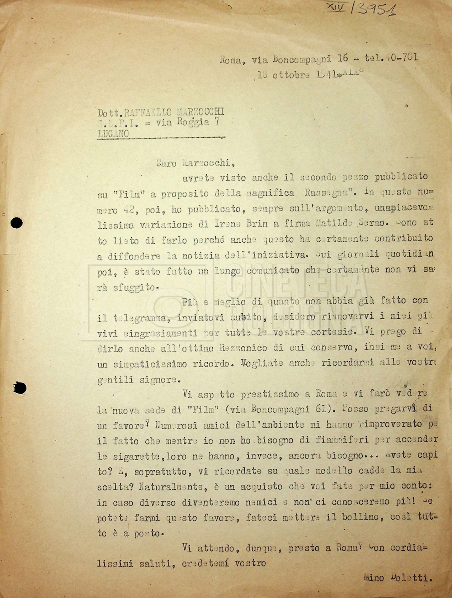 Torna alla banca dati Tra Mino Doletti, Renato Marzocchi e Raffaello Marzocchi Unità archivistica Archivio Mino Doletti / Dagli esordi alla caduta del fascismo / Corrispondenza generica Informazioni archivistiche Cronologia: 01 ottobre 1941 – 19 maggio 1943 Numero di ordinamento definitivo: 686 Numero di ordinamento provvisorio: 01.692 Descrizione fisica: fascicolo cc. 38 Immagini digitalizzate Unità archivistiche correlate Vai alla banca dati SCHEDA ARCHIVISTICA Da Dante Dini a Mino Doletti SCHEDA ARCHIVISTICA Correzioni di Mino Doletti alla recensione di Bontempelli SCHEDA ARCHIVISTICA Da [Paolo] [Paola] Borboni a Mino Doletti SCHEDA ARCHIVISTICA Da [Nenni Cortolini] a Mino Doletti SCHEDA ARCHIVISTICA Da Mario Calandri a Mino Doletti SCHEDA ARCHIVISTICA Da Ernesto Cellini a Mino Doletti SCHEDA ARCHIVISTICA Da Ferruccio Cerio a Mino Doletti e Paola Ojetti SCHEDA ARCHIVISTICA Da Ennio Cerlesi a Mino Doletti SCHEDA ARCHIVISTICA Da Marco Cesarini a Mino Doletti SCHEDA ARCHIVISTICA Bozza del testo “Cinematografo nemico – Un baby e cento bimbi” da Danilo Chili SCHEDA ARCHIVISTICA Biglietto da visita di Giorgio Chili con appunti manoscritti SCHEDA ARCHIVISTICA Da Ugo De Amicis al presidente della società ‘Nazionalcine’ SCHEDA ARCHIVISTICA “Promemoria per il dottor Doletti, direttore del giornale settimanale ‘Film’” SCHEDA ARCHIVISTICA A Mino Doletti SCHEDA ARCHIVISTICA Da “Panorama” alla redazione di “Film” SCHEDA ARCHIVISTICA Tra Mino Doletti e Tranquillo Fabbri