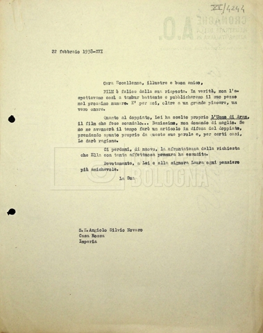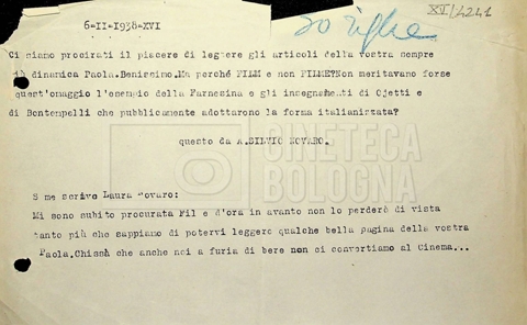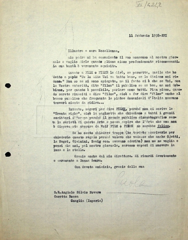 Torna alla banca dati Tra Paola Ojetti e Angiolo Silvio Novaro Unità archivistica Archivio Mino Doletti / Dagli esordi alla caduta del fascismo / Corrispondenza generica Informazioni archivistiche Cronologia: 14 febbraio 1938 – 22 febbraio 1938 [data incerta] Numero di ordinamento definitivo: 739 Numero di ordinamento provvisorio: 01.747 Descrizione fisica: Fascicolo cc. 4 Immagini digitalizzate Unità archivistiche correlate Vai alla banca dati SCHEDA ARCHIVISTICA Da Dante Dini a Mino Doletti SCHEDA ARCHIVISTICA Correzioni di Mino Doletti alla recensione di Bontempelli SCHEDA ARCHIVISTICA Da [Paolo] [Paola] Borboni a Mino Doletti SCHEDA ARCHIVISTICA Da [Nenni Cortolini] a Mino Doletti SCHEDA ARCHIVISTICA Da Mario Calandri a Mino Doletti SCHEDA ARCHIVISTICA Da Ernesto Cellini a Mino Doletti SCHEDA ARCHIVISTICA Da Ferruccio Cerio a Mino Doletti e Paola Ojetti SCHEDA ARCHIVISTICA Da Ennio Cerlesi a Mino Doletti SCHEDA ARCHIVISTICA Da Marco Cesarini a Mino Doletti SCHEDA ARCHIVISTICA Bozza del testo “Cinematografo nemico – Un baby e cento bimbi” da Danilo Chili SCHEDA ARCHIVISTICA Biglietto da visita di Giorgio Chili con appunti manoscritti SCHEDA ARCHIVISTICA Da Ugo De Amicis al presidente della società ‘Nazionalcine’ SCHEDA ARCHIVISTICA “Promemoria per il dottor Doletti, direttore del giornale settimanale ‘Film’” SCHEDA ARCHIVISTICA A Mino Doletti SCHEDA ARCHIVISTICA Da “Panorama” alla redazione di “Film” SCHEDA ARCHIVISTICA Tra Mino Doletti e Tranquillo Fabbri