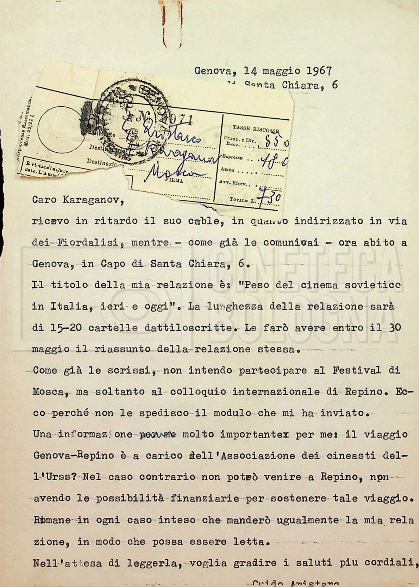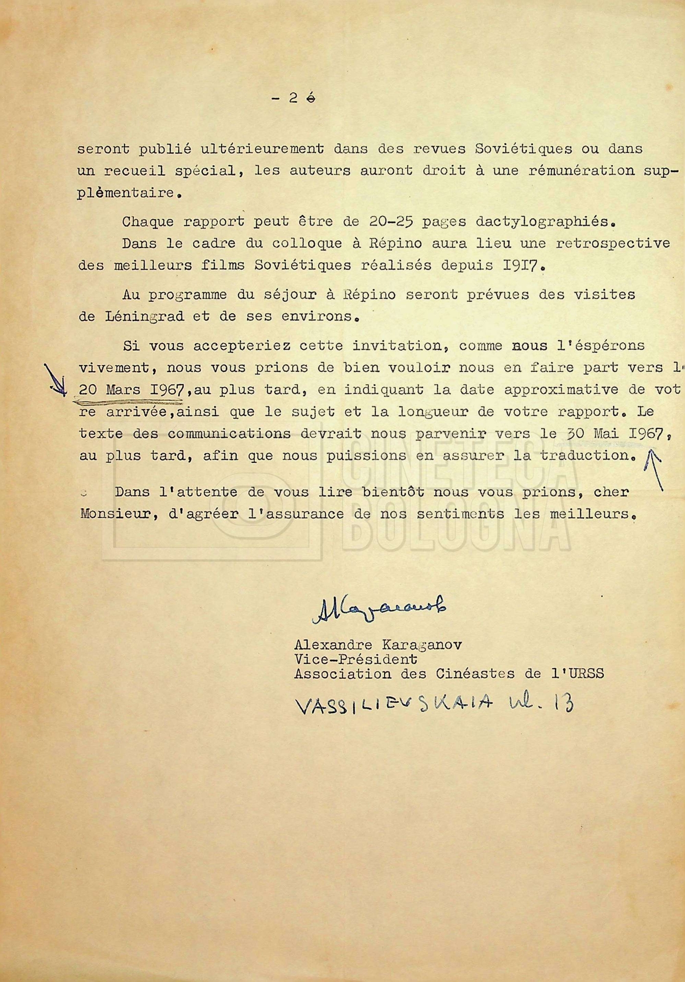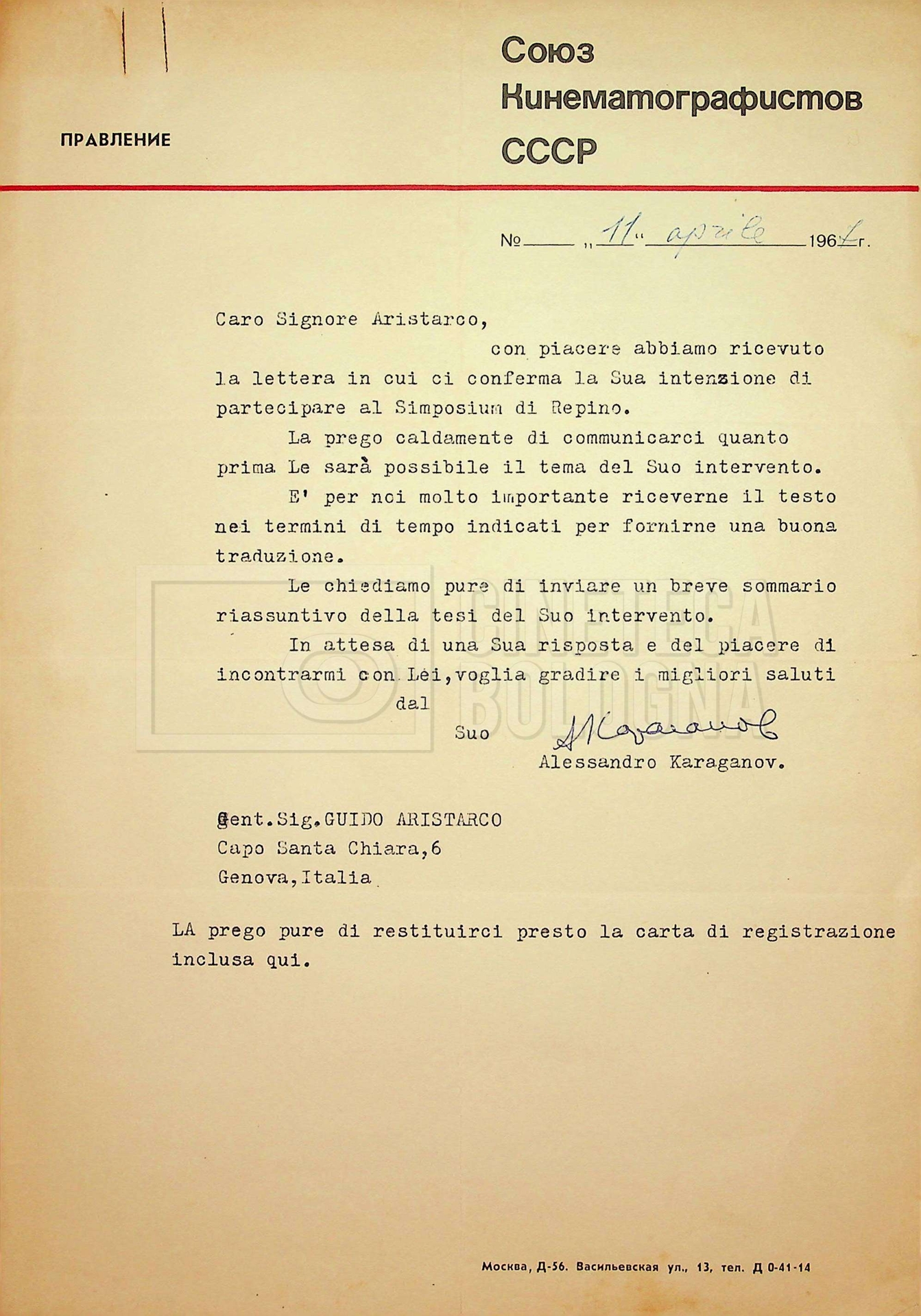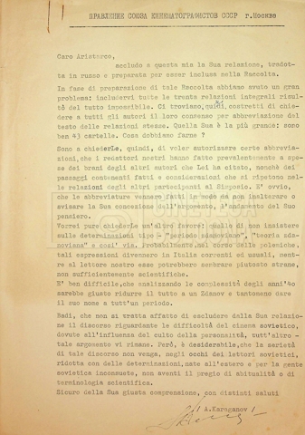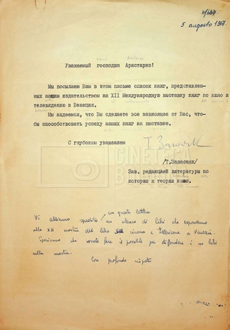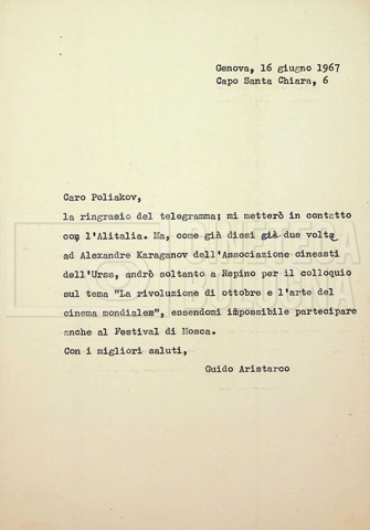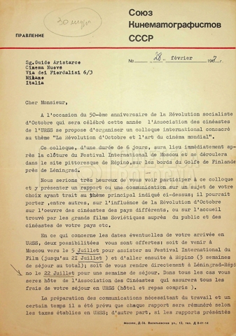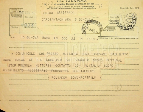 – Corrispondenza in russo e francese tra Guido Aristarco e Alexandre Karaganov circa l’organizzazione del “V International Film Festival” di Mosca, tenuto dal 5 al 20 luglio 1967;