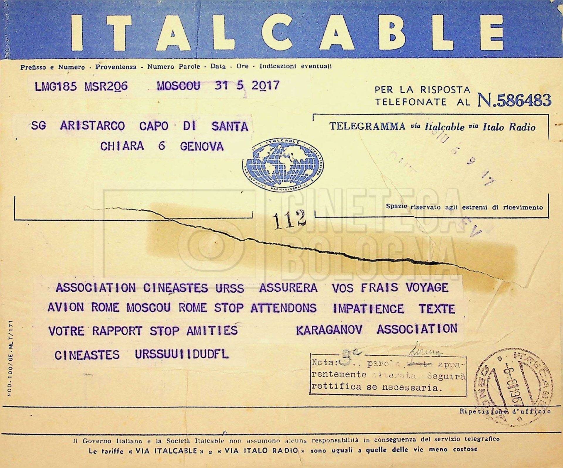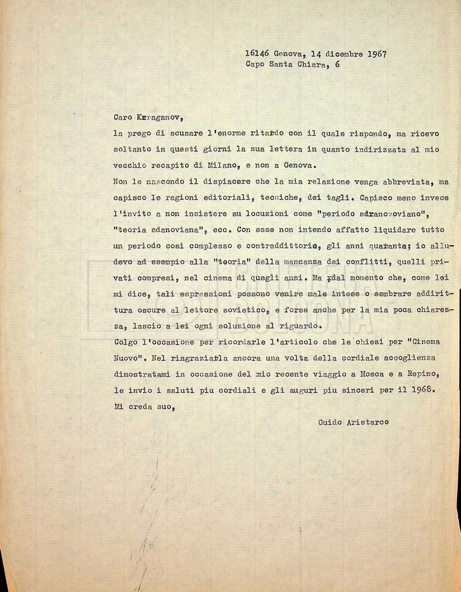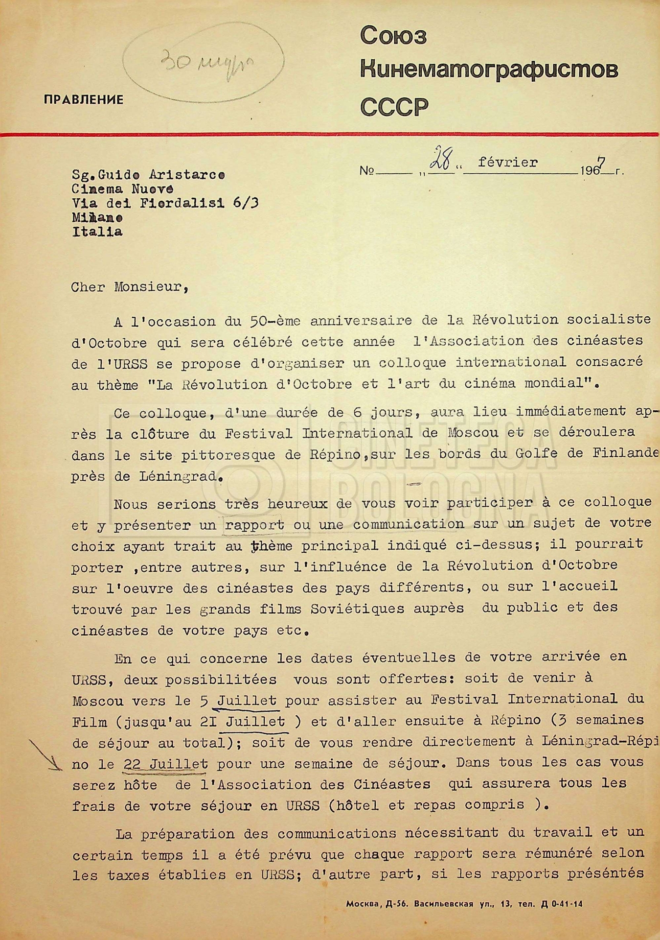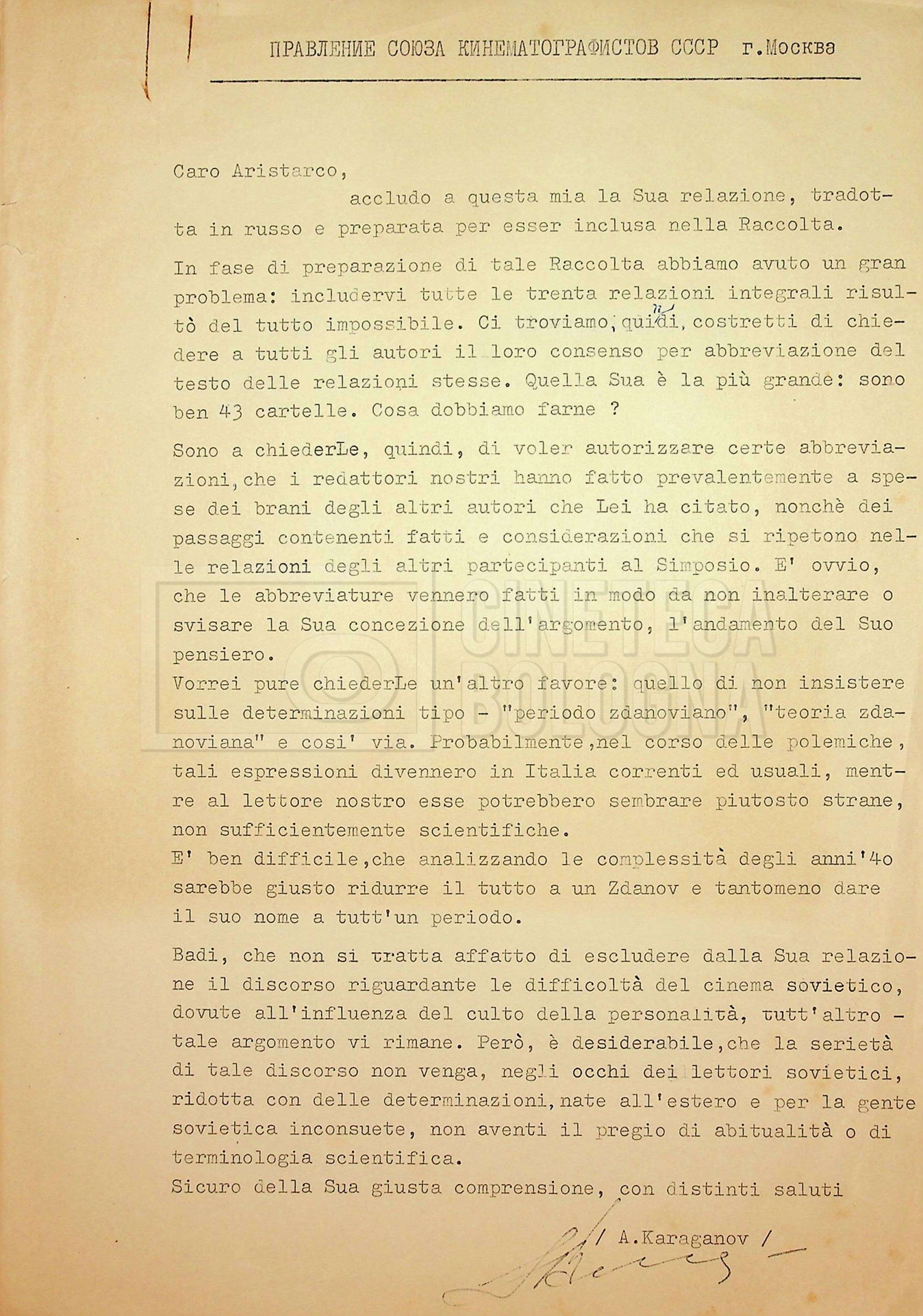 – Corrispondenza in russo e francese tra Guido Aristarco e Alexandre Karaganov circa l’organizzazione del “V International Film Festival” di Mosca, tenuto dal 5 al 20 luglio 1967;