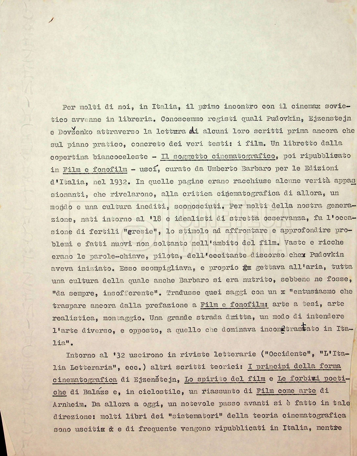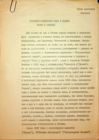 – Telegrammi, minute e copie in italiano e in russo dell’intervento di Guido Aristarco al “Simposio di Repino” sul tema “La rivoluzione di ottobre e l’arte del cinema mondiale”.